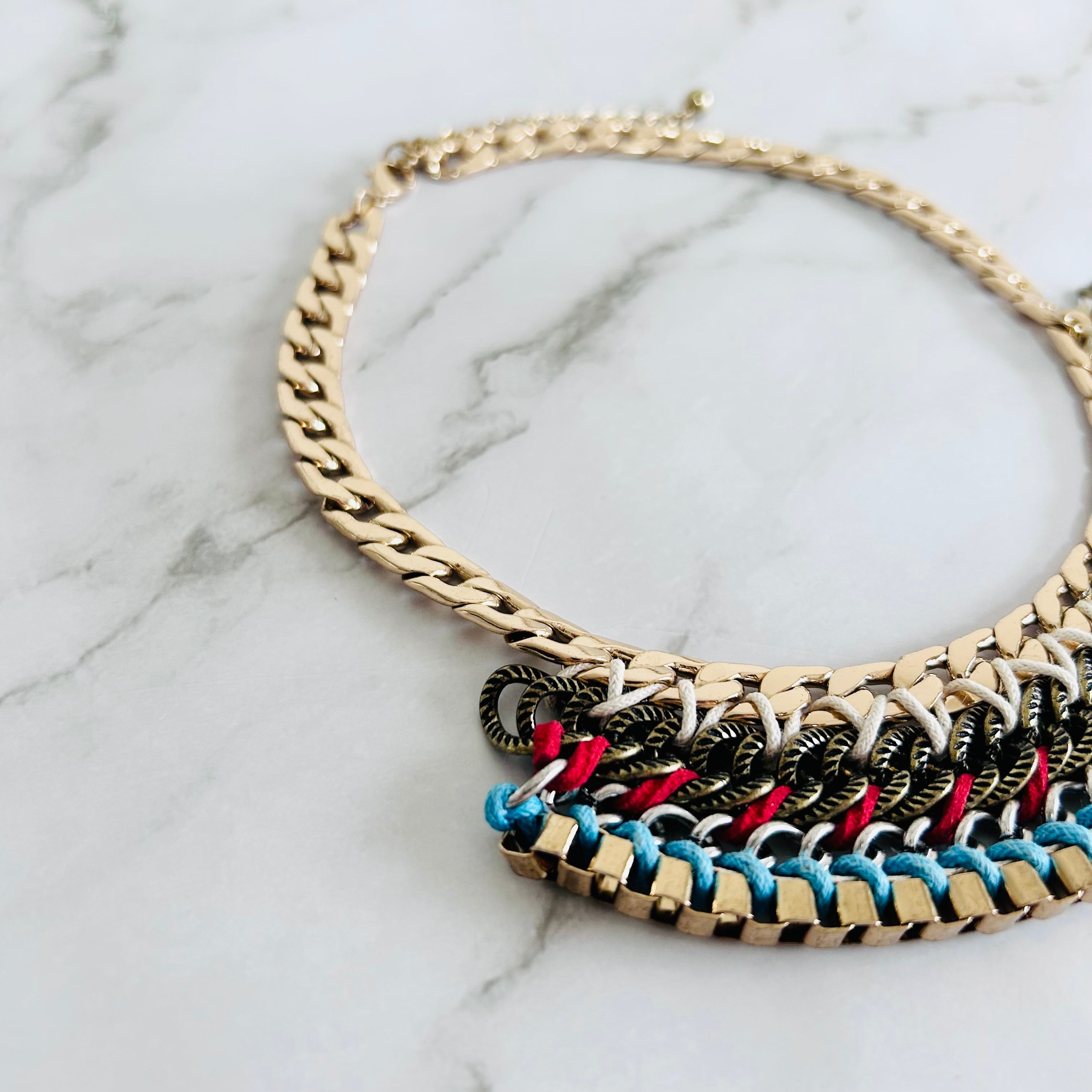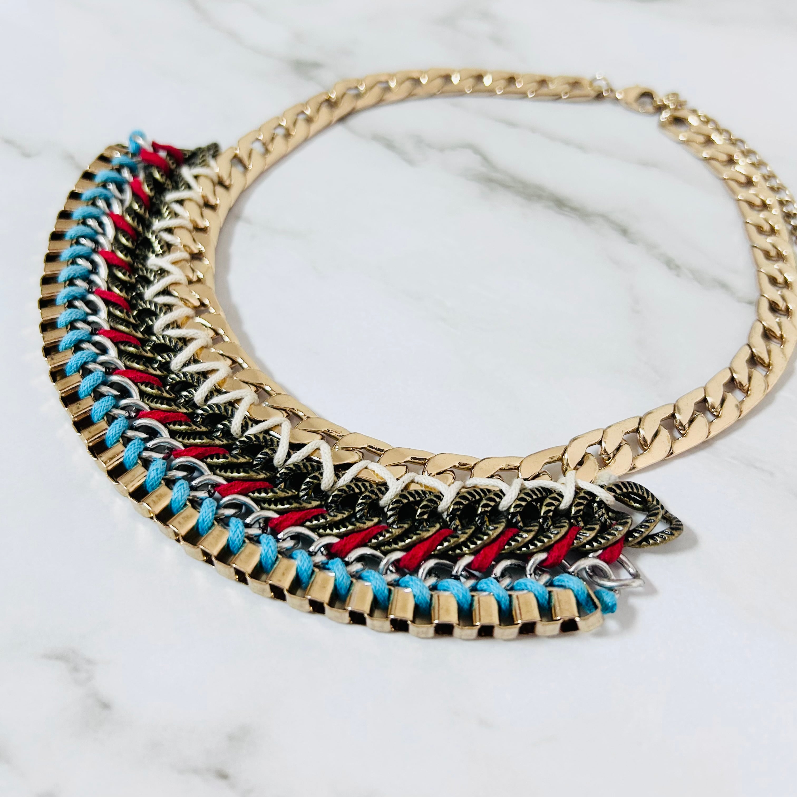 重厚感のあるゴールドチェーンに、ホワイト・レッド・ブルーのコードを大胆に編み込んだモードなネックレスです。