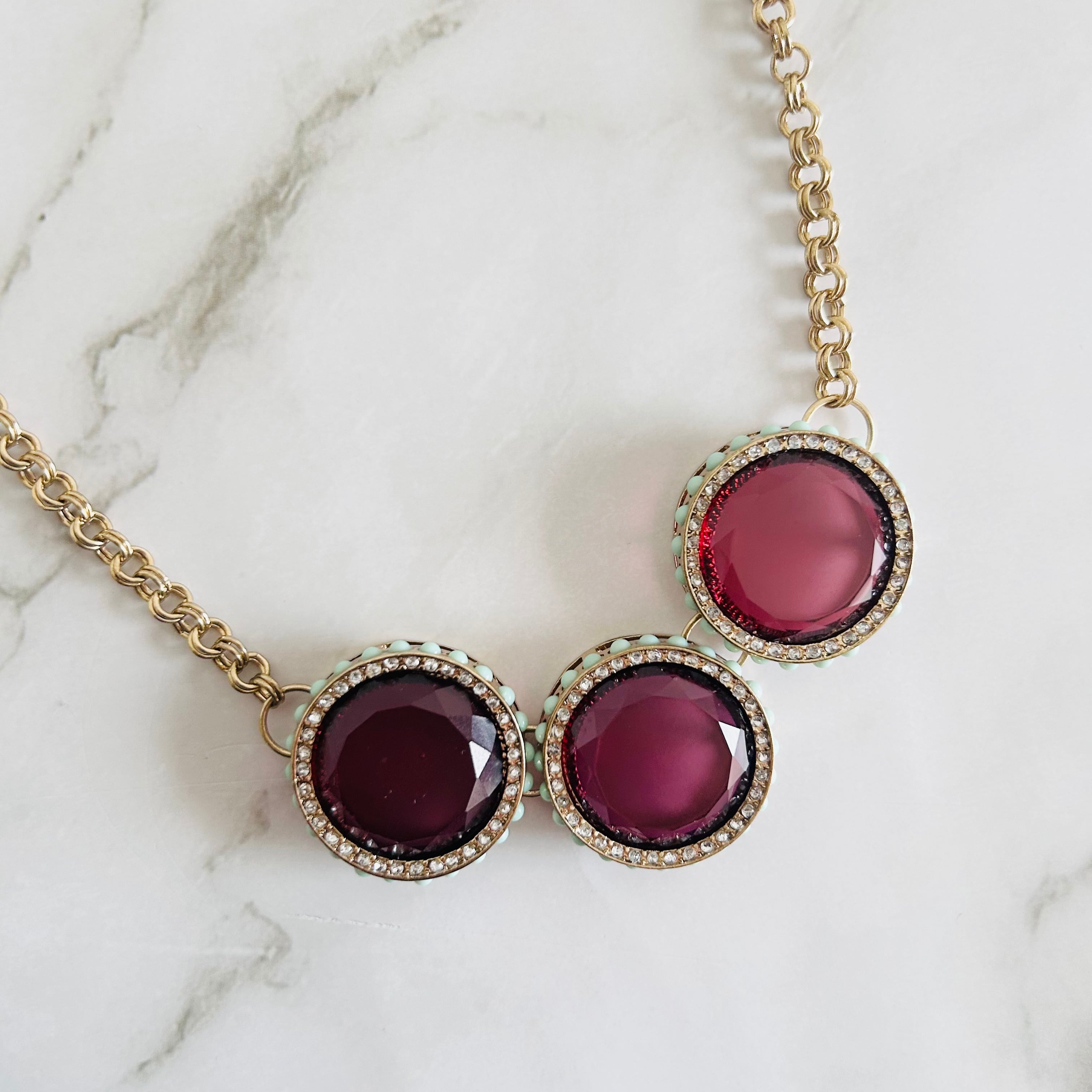 透明感のあるプラムカラーのパーツを3つ連ねた、クラシカルで華やかなネックレス。