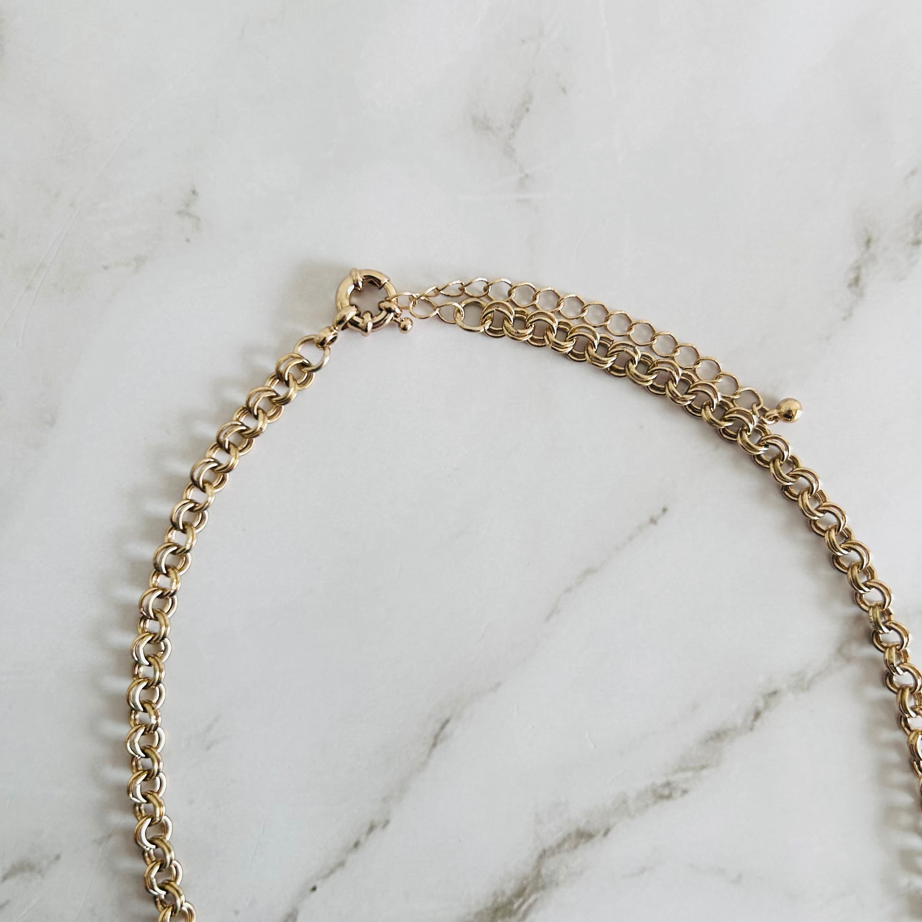大粒パーツを囲む繊細なラインストーンが光を受けて輝き、胸元に上品な艶めきを添えます。