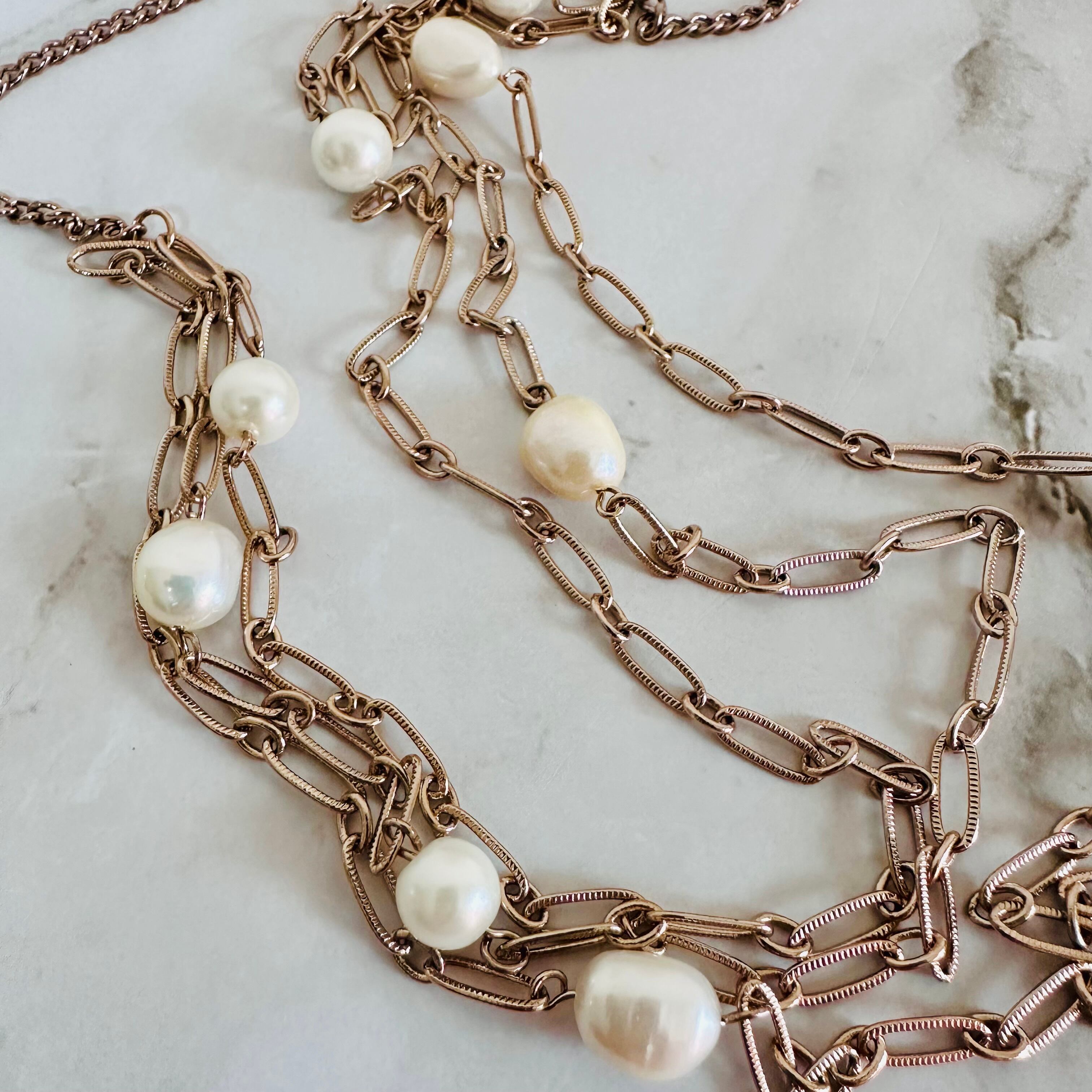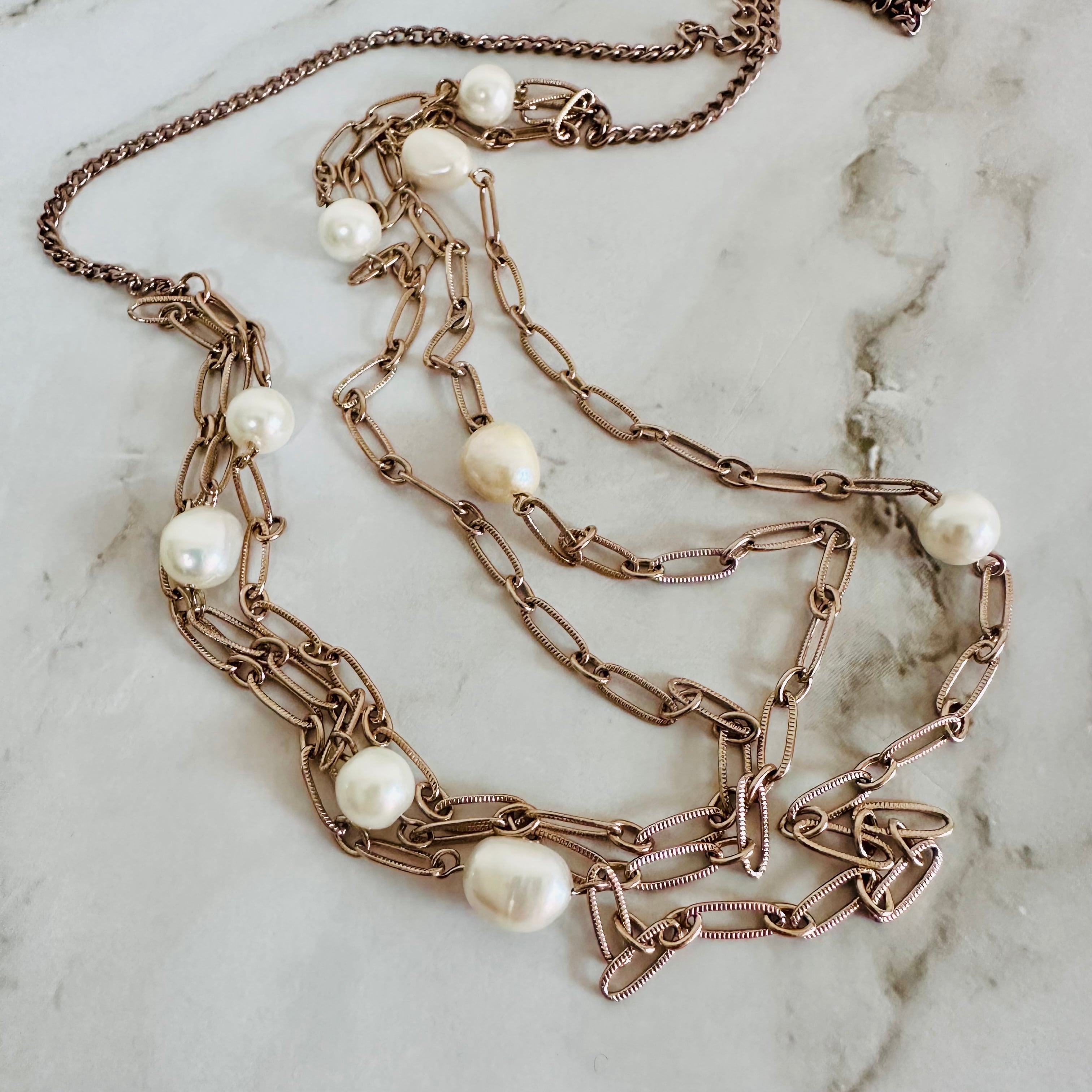 繊細なブロンズゴールドチェーンに、小粒のファッションパールと個性あるフォルムの天然淡水パールをあしらった3連ロングネックレスです。