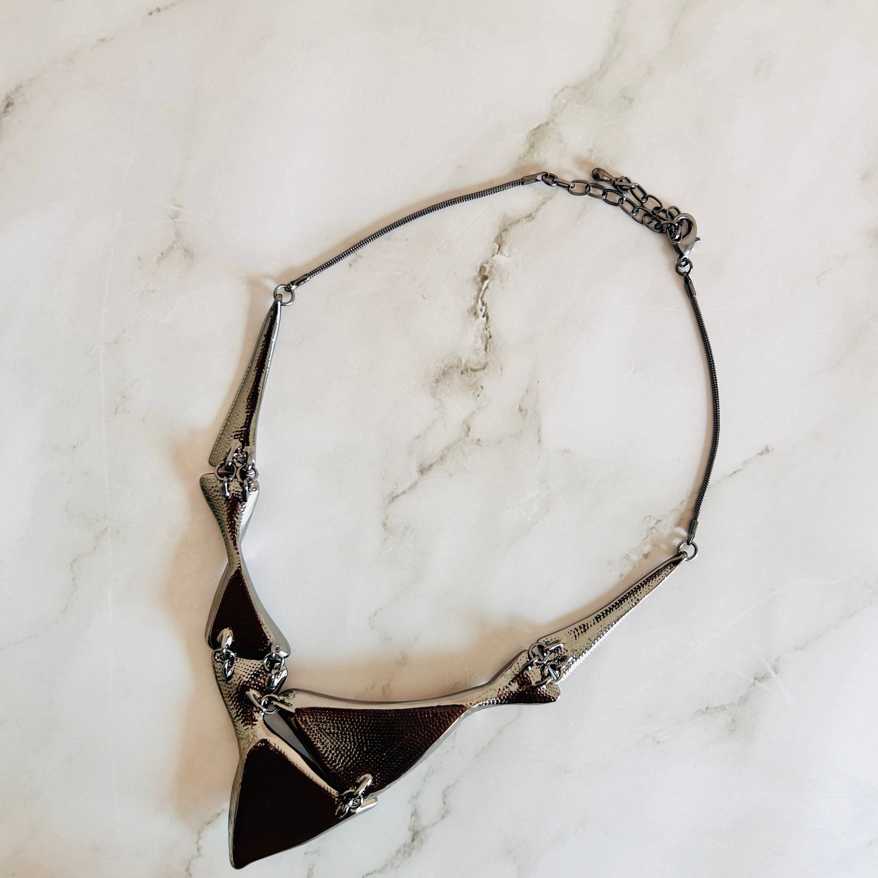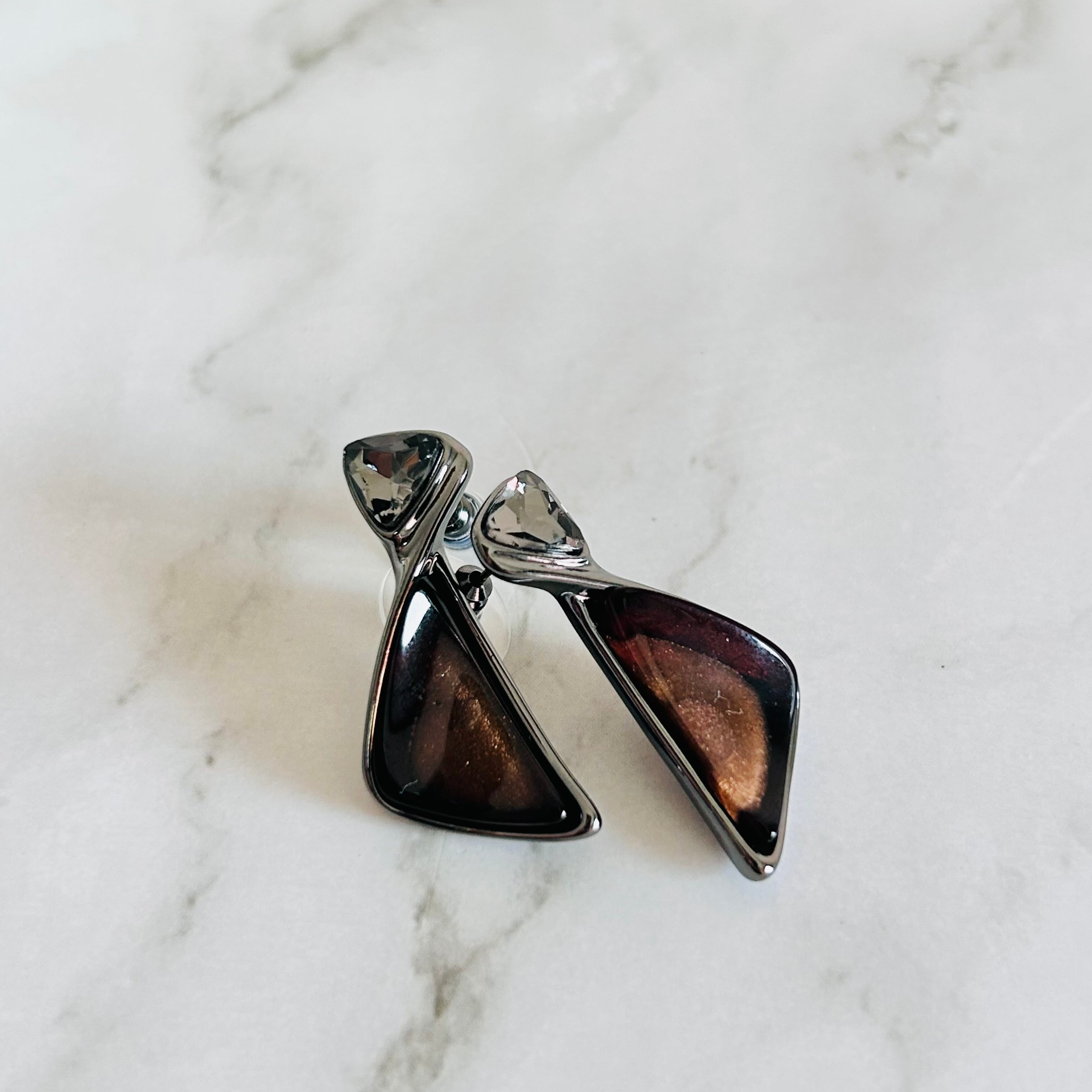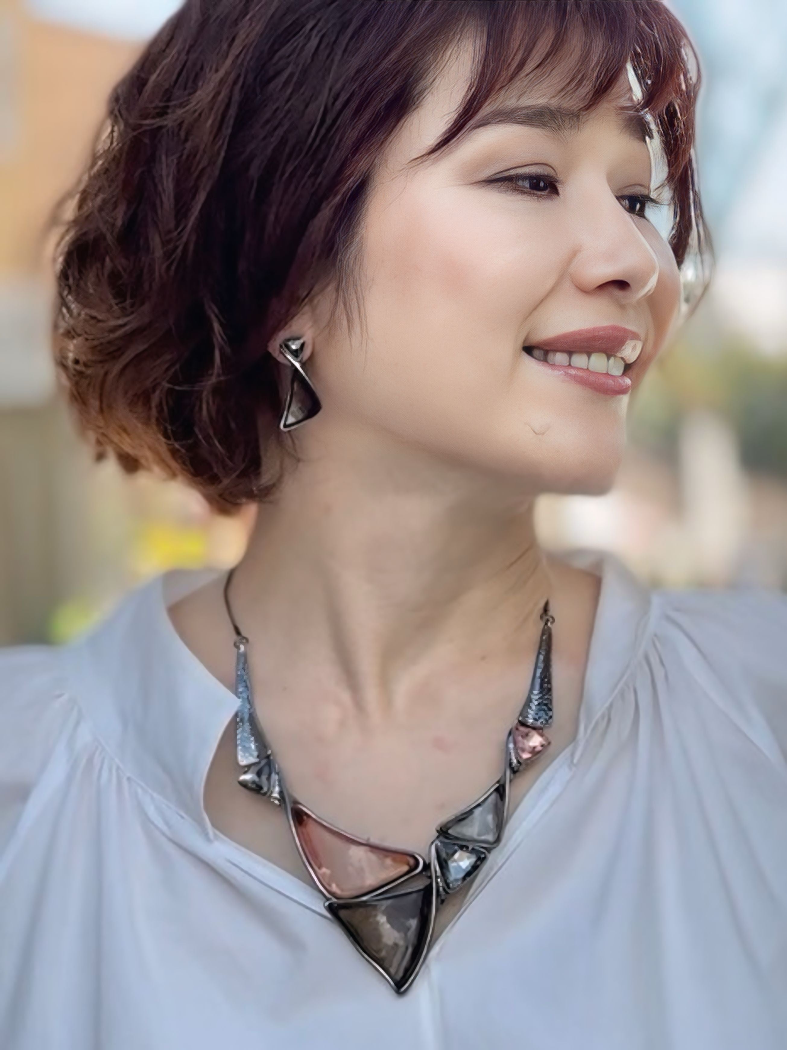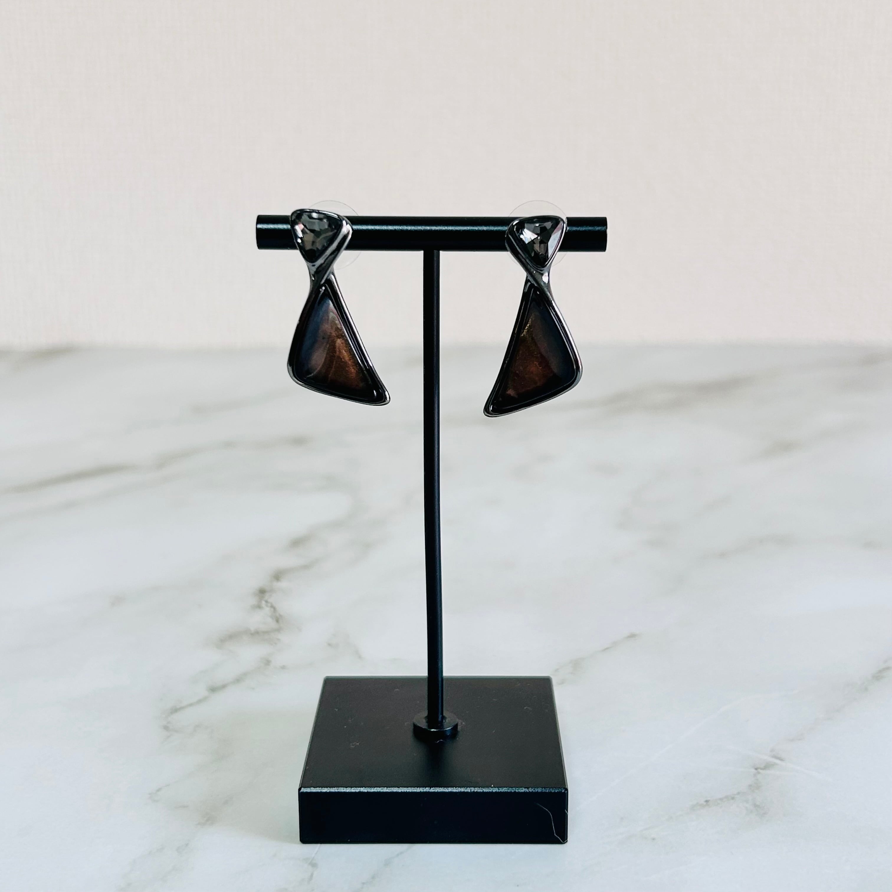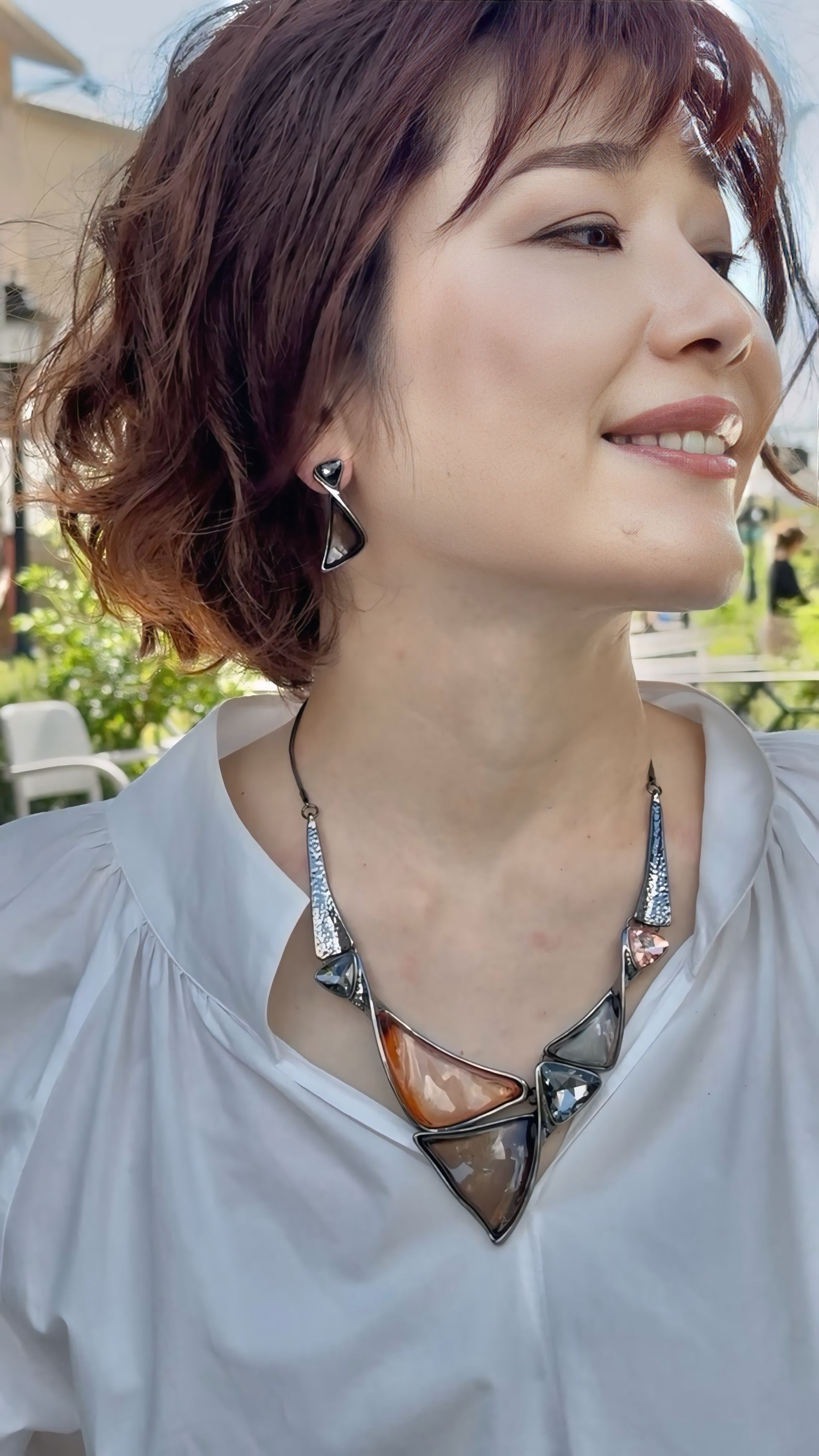 光沢のあるメタリックフレームに、アンバー・ブロンズ・スモーキーグレーなどのニュアンスカラーが美しく重なり合う、モードな印象のネックレス&ピアス(イヤリング)のセットです。