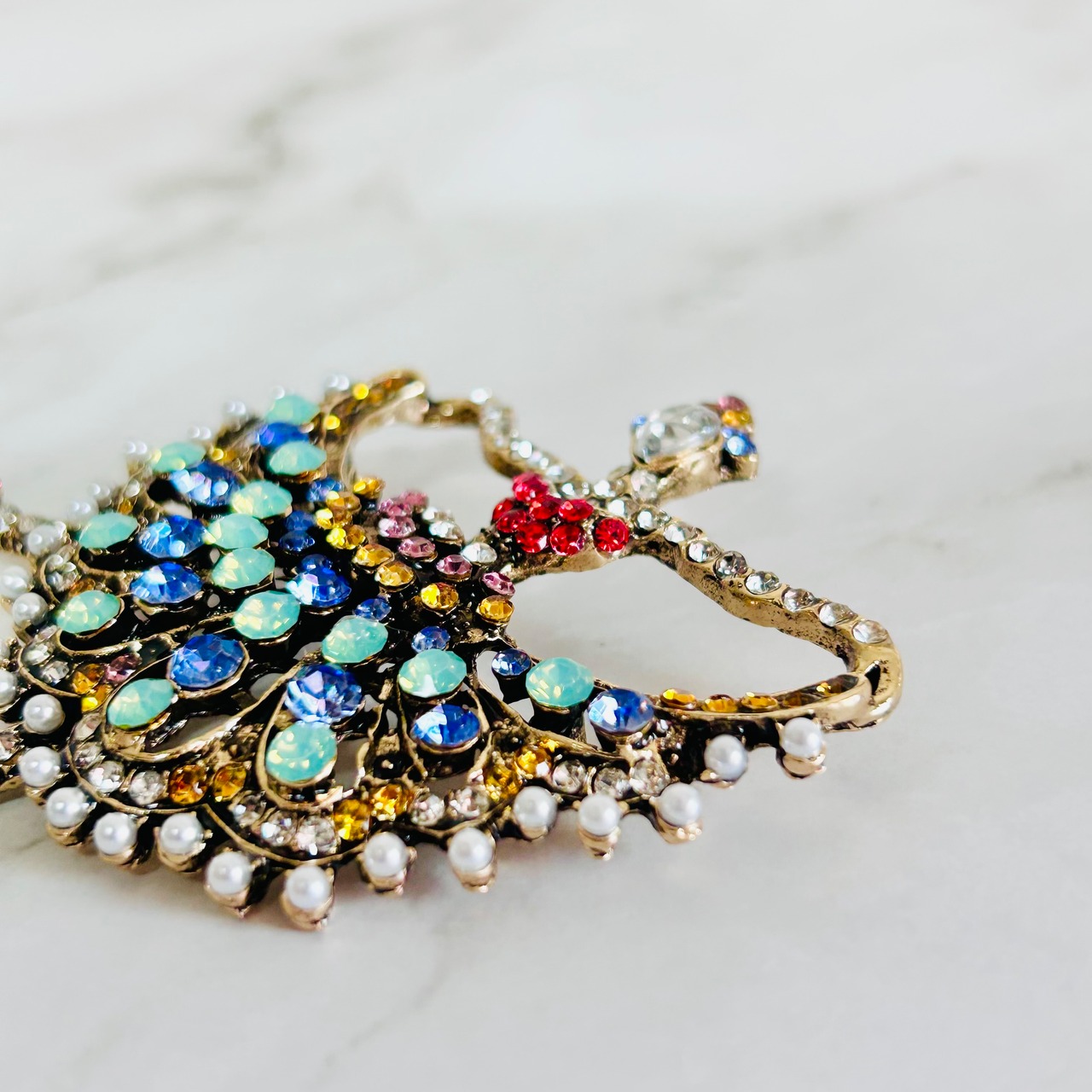 ブルーやミントグリーン、ルビーのようなレッドストーンを贅沢にあしらったおしゃれ心をくすぐるモチーフが魅力的なブローチです。