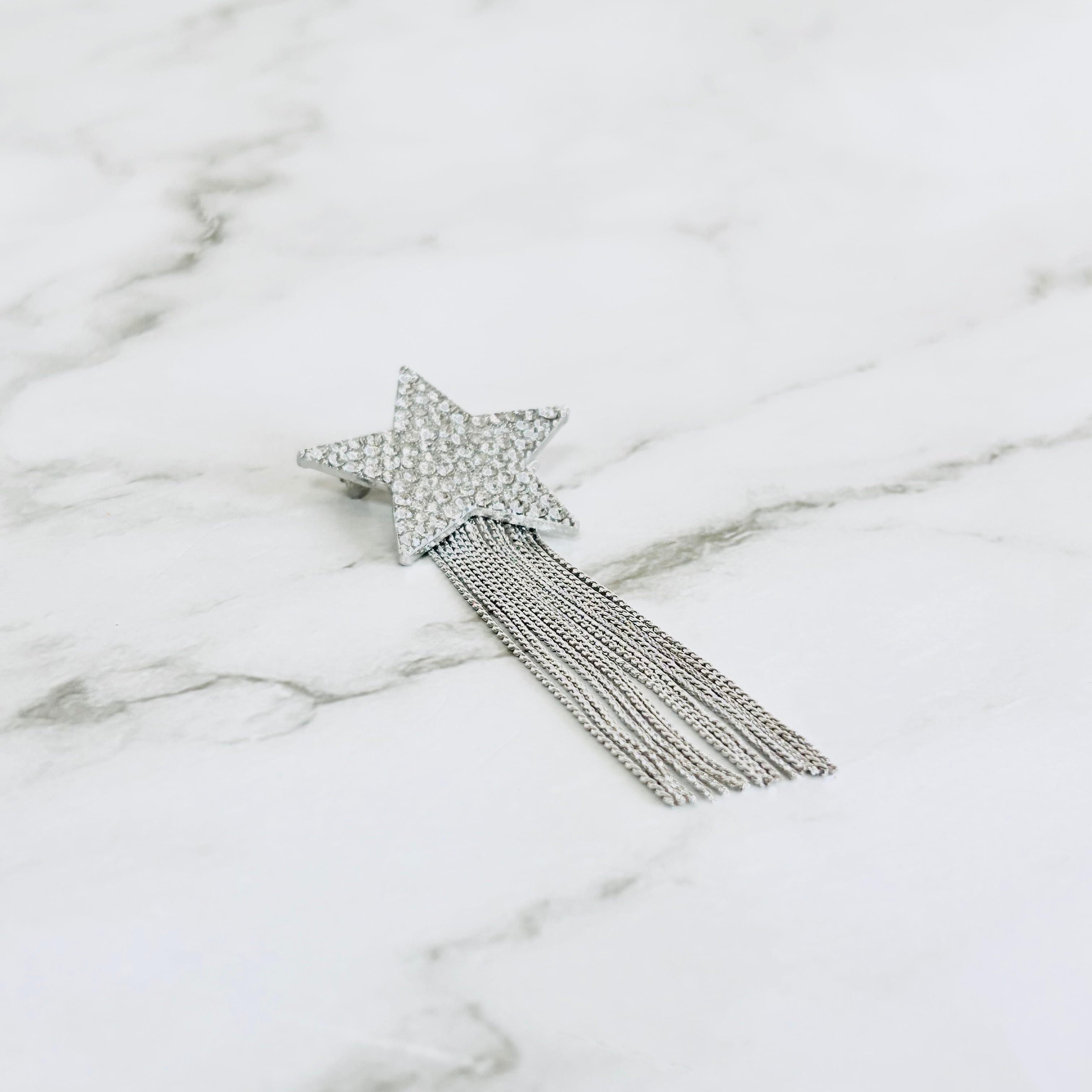 細やかなクリスタルを敷き詰めたスターモチーフに、繊細なシルバーチェーンのタッセルが揺れるブローチです。