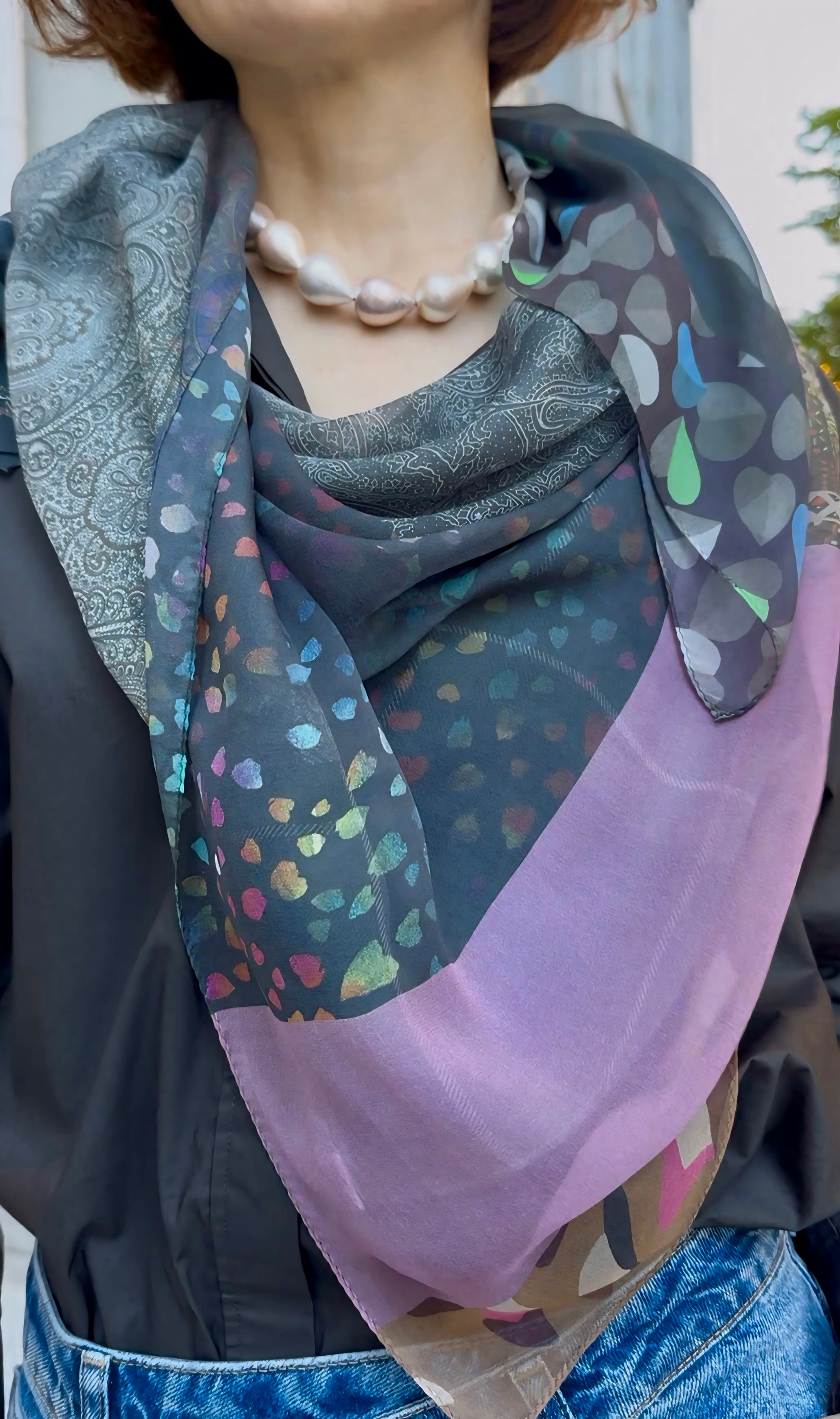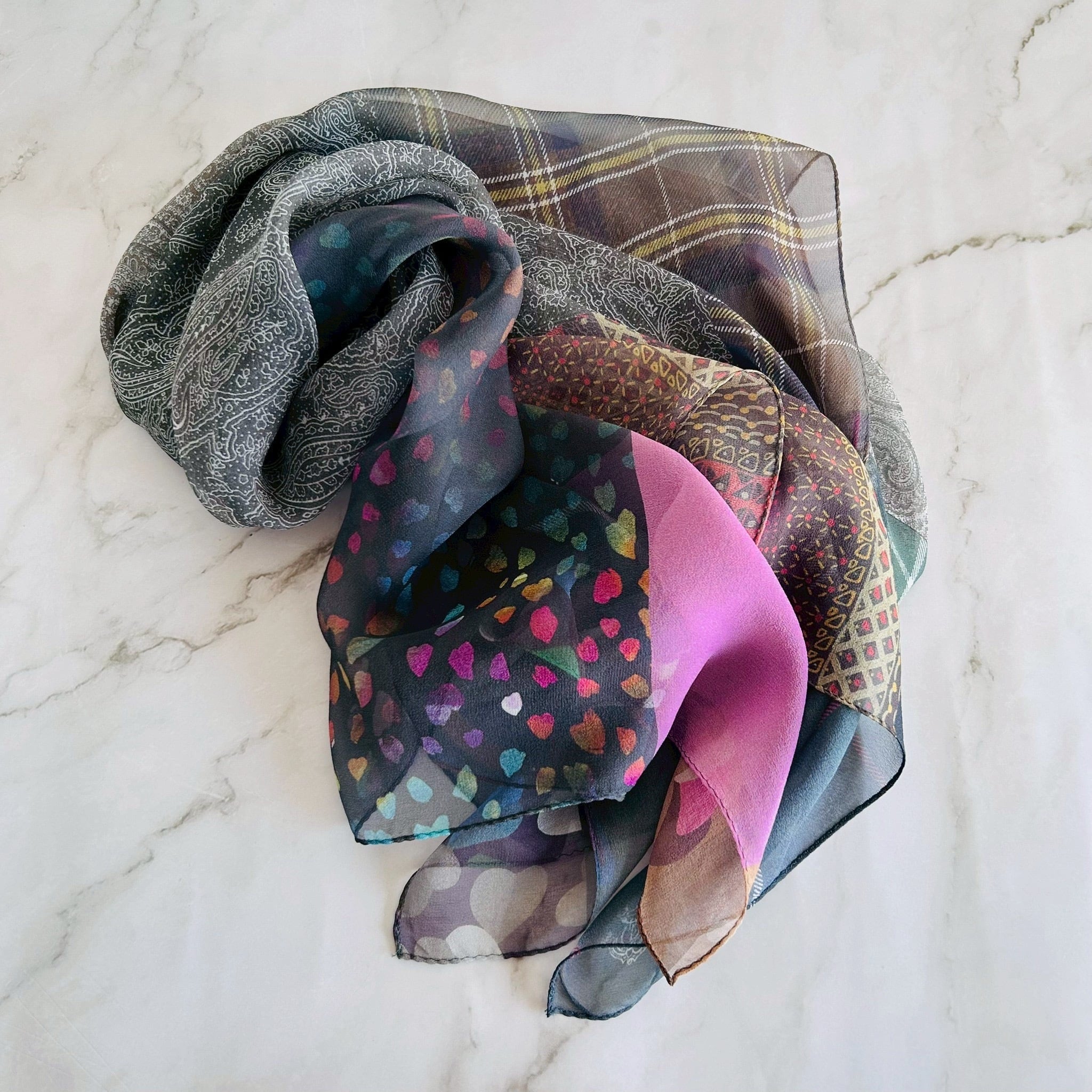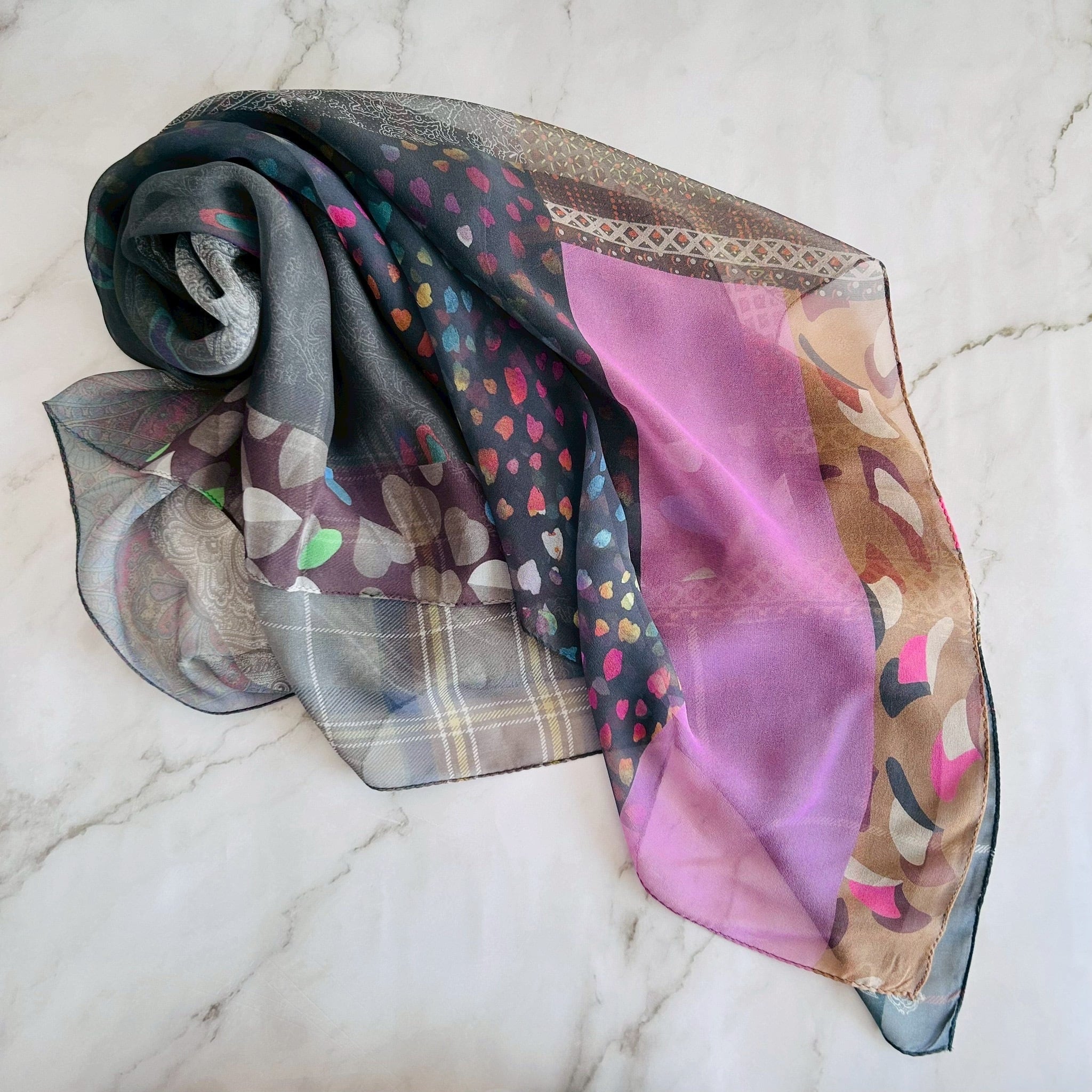 透けるほど繊細なジョーゼットの質感に、異なる柄を巧みに組み合わせたアートのようなデザイン♪