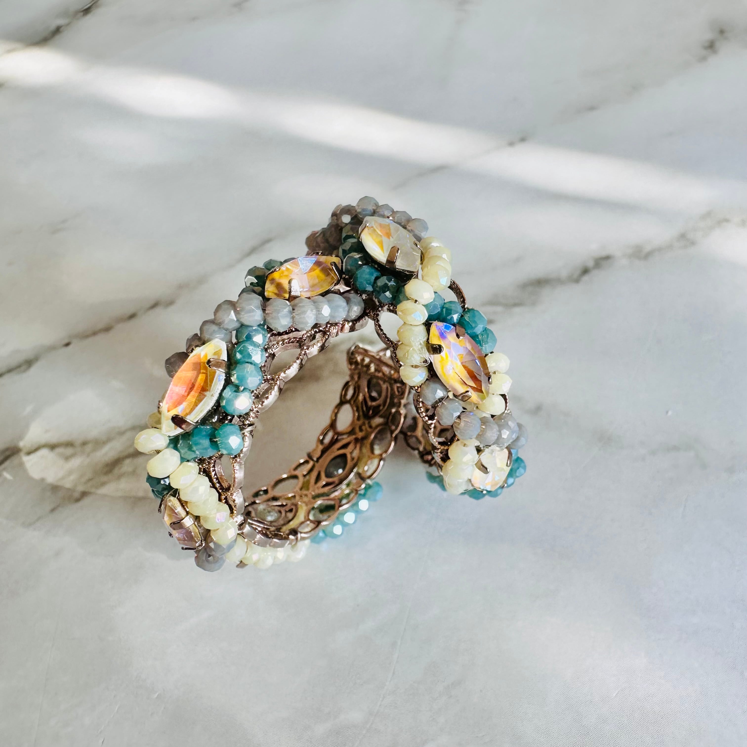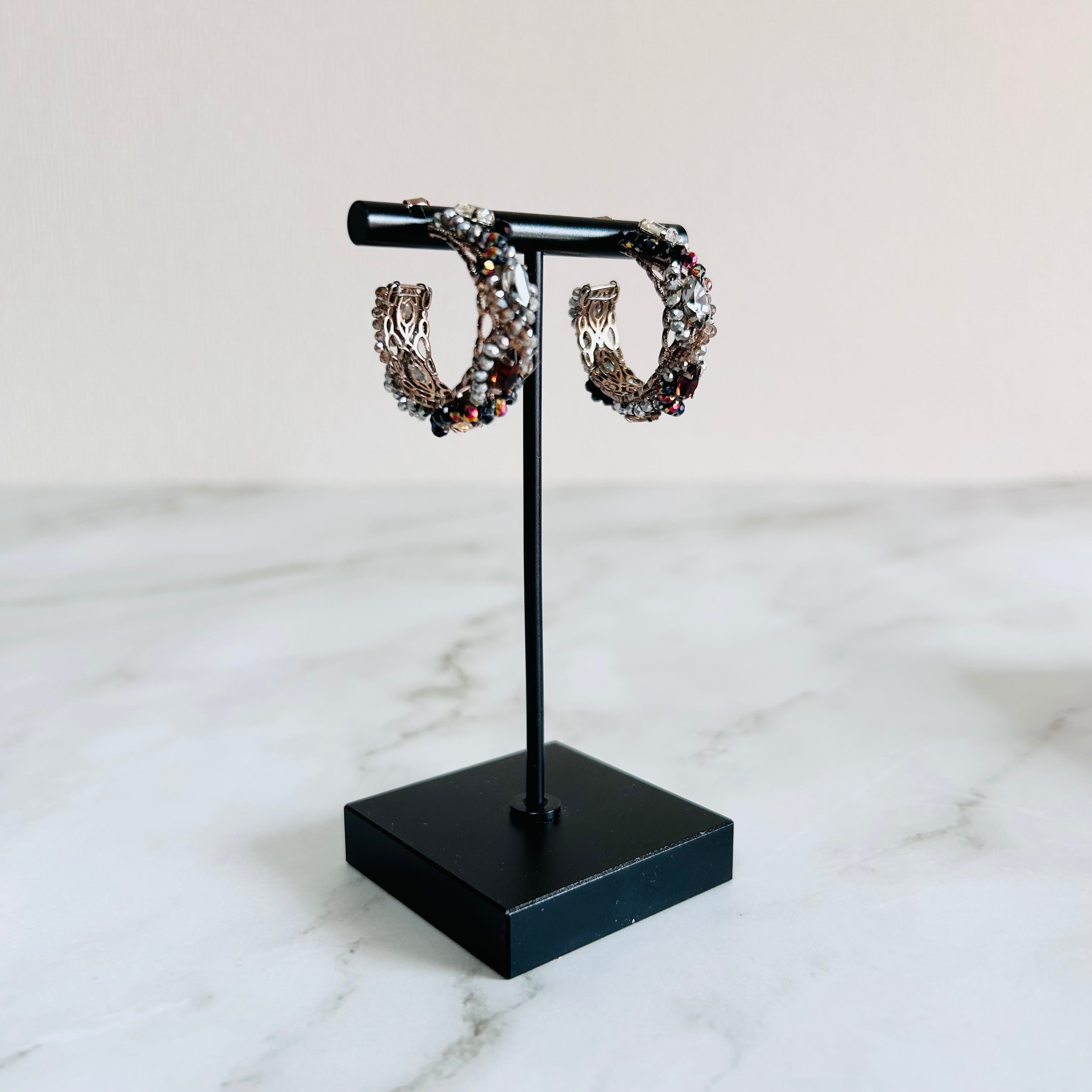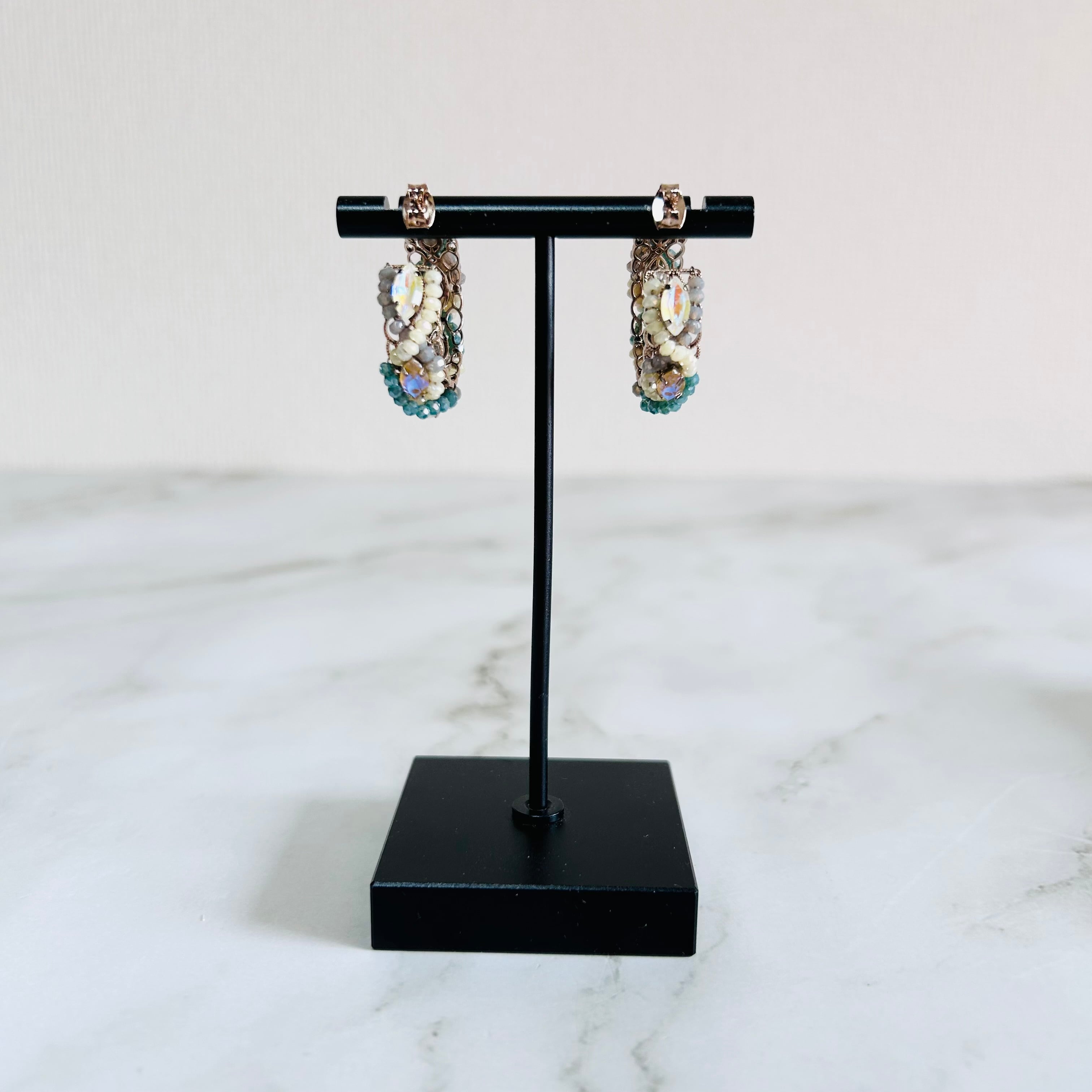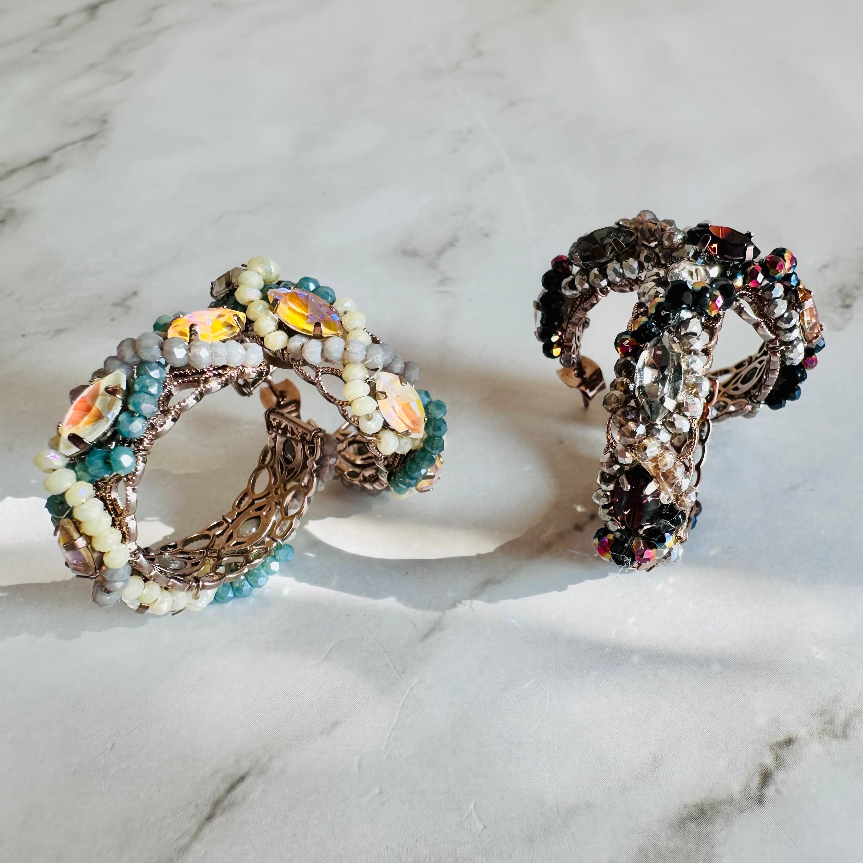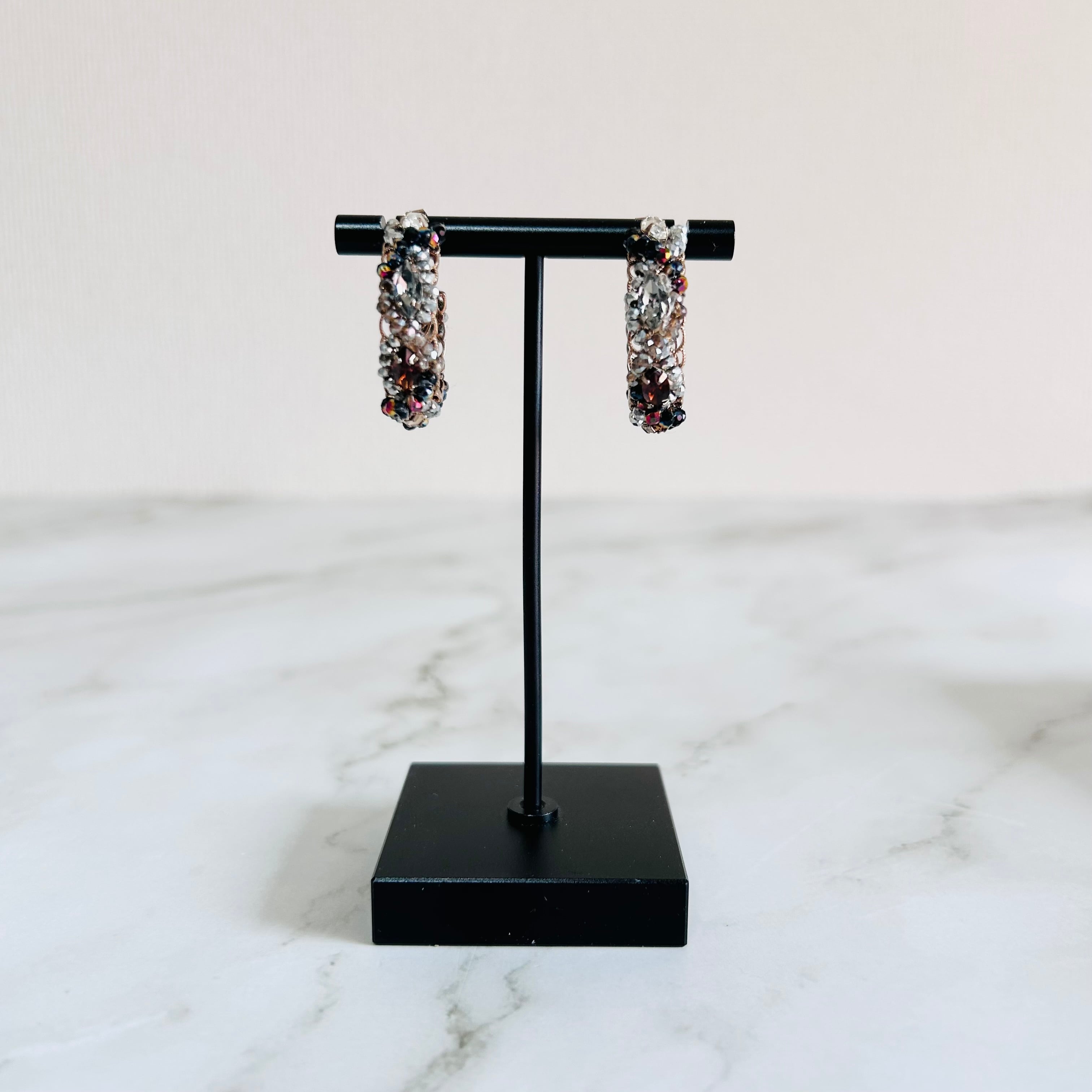 アンティークローズゴールドのフレームに、繊細なクリスタル素材のカットビーズやビジューパーツをぐるりと編み込んだ表情豊かなフープピアスです。