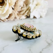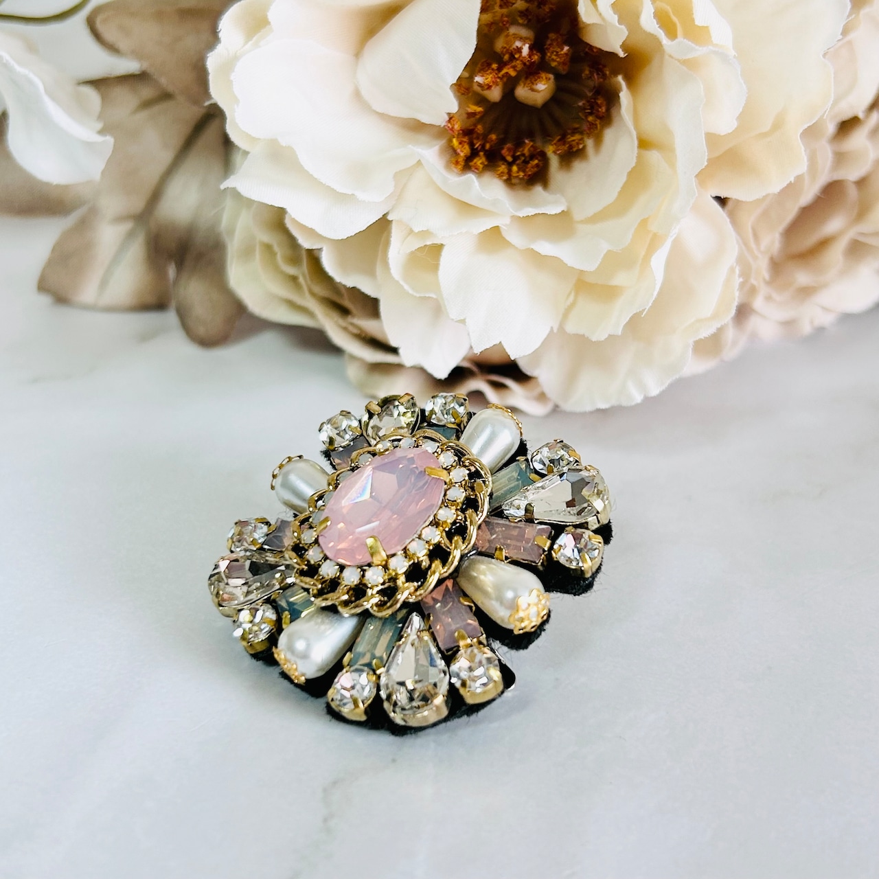 淡いローズピンクのオーバルパーツを中心に、クリアビジューやパール調パーツを贅沢に散りばめた華やかなブローチです。