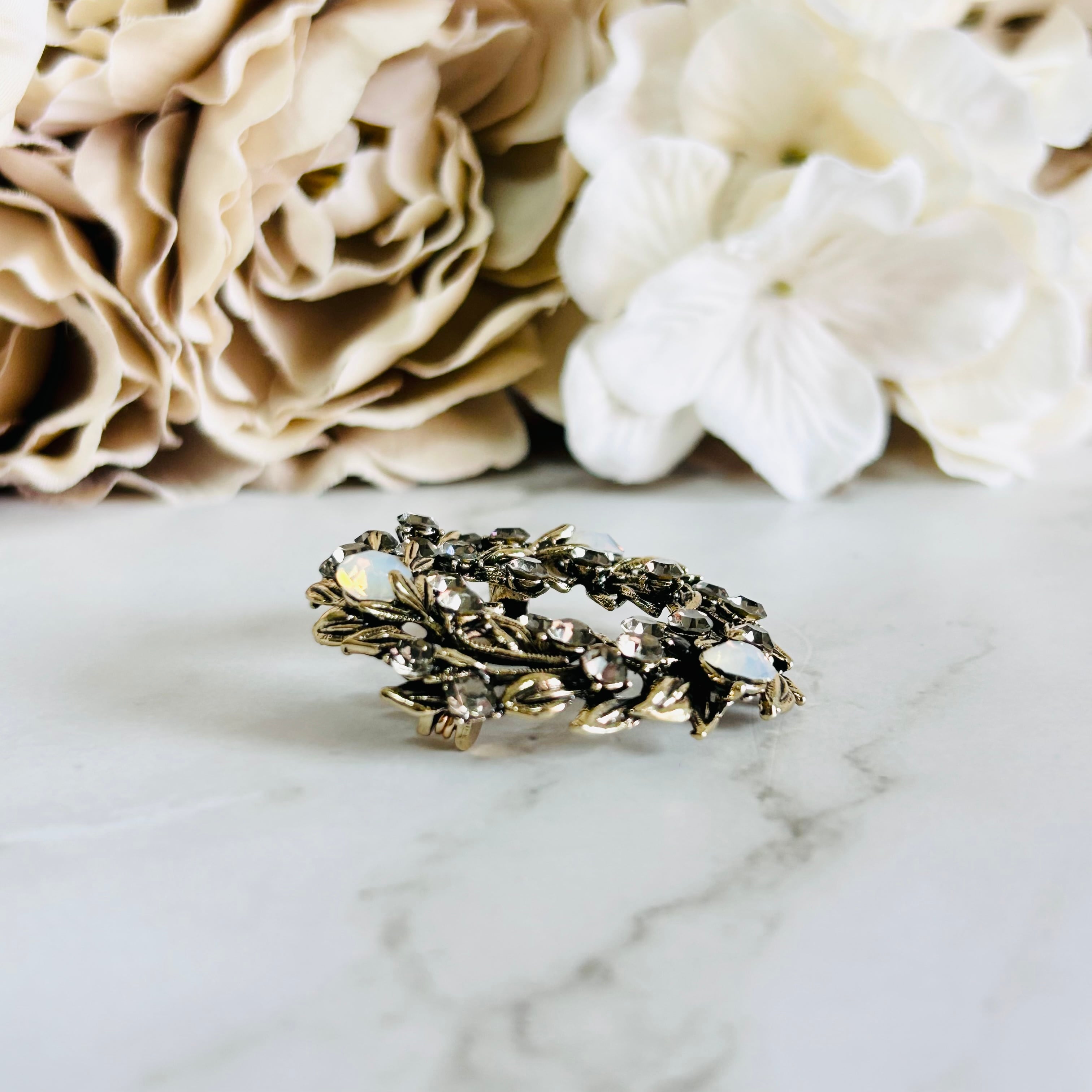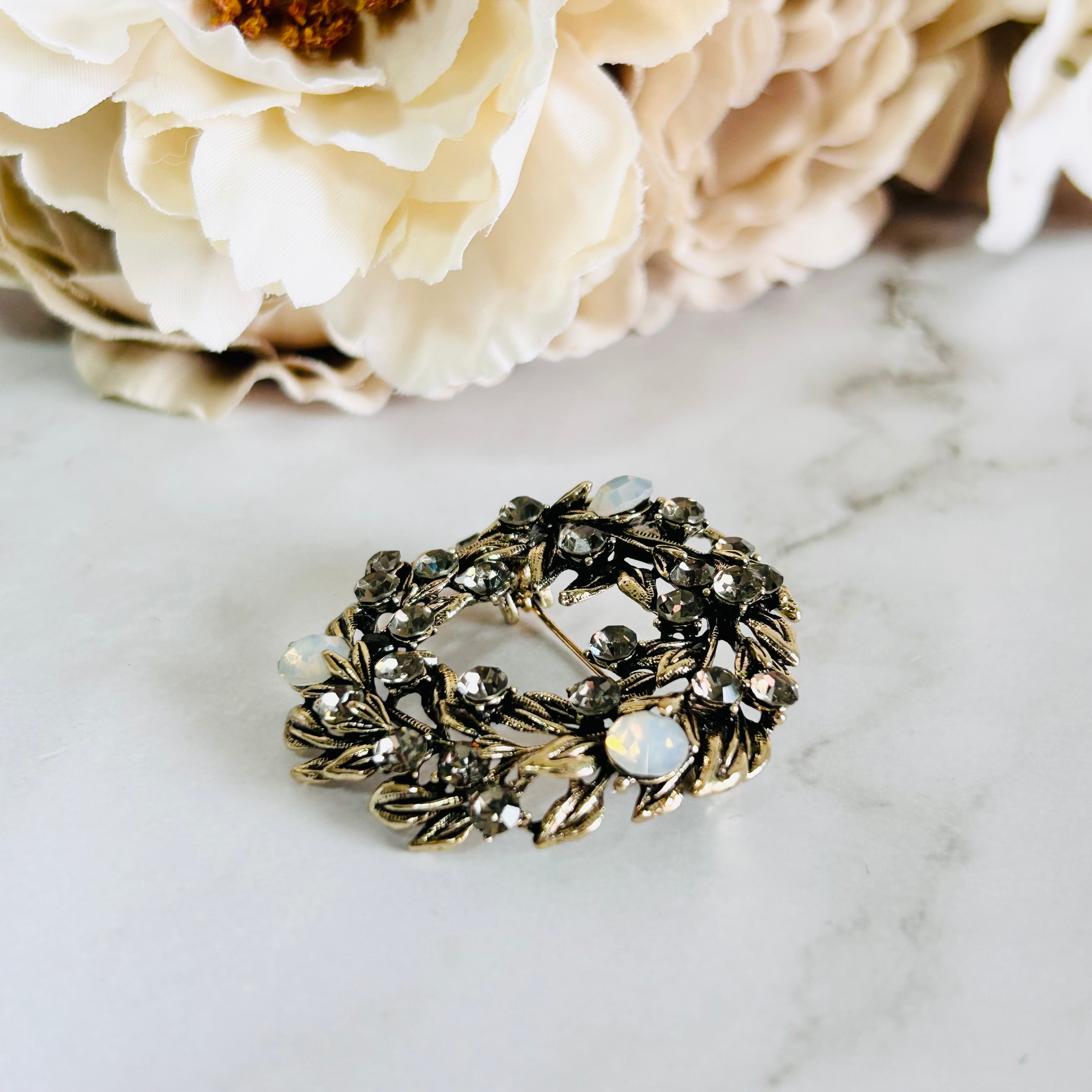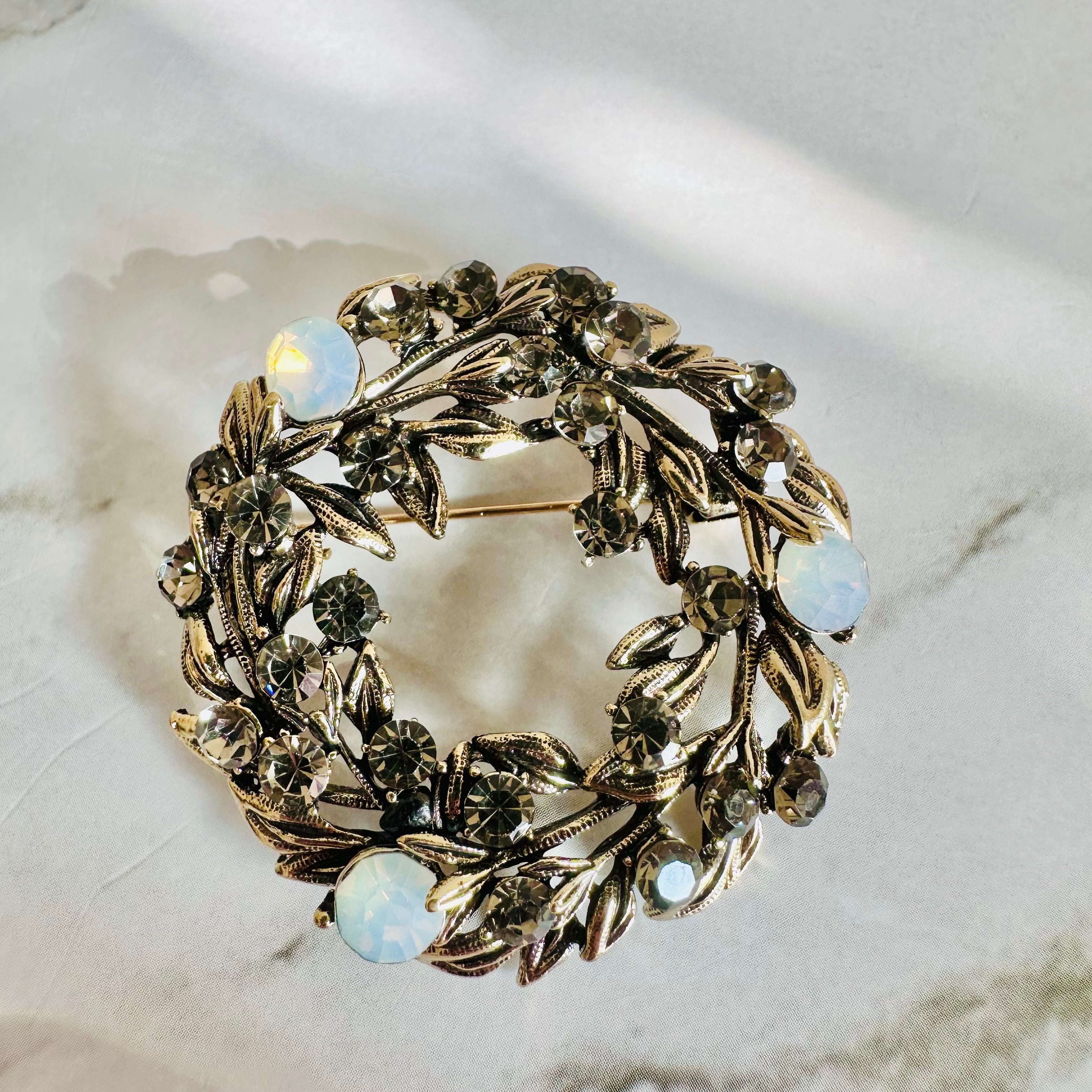 アンティークゴールドのリーフパーツに、落ち着いたスモーキービジューパーツと乳白色のクリスタルストーン調パーツを散りばめたリースデザインのブローチです。