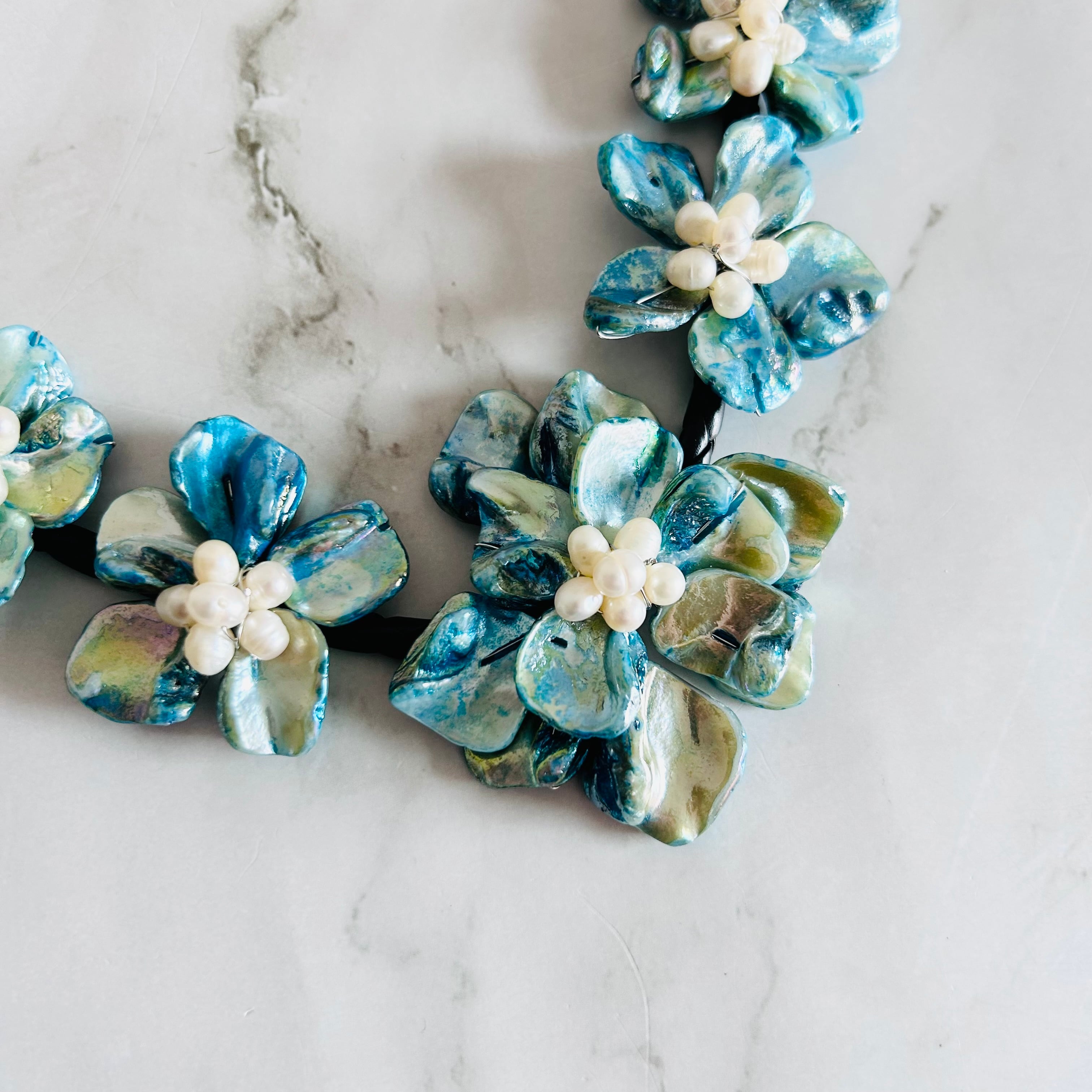 グリーンがかったブルー系カラーのシェルと天然淡水パールを使用し、大人シックなフラワーデザインに仕上げました。
