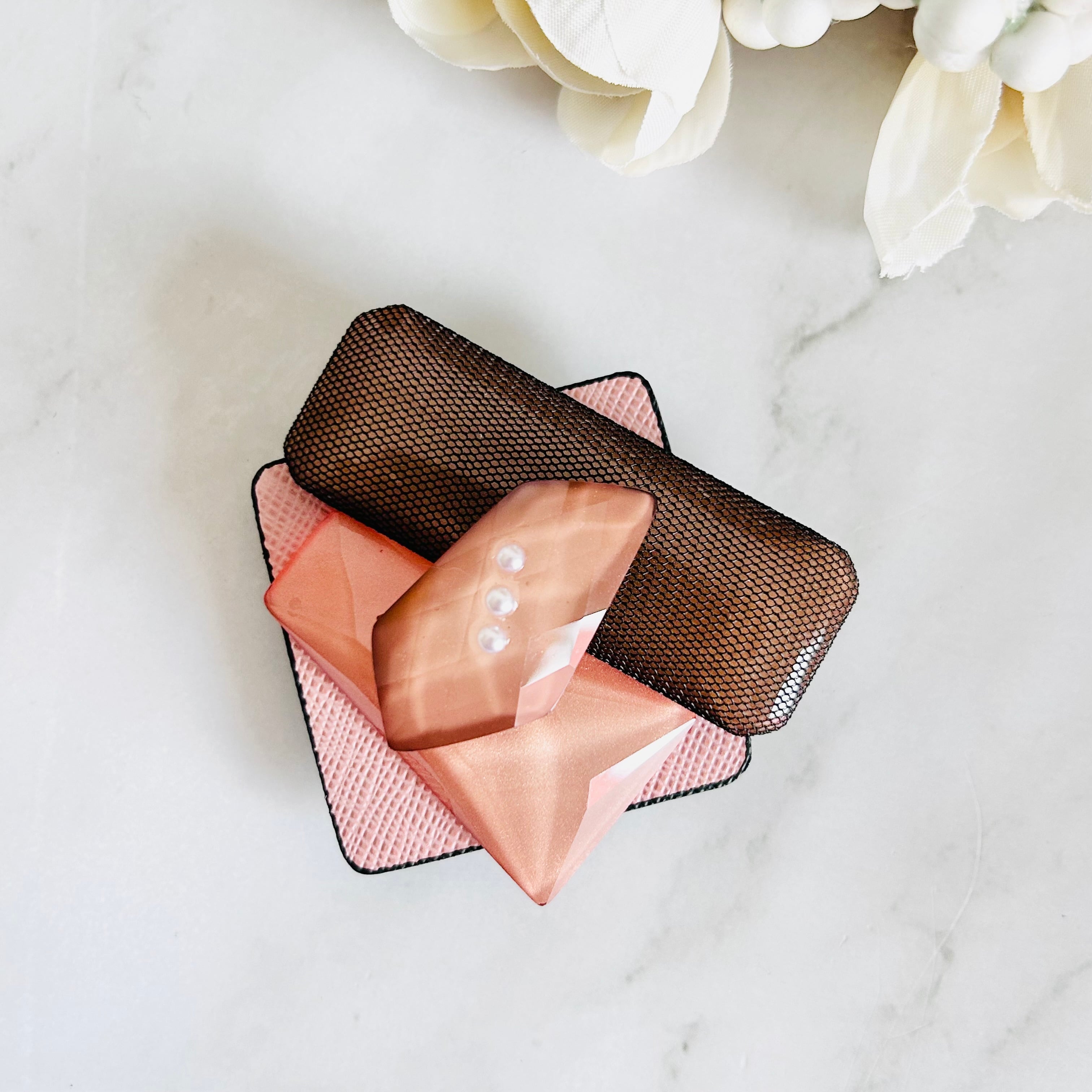 マットなブラウンと上品なピンクのコントラストが、落ち着きと華やかさをバランスよく兼ね備えています。