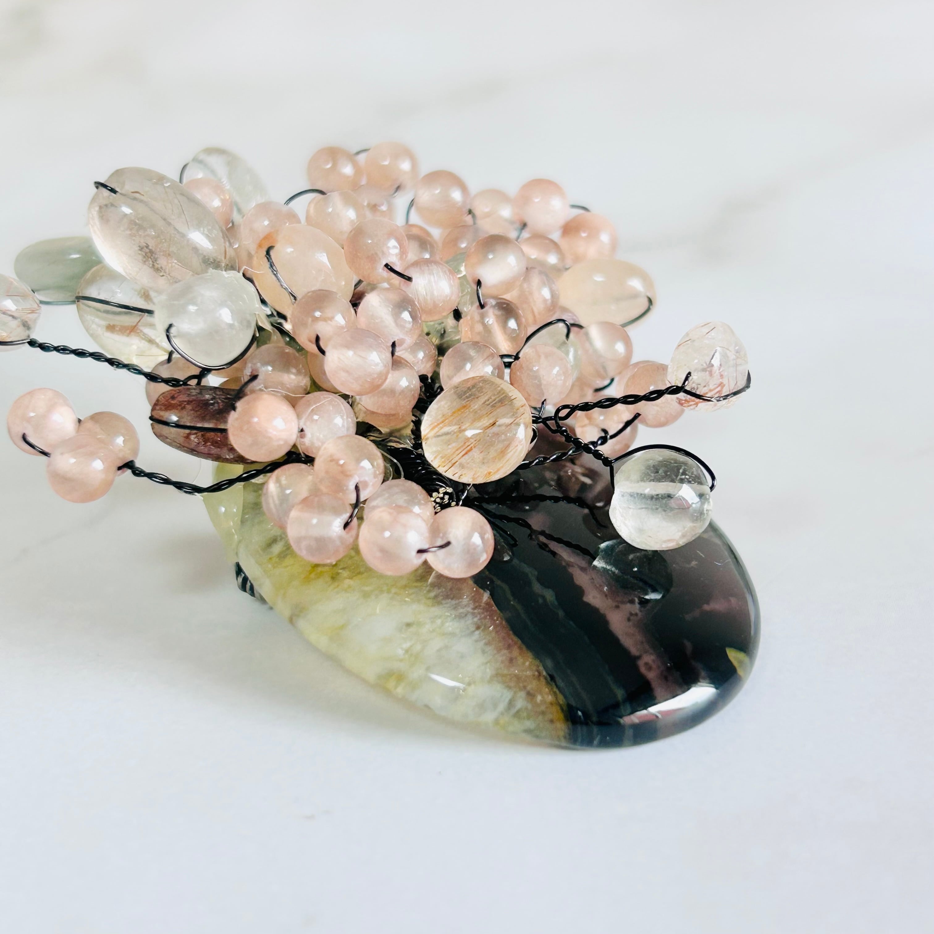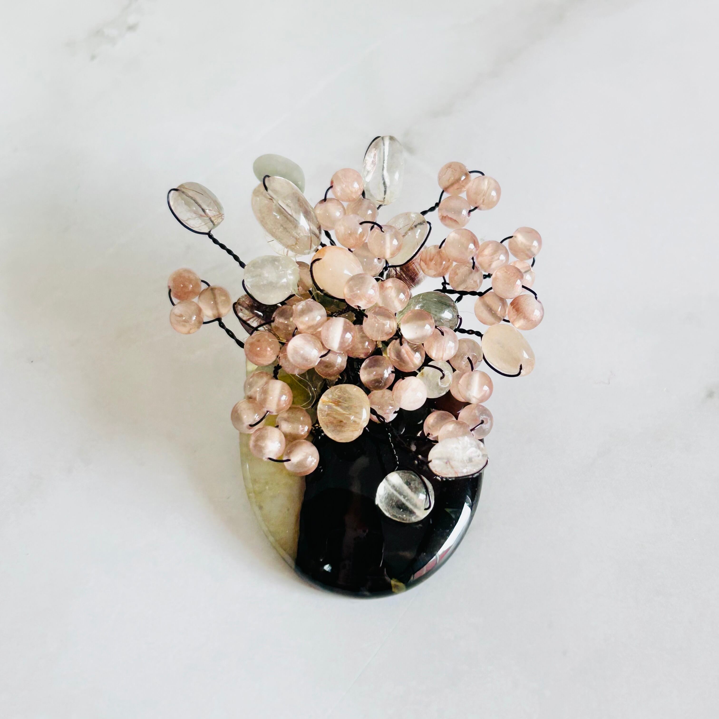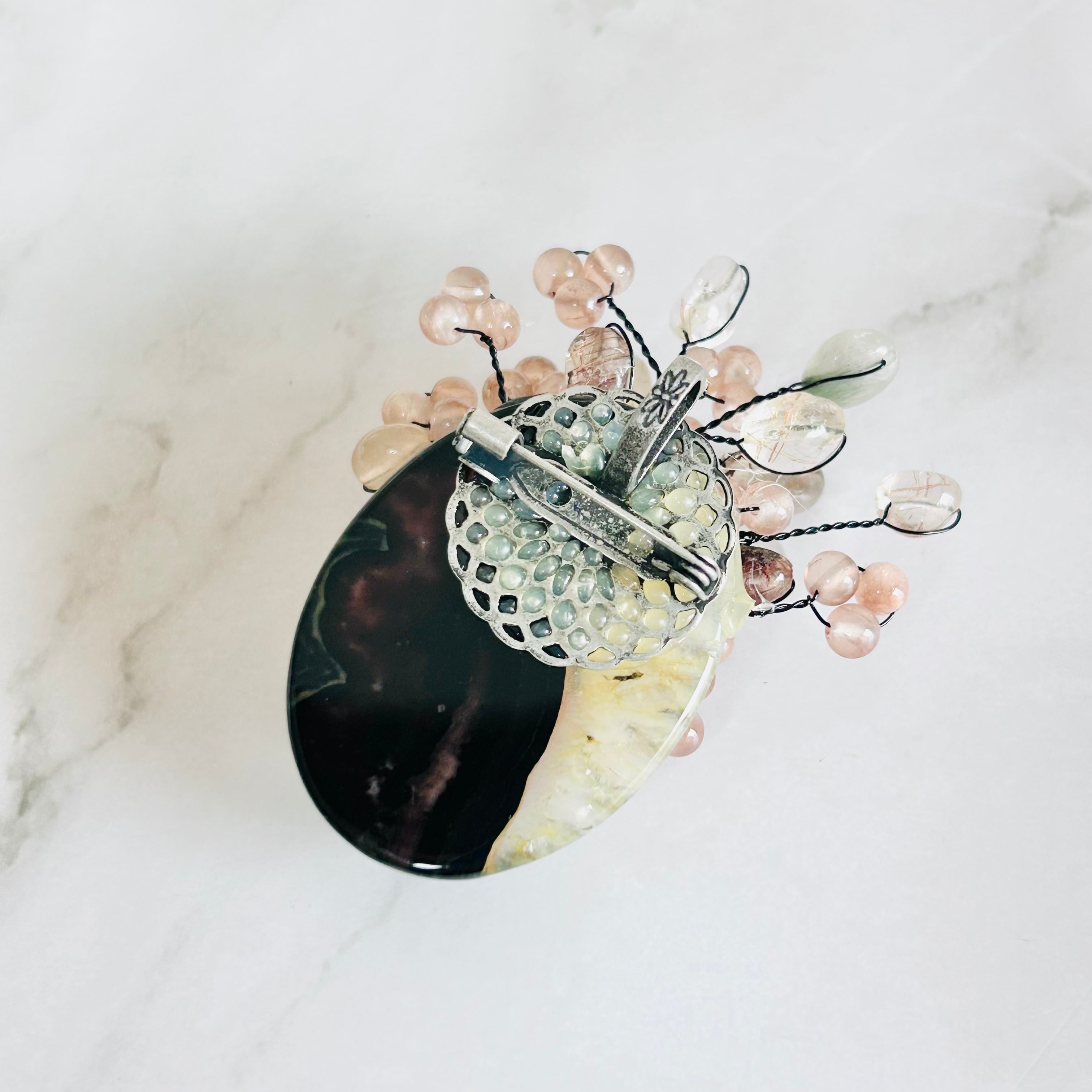 透明感のある天然石と、ほんのり温かみを帯びたニュアンスピンクの天然石の束ねた、立体的なフォルムが美しい世界にひとつだけのブローチです。