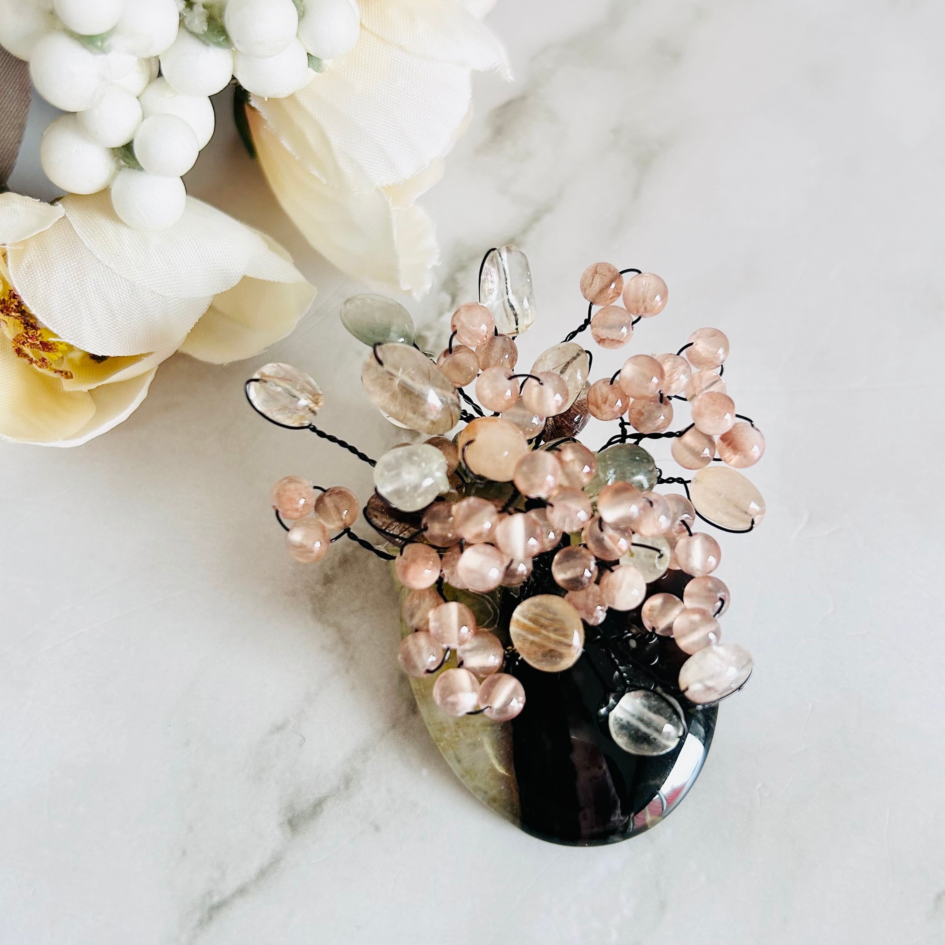 土台には艶のあるブラック系の天然石を使用し、繊細なビーズワークとのコントラストがデザインをより一層引き立てています。
