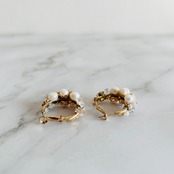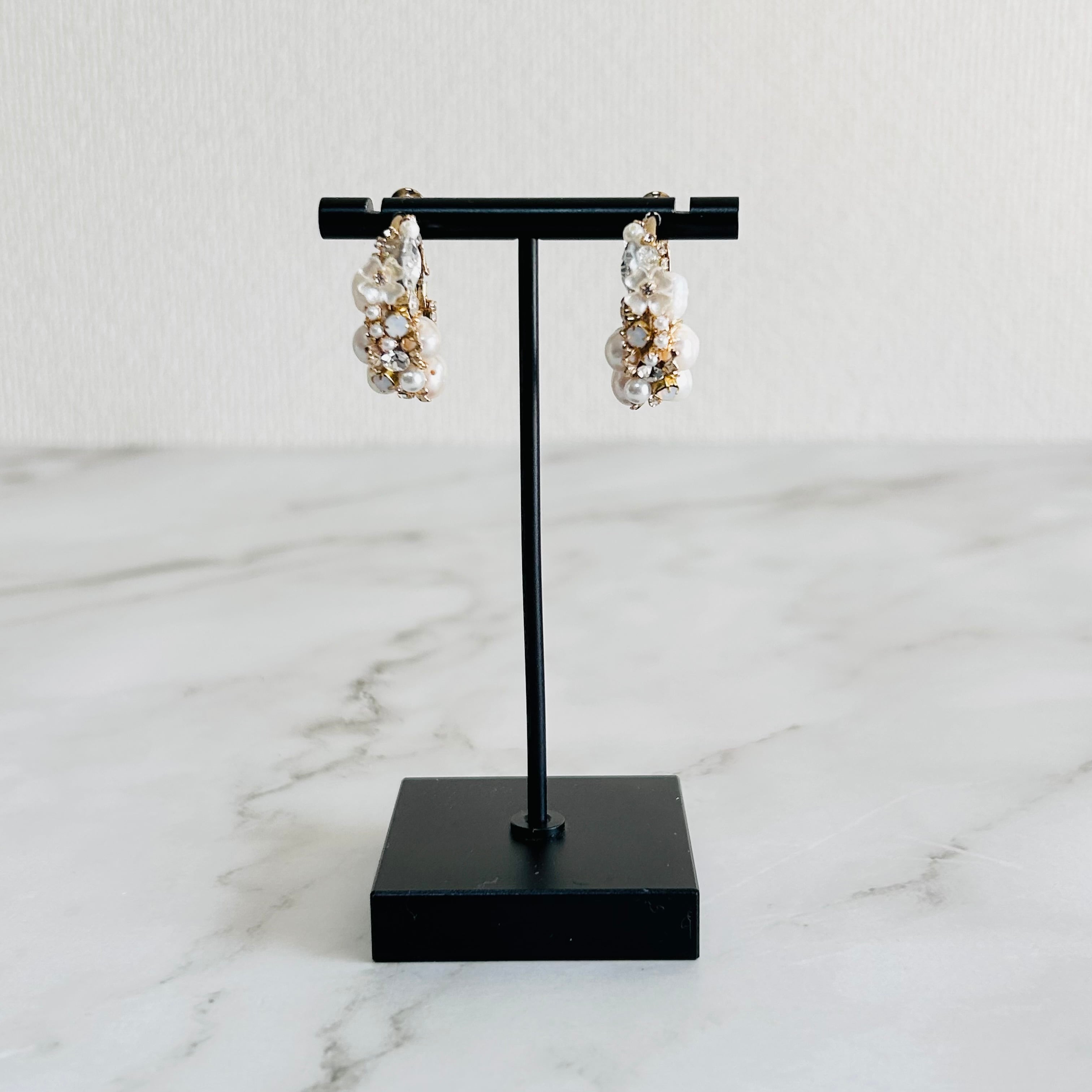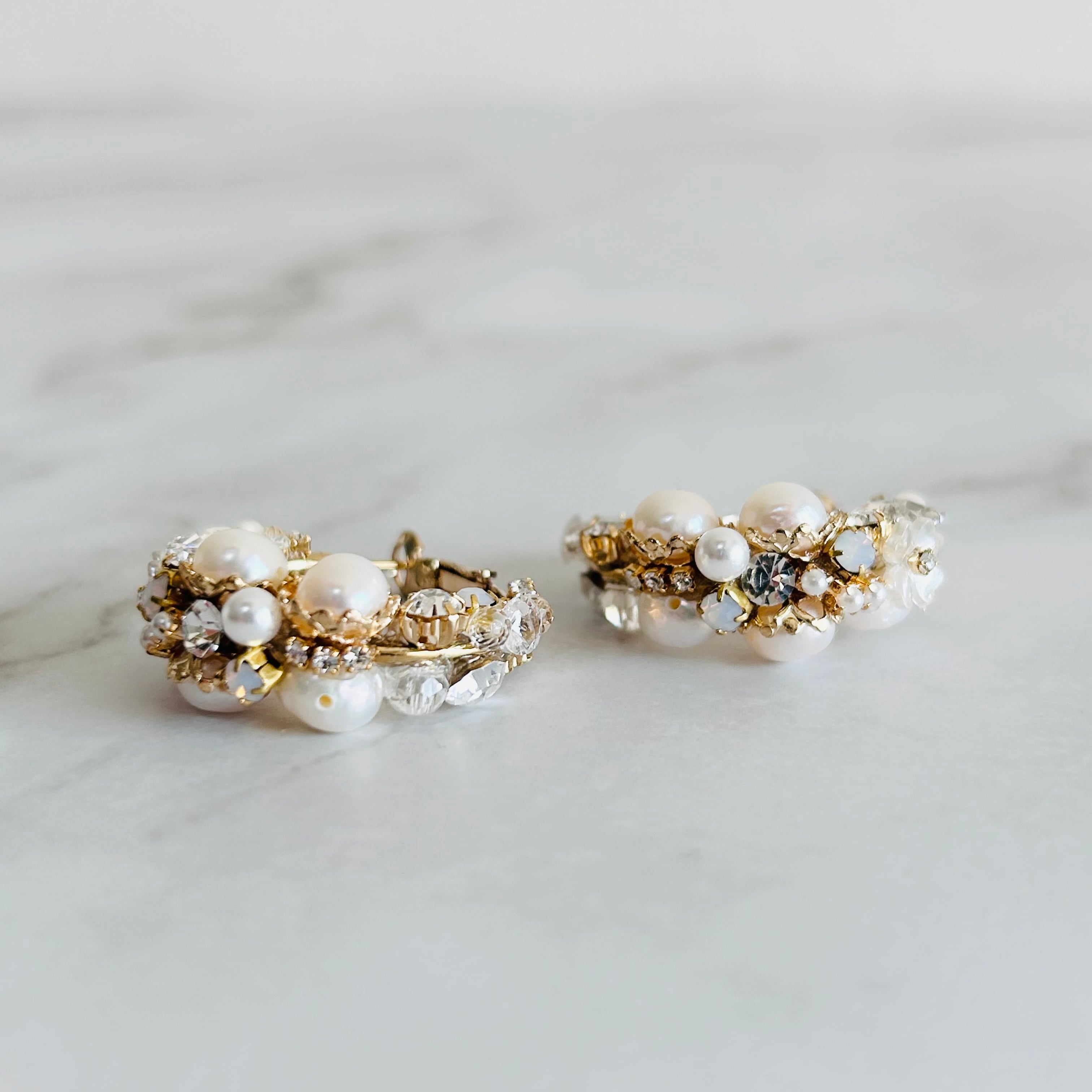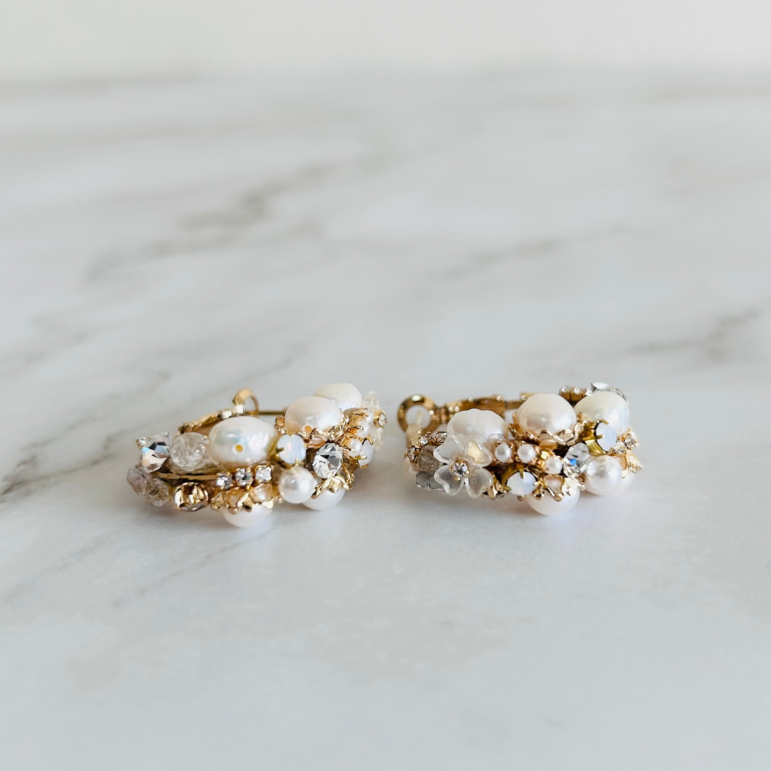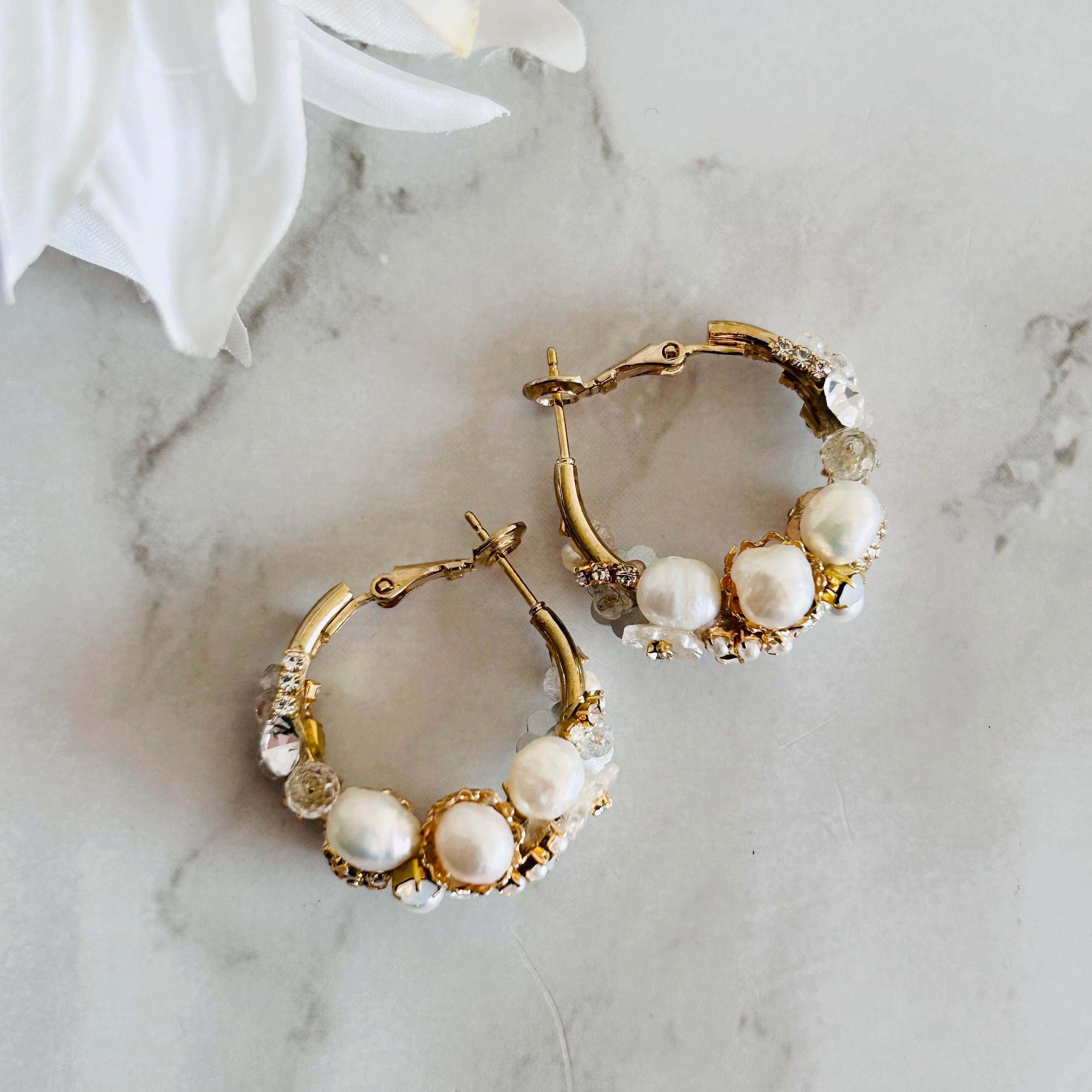 天然淡水パール、クリスタル、クリアビジューパーツなど、さまざまなパーツをふんだんに散りばめた、ゴージャスでエレガントなフープピアスです。
