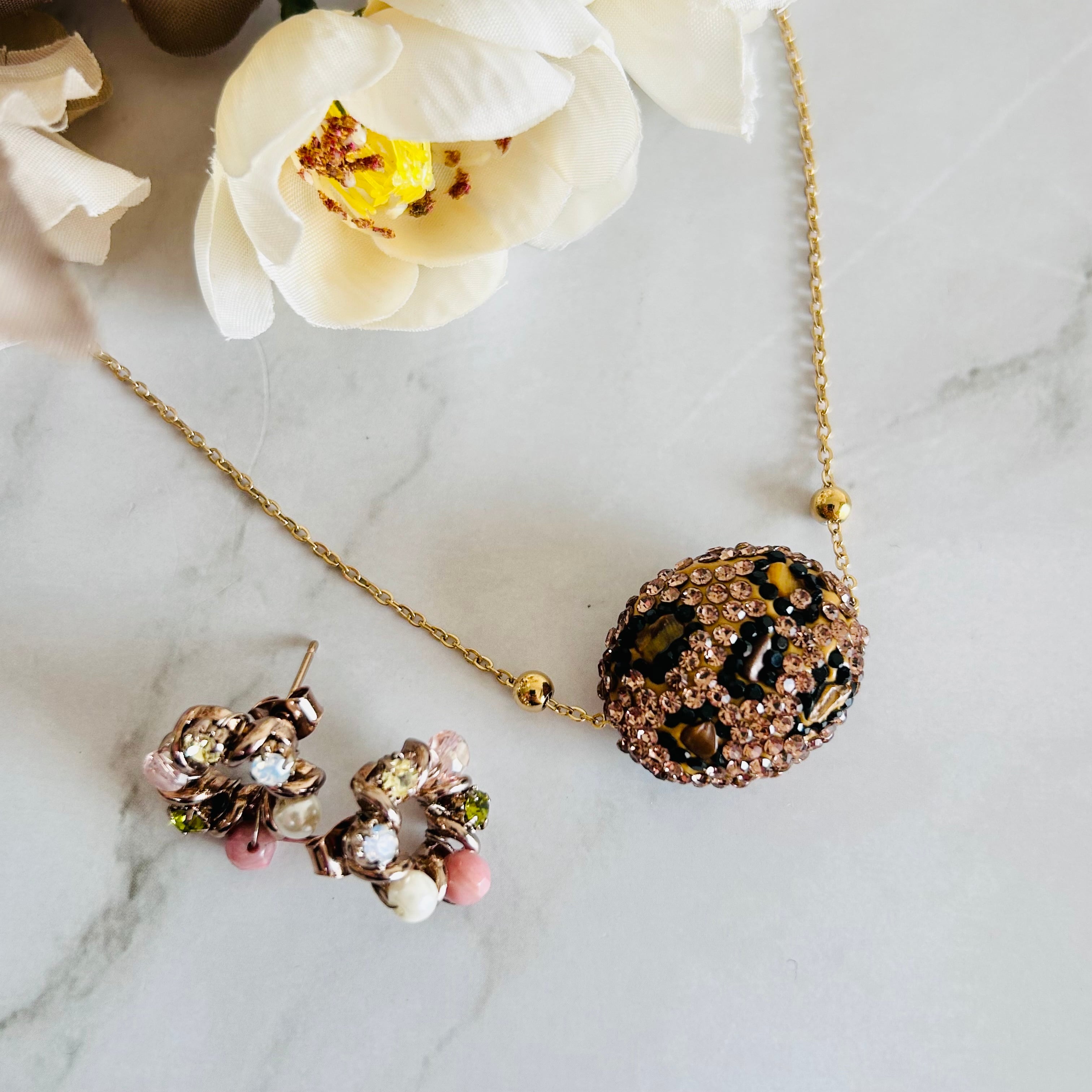 ショートコートやウールジャケットの隙間から見えるクリスタルの煌めきが、季節のスタイリングにアクセントを添えてくれます。