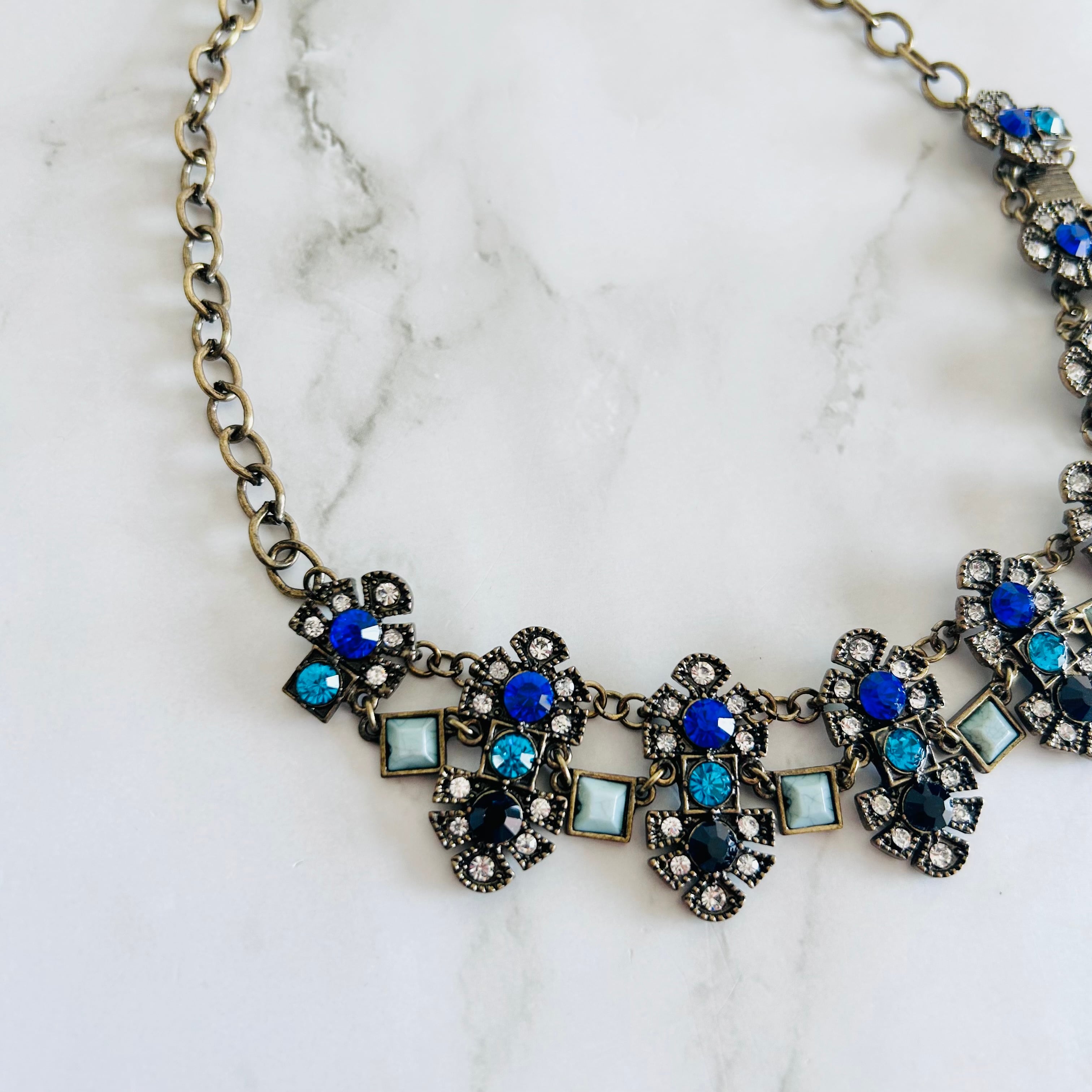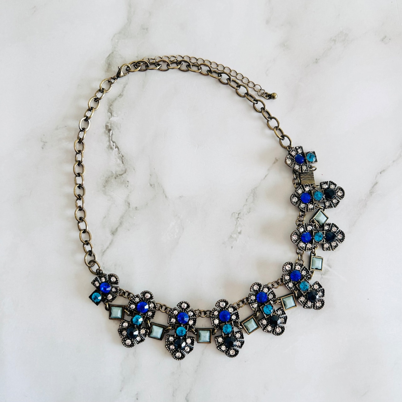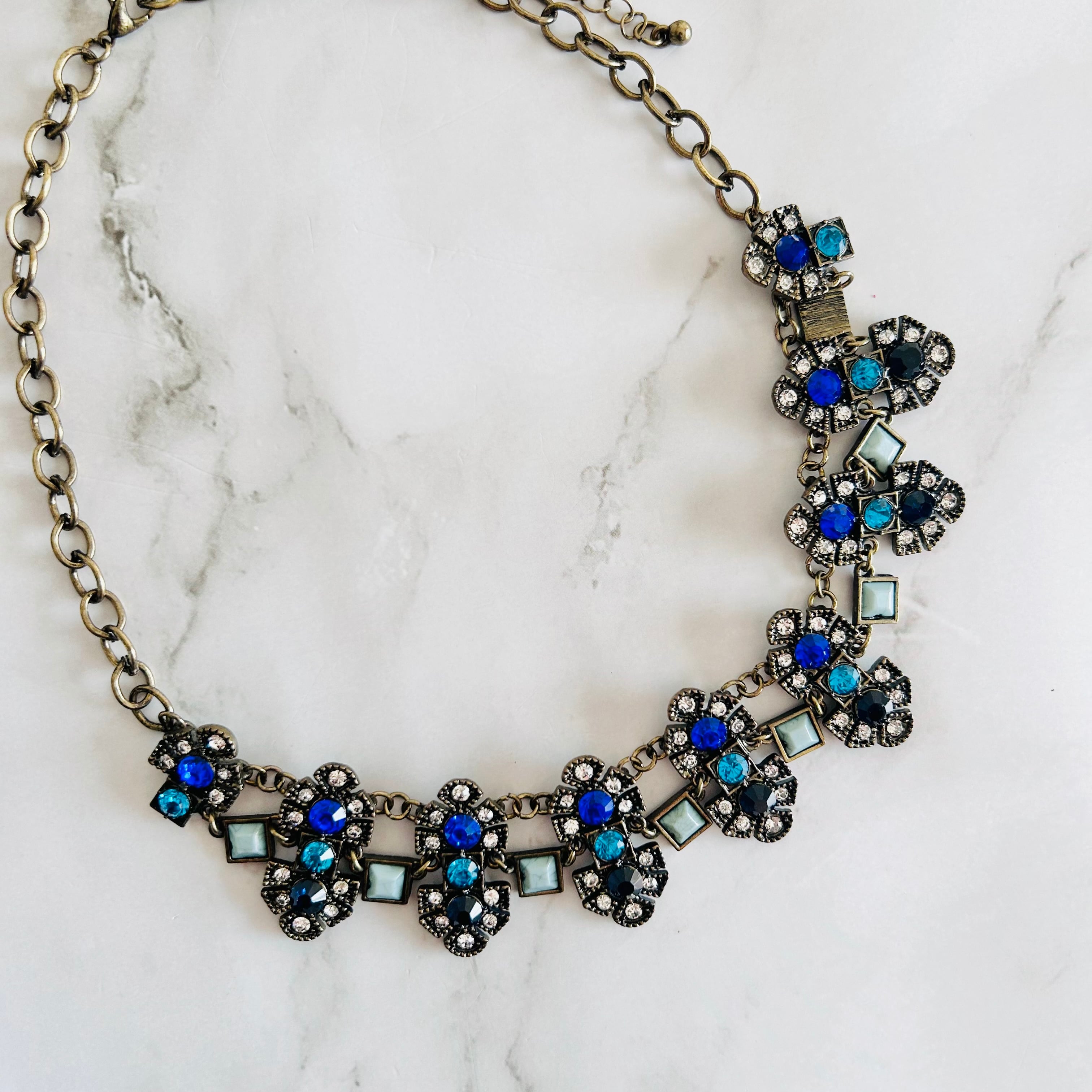 深みのあるブルーを中心に、ロイヤルブルー、ネイビー、クリアストーンのパーツをあしらったモチーフネックレスです。
