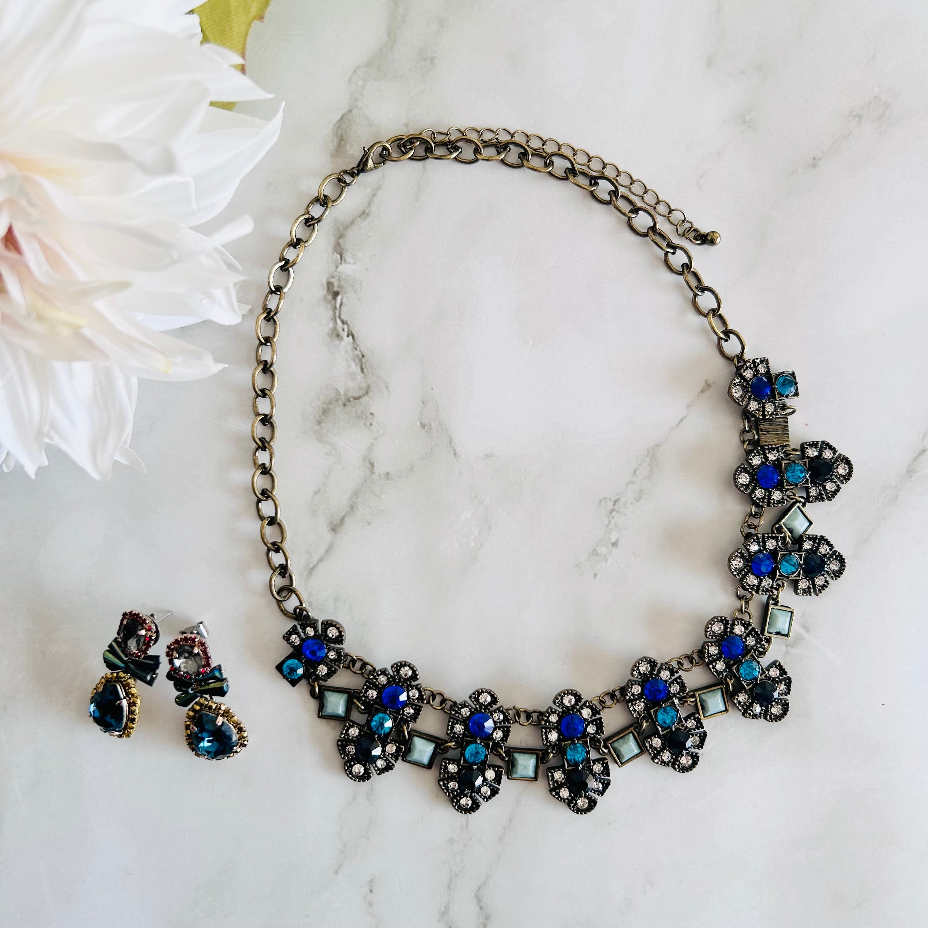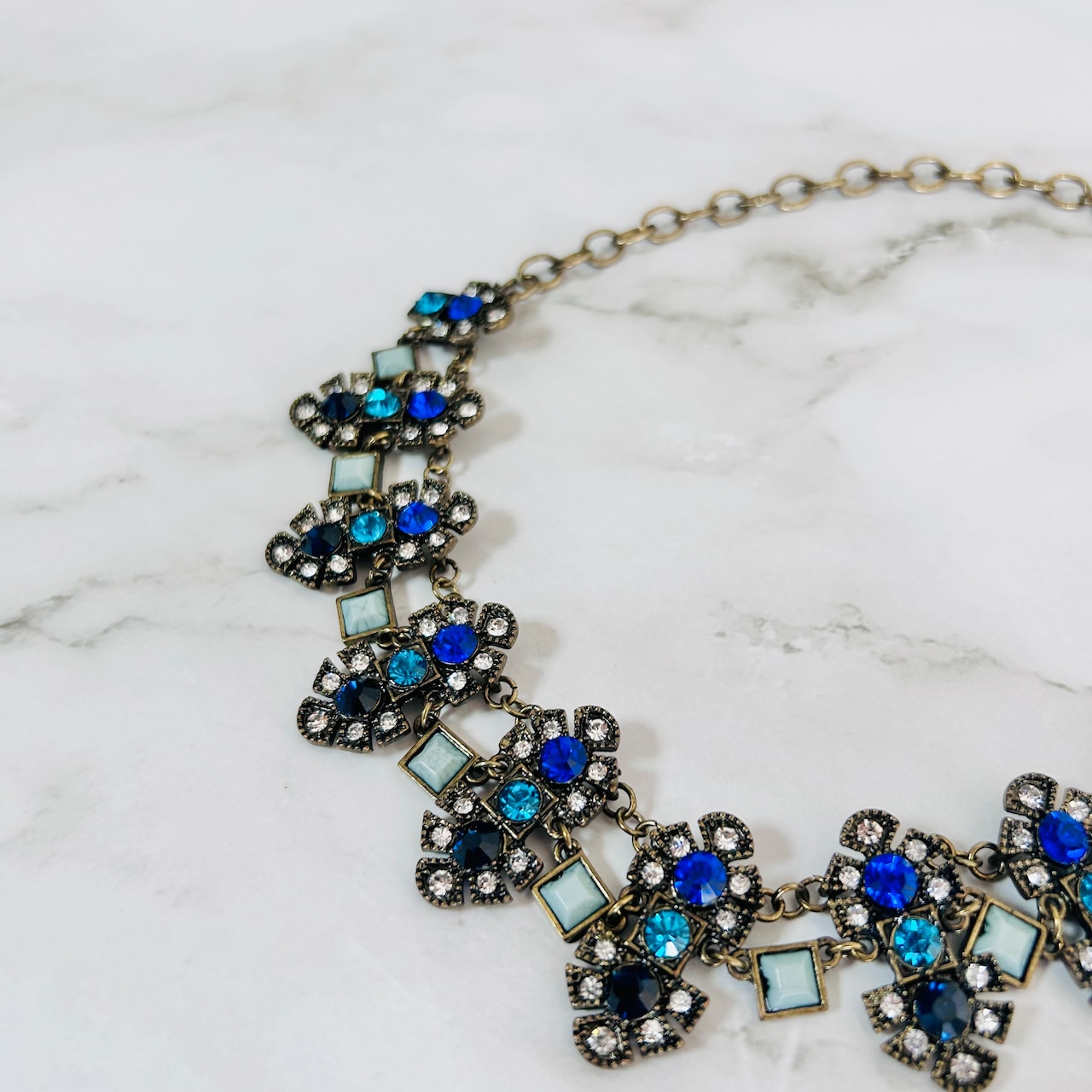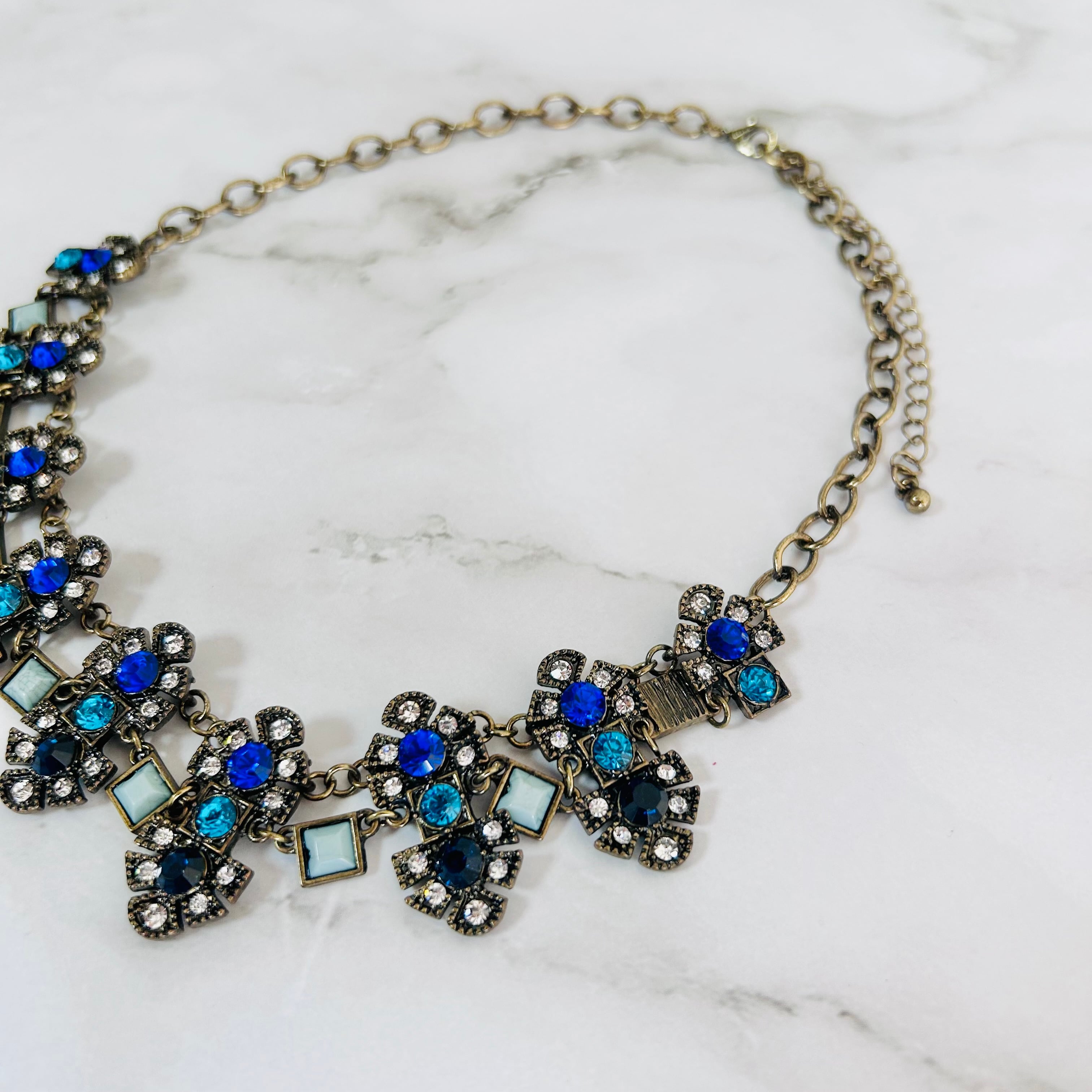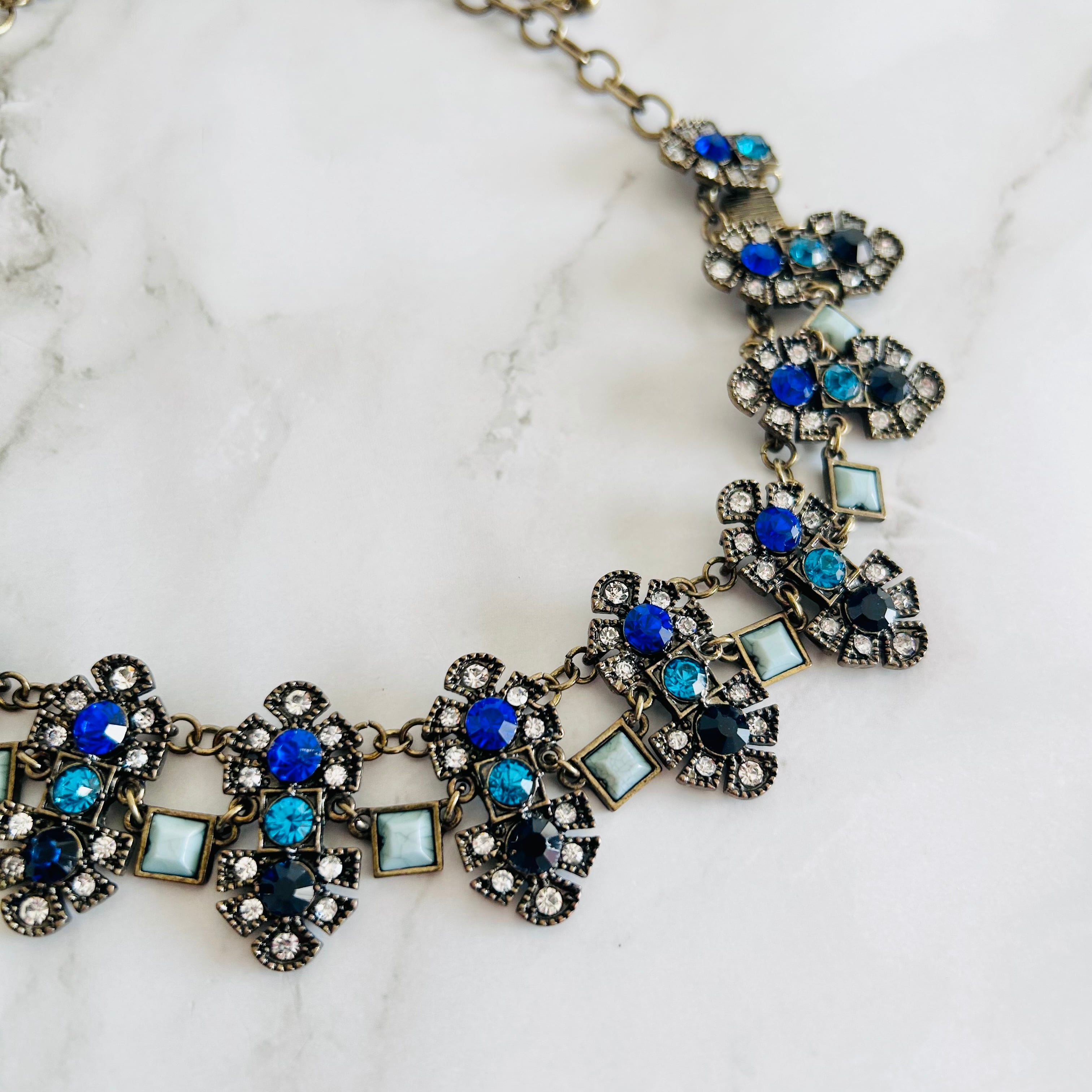 深みのあるブルーを中心に、ロイヤルブルー、ネイビー、クリアストーンのパーツをあしらったモチーフネックレスです。