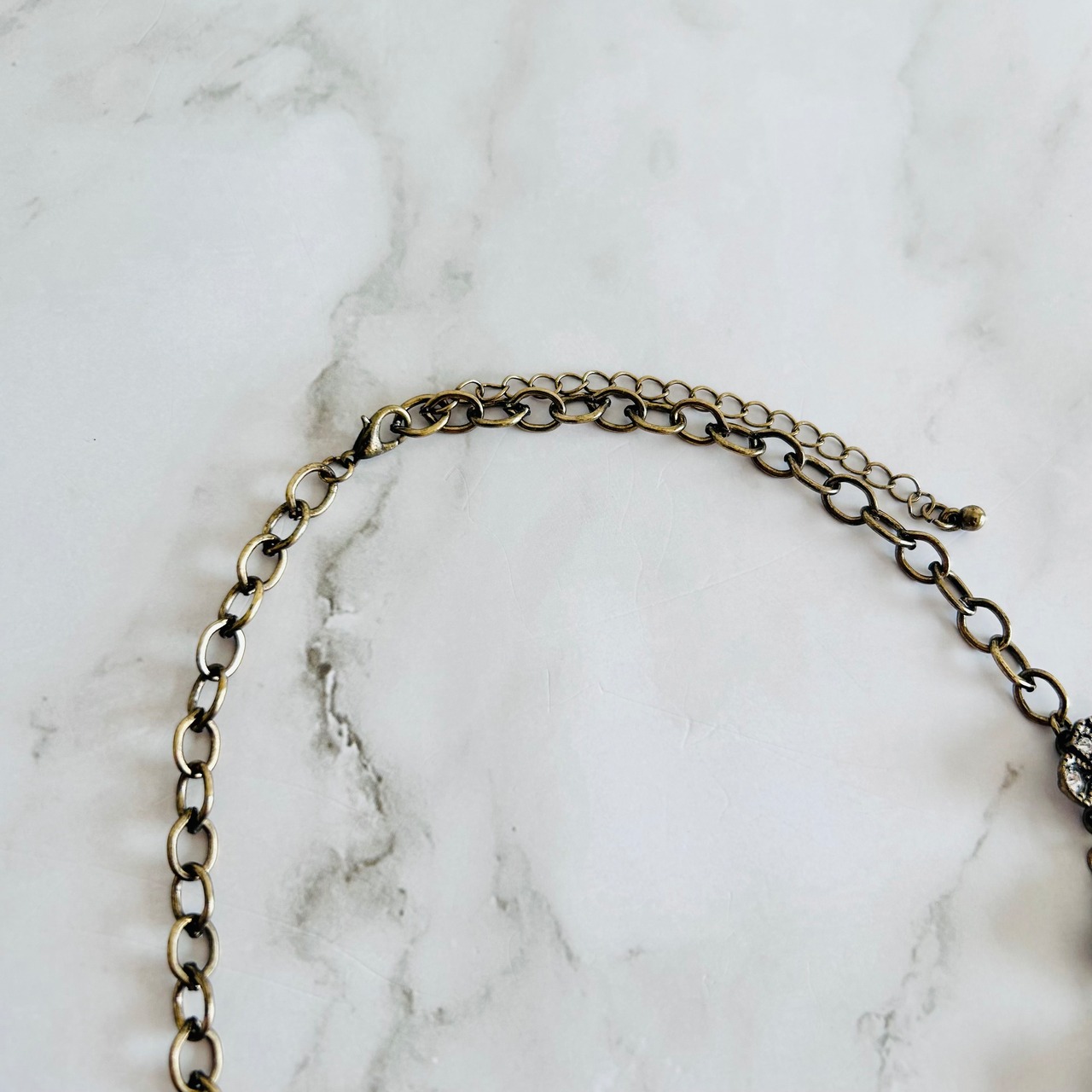 アンティークゴールドのチェーンが全体を引き締め、クラシカルな雰囲気とモード感が絶妙に融合しています。