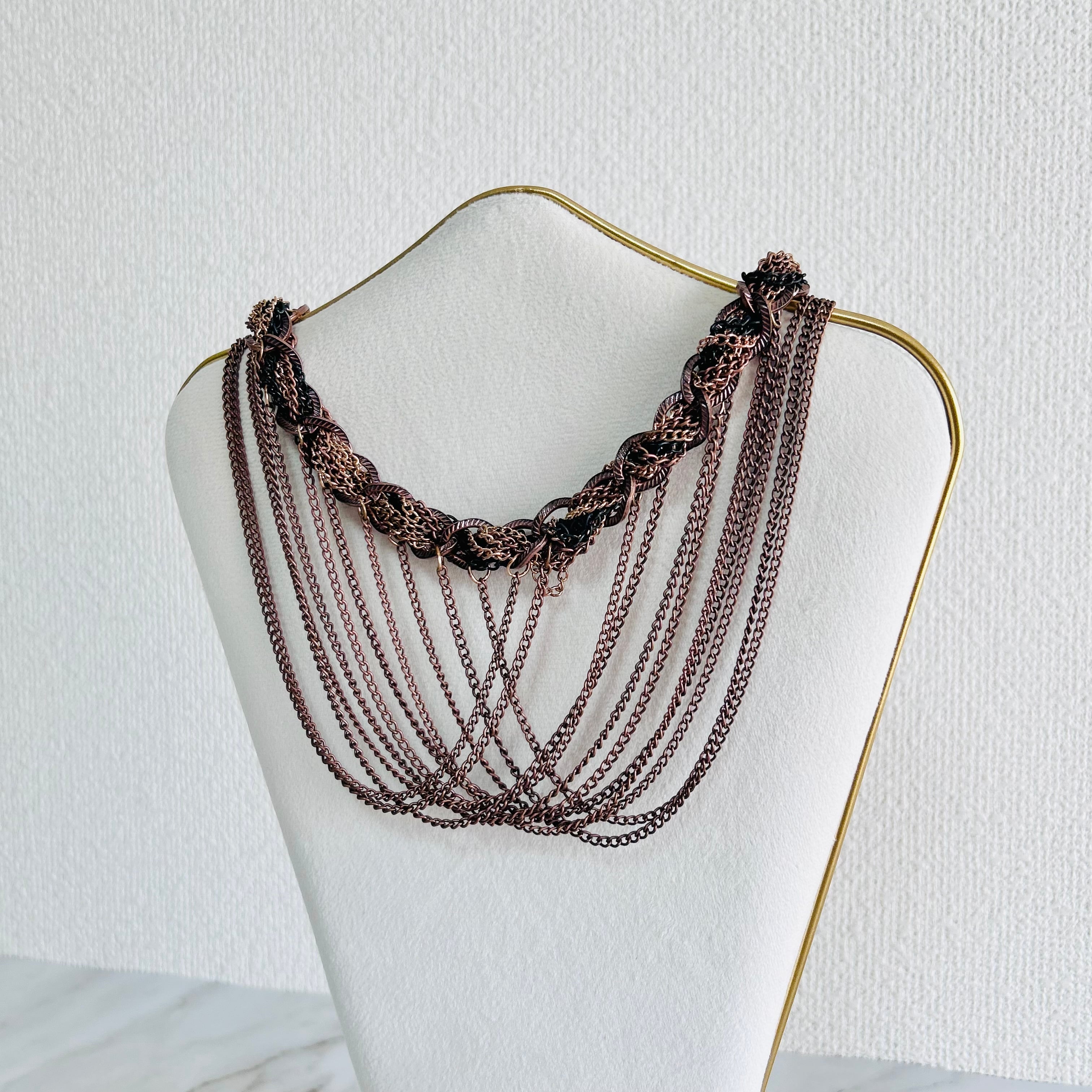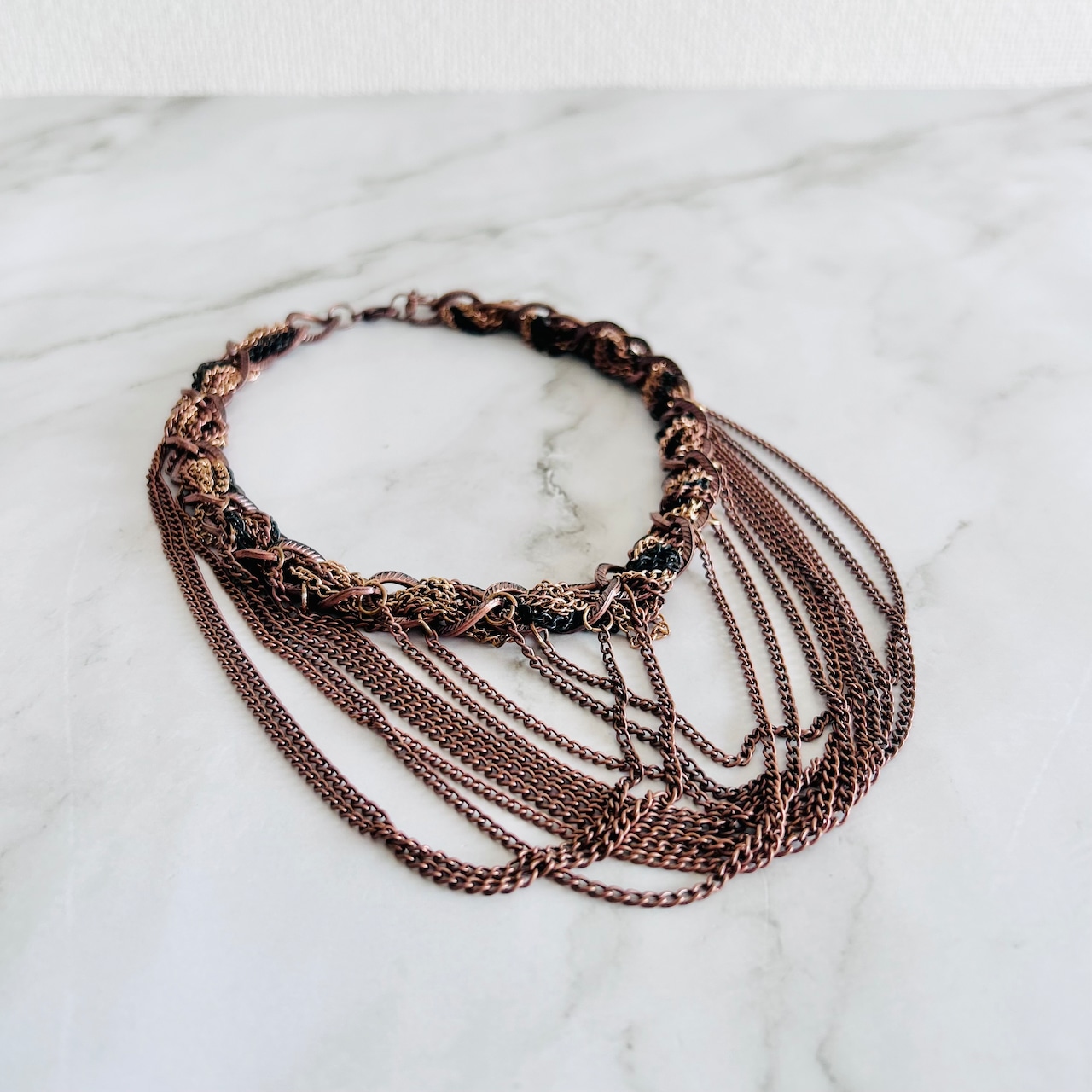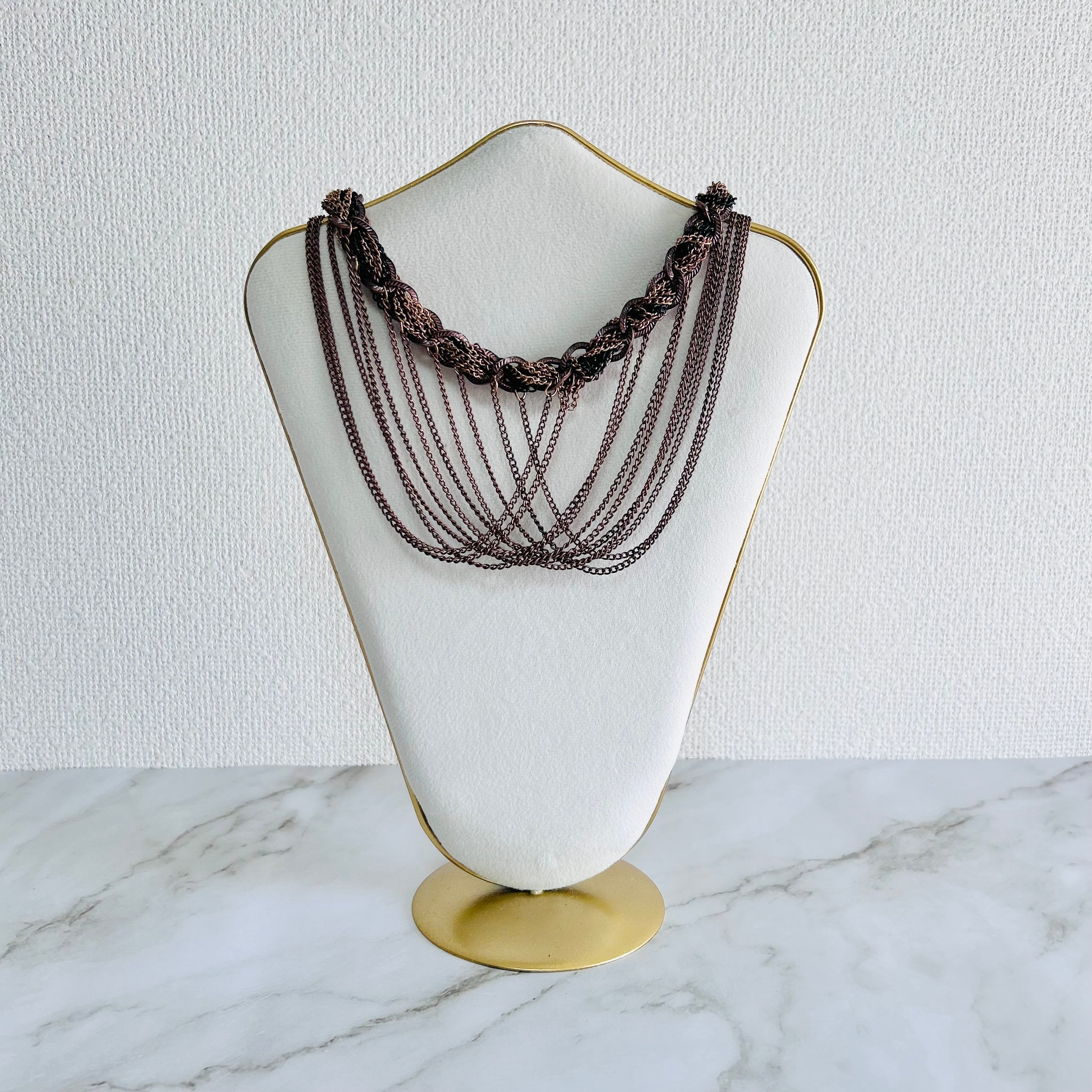 深みのあるブロンズカラーのチェーンを贅沢に編み込み、幾重にも重ねた存在感あふれるチェーンネックレスです。