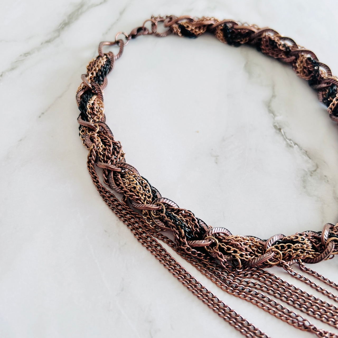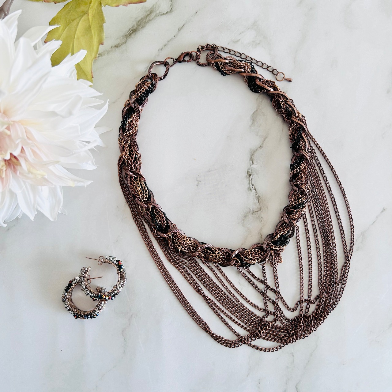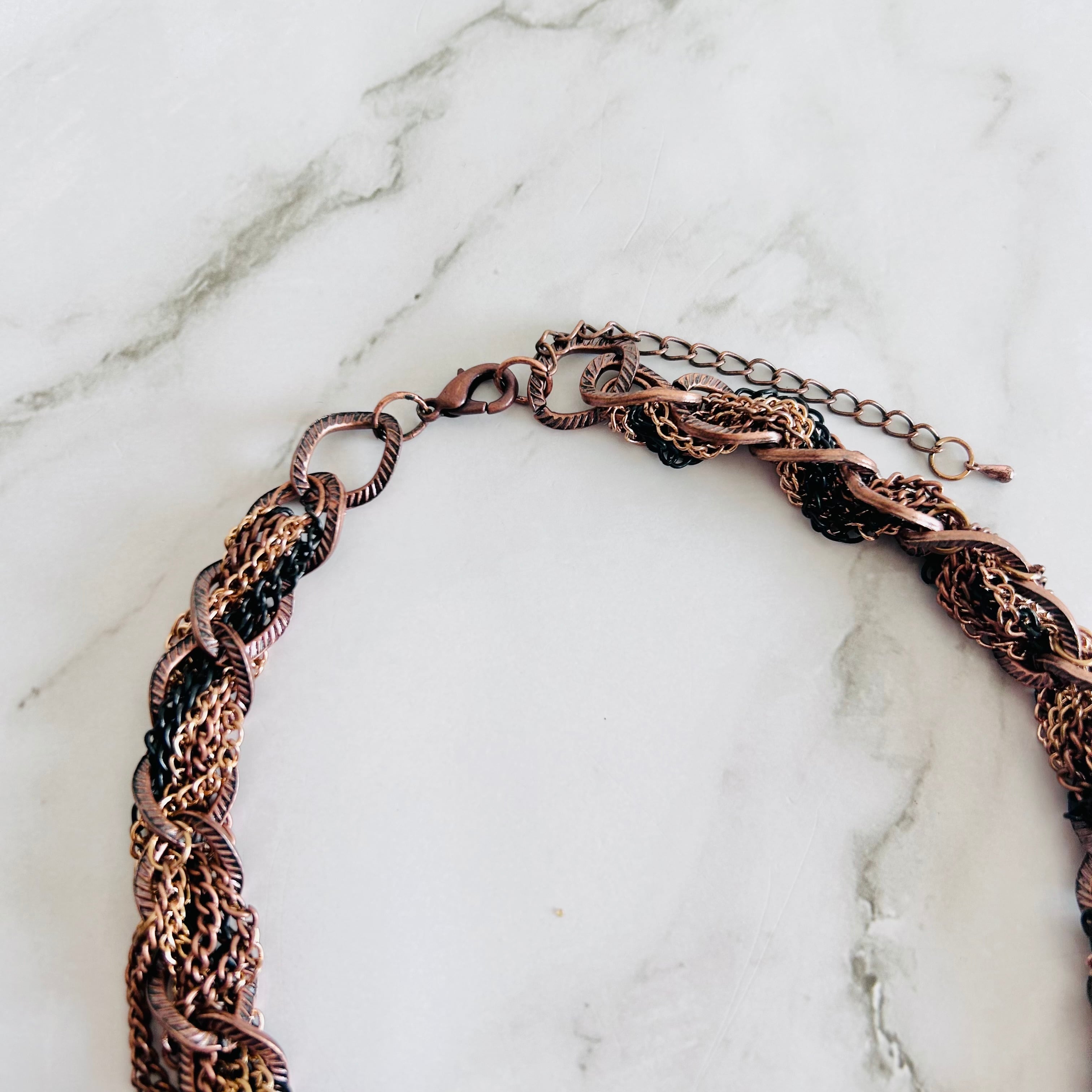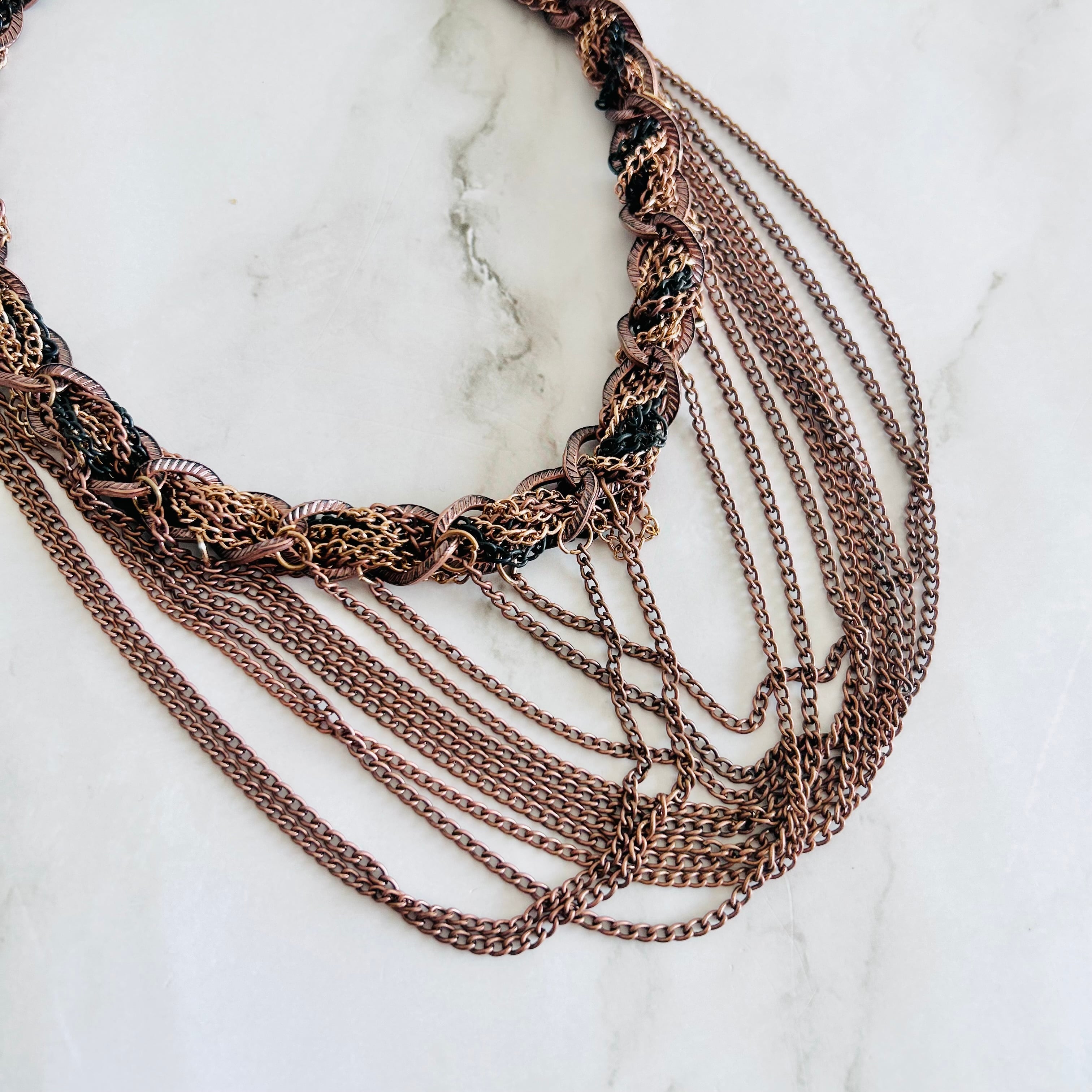 深みのあるブロンズカラーのチェーンを贅沢に編み込み、幾重にも重ねた存在感あふれるチェーンネックレスです。
