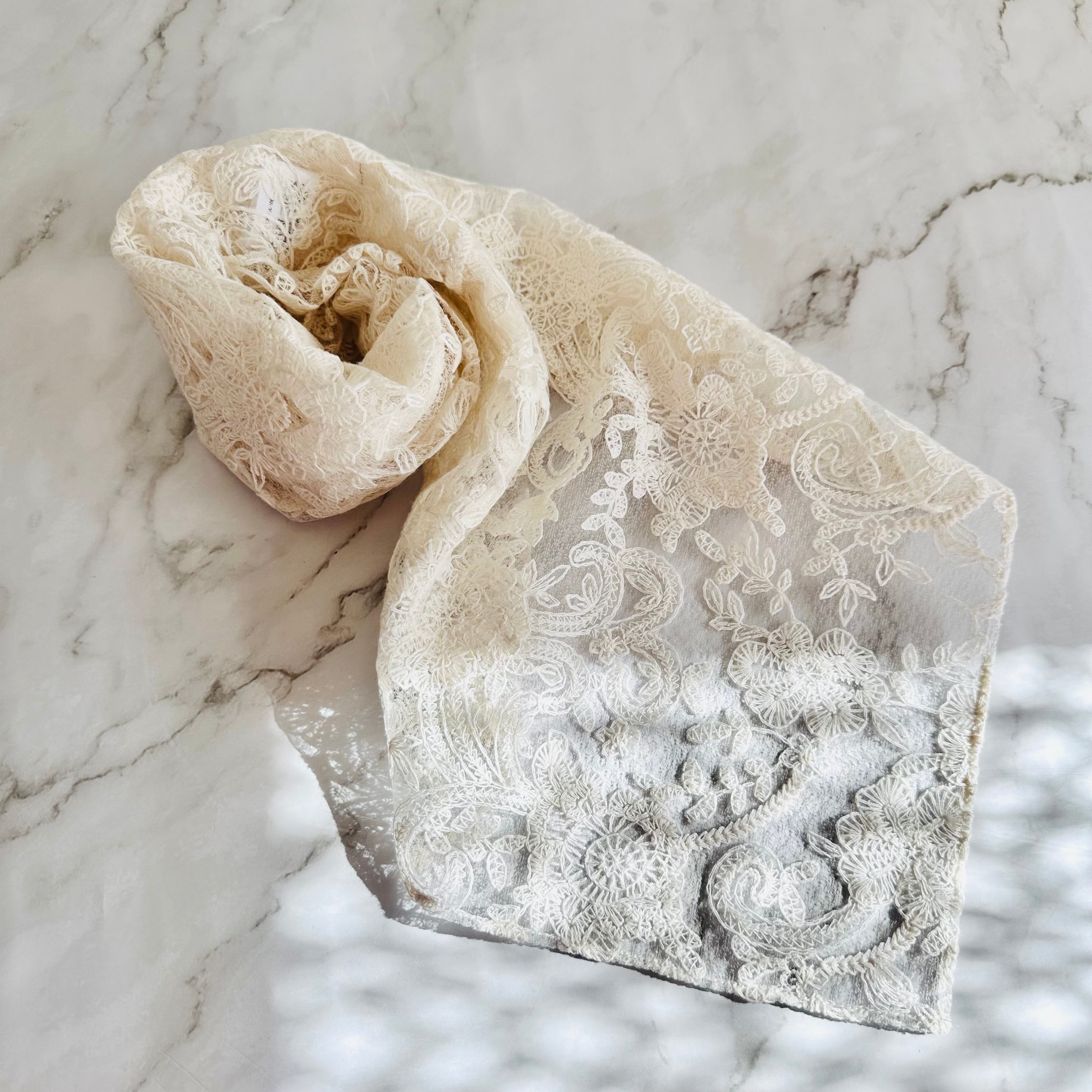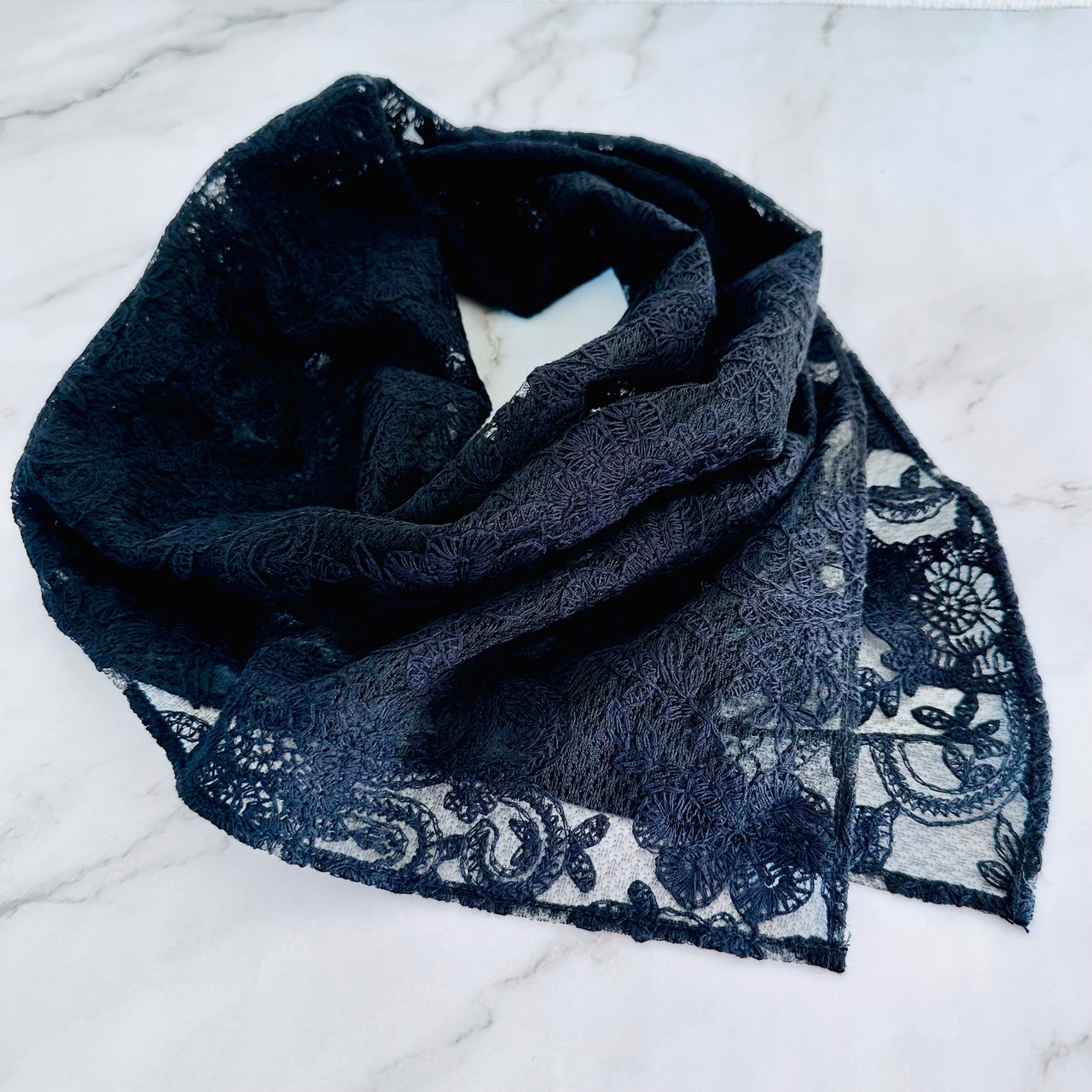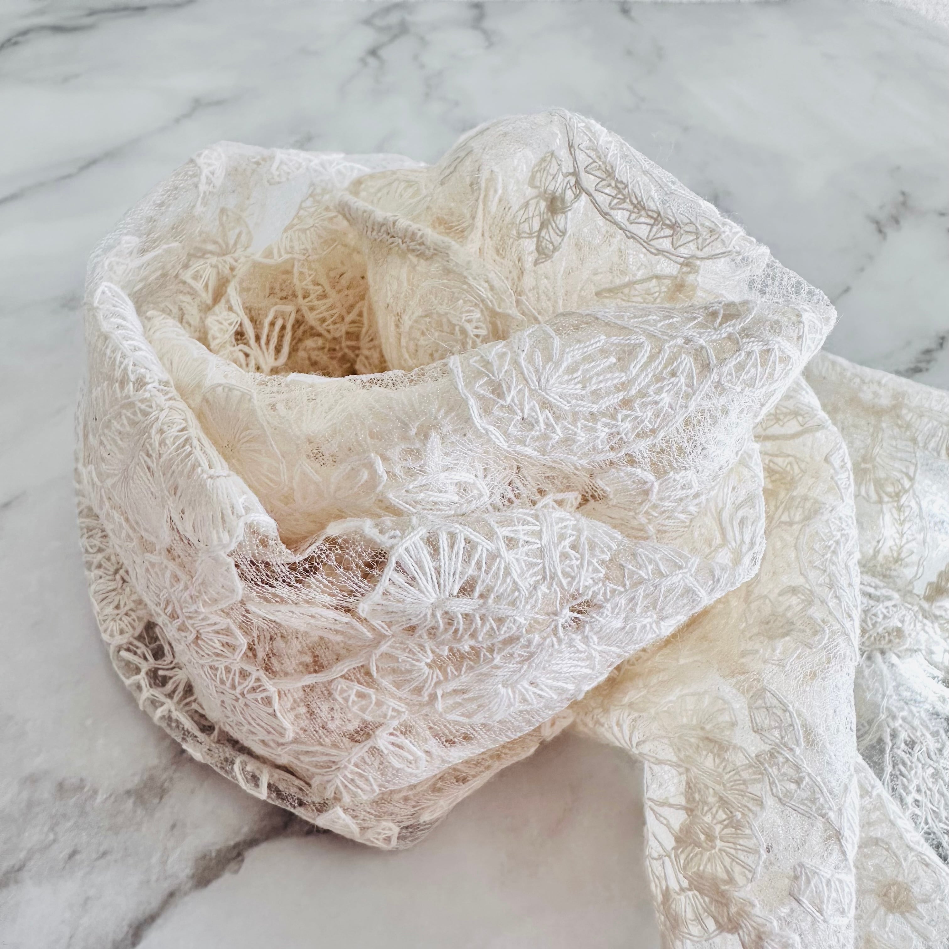 繊細なレースがふわりと光をまとう、エレガントなレーススカーフ。