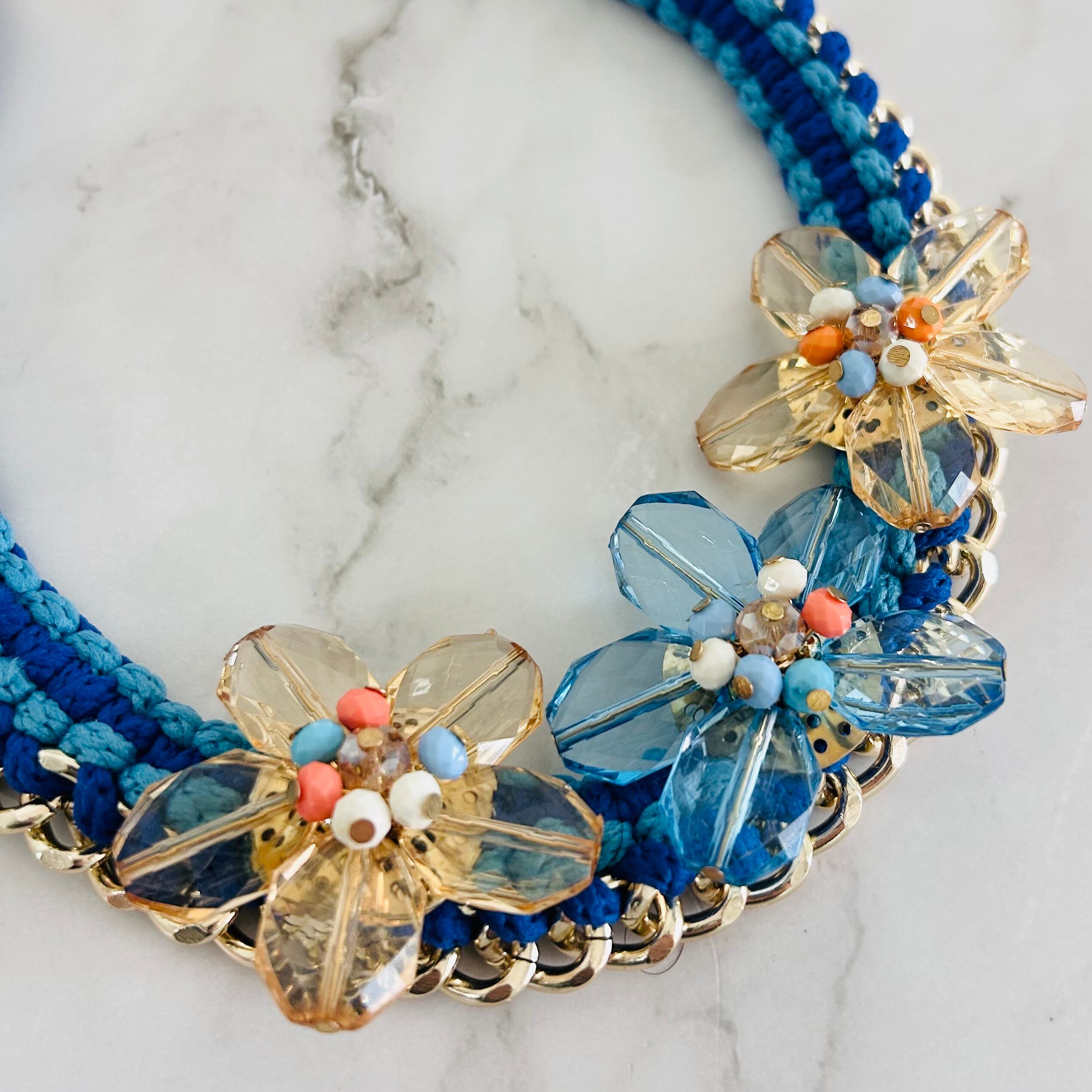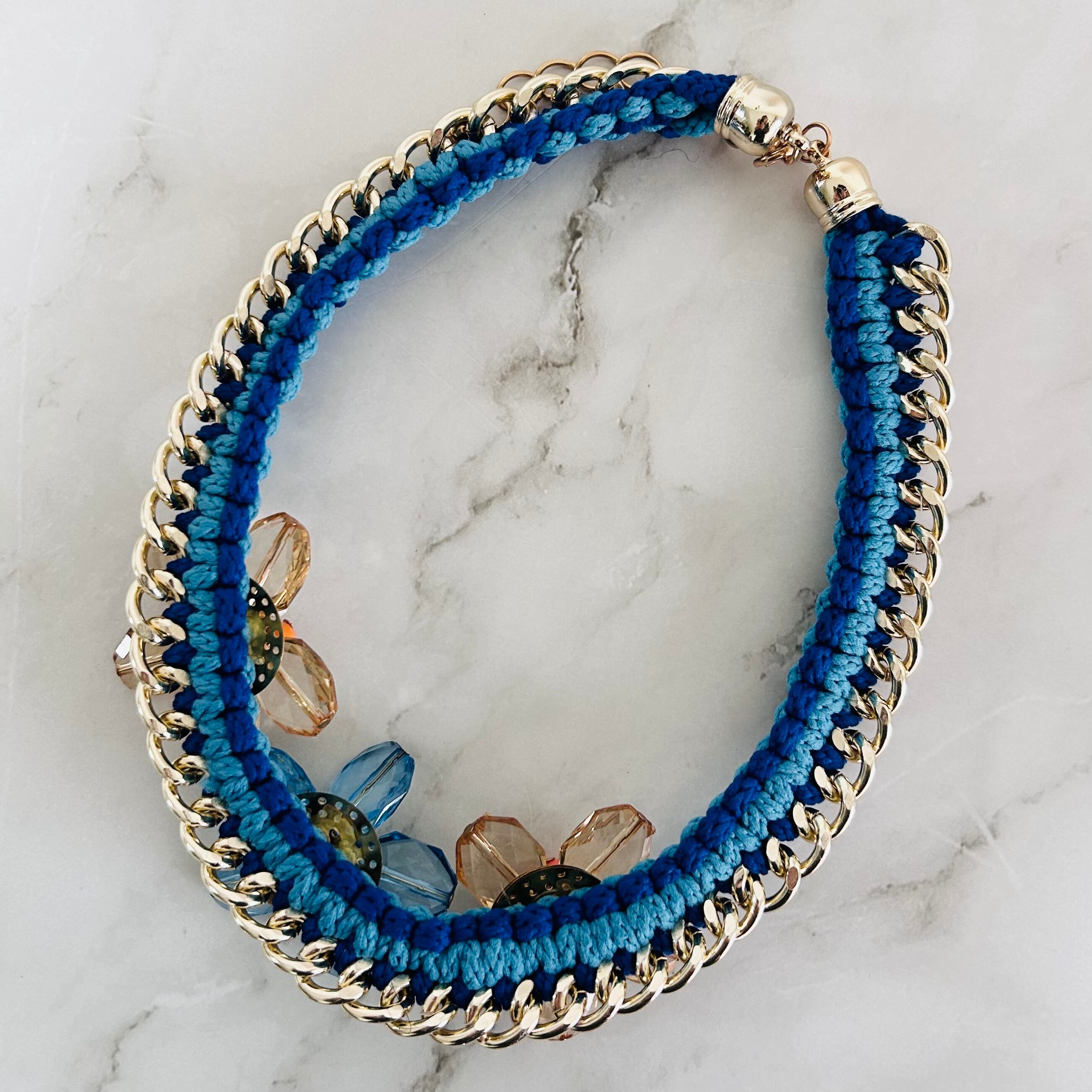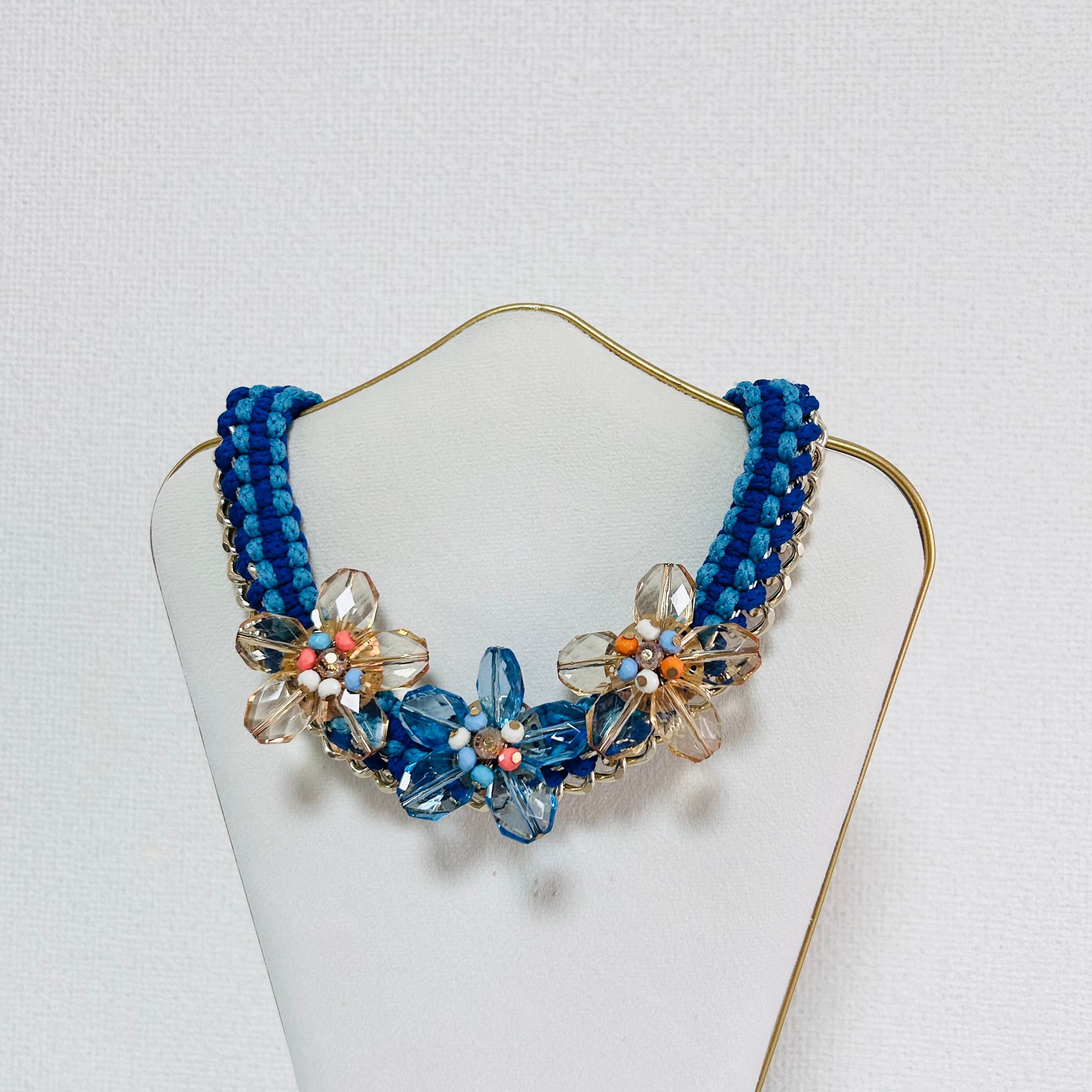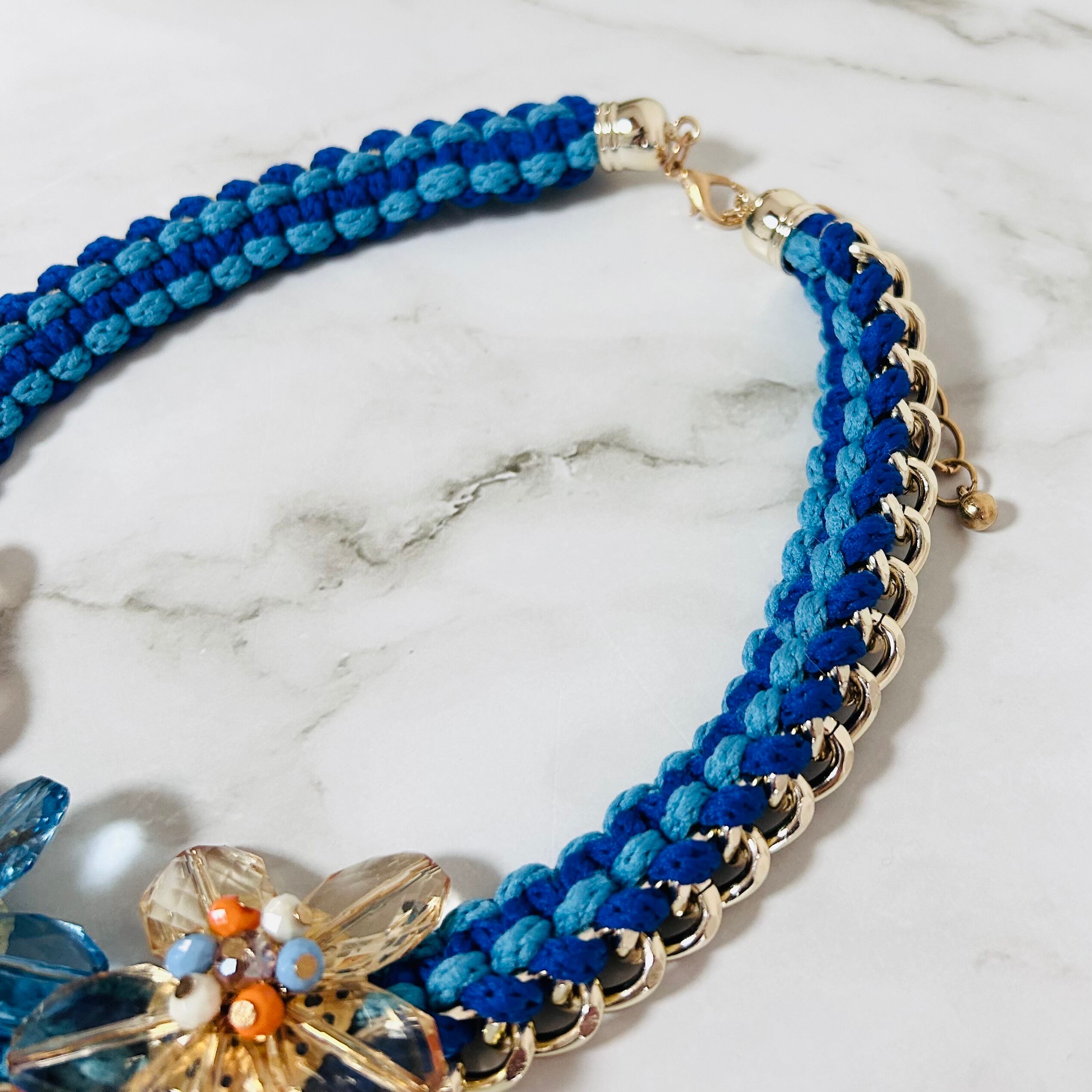 2色の鮮やかなブルーのコードをチェーンに編み込み、フラワーモチーフを取り付けた、存在感溢れるネックレスです。