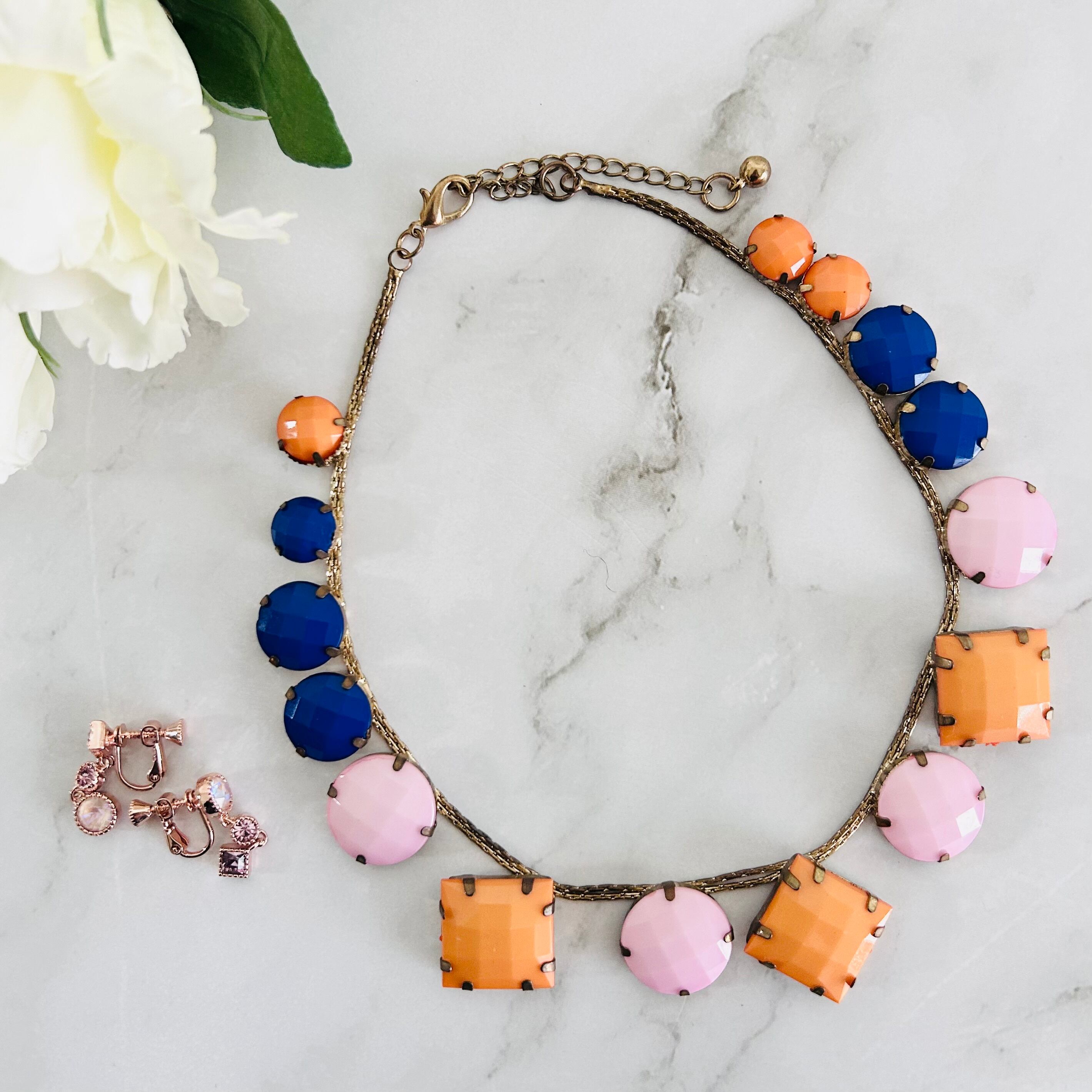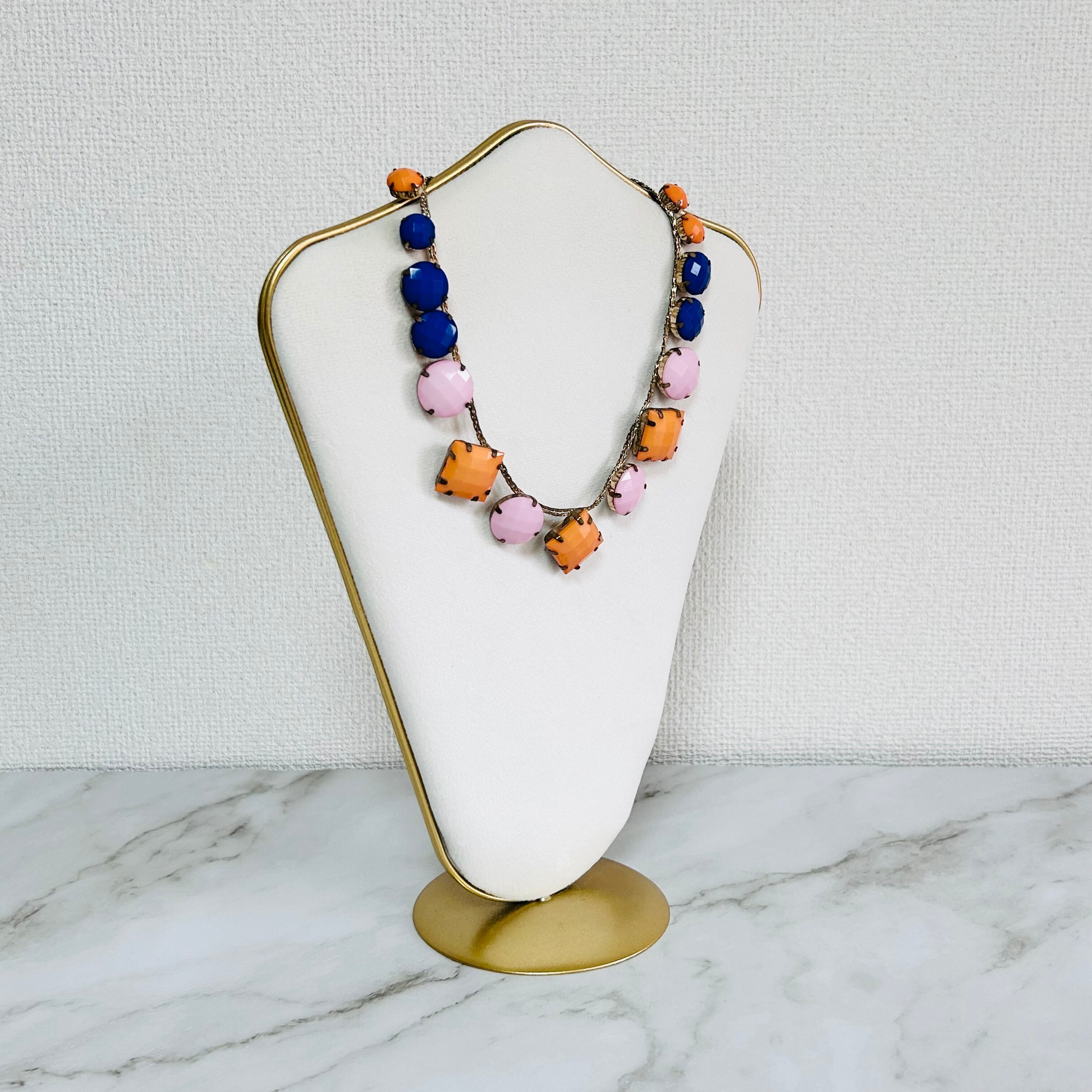 ロイヤルブルー、柔らかなピンク、鮮やかなオレンジが連なる、アートピースのような存在感のネックレスです。