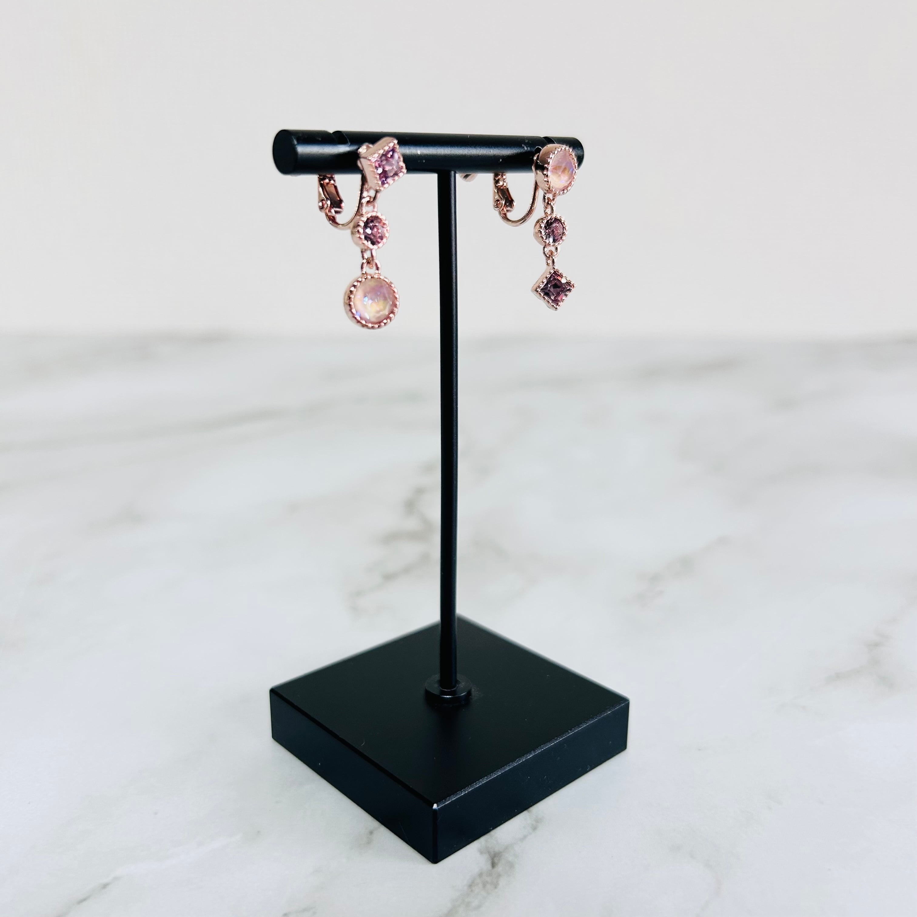ローズゴールドのフレームに、透明感あふれるラベンダー・オーロラカラーのクリスタルが瑞々しく揺れ、大人の横顔にそっと品を添えます。