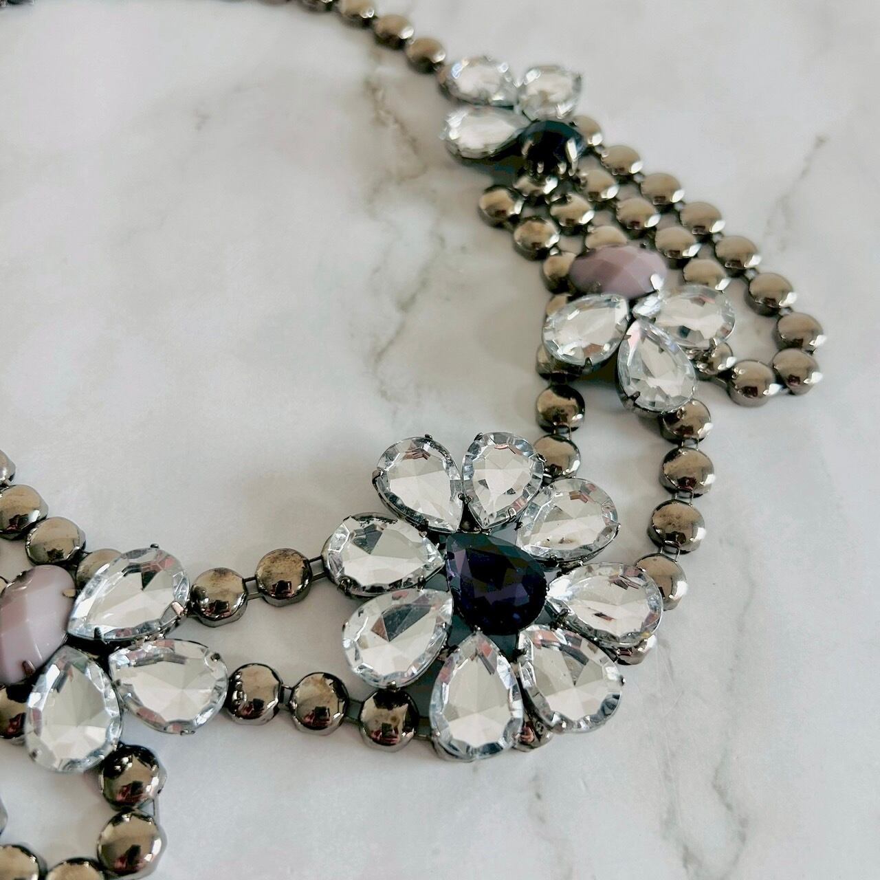 艶やかなダークトーンのビーズに、クリスタルのフラワーモチーフをあしらった、印象的なネックレスです。