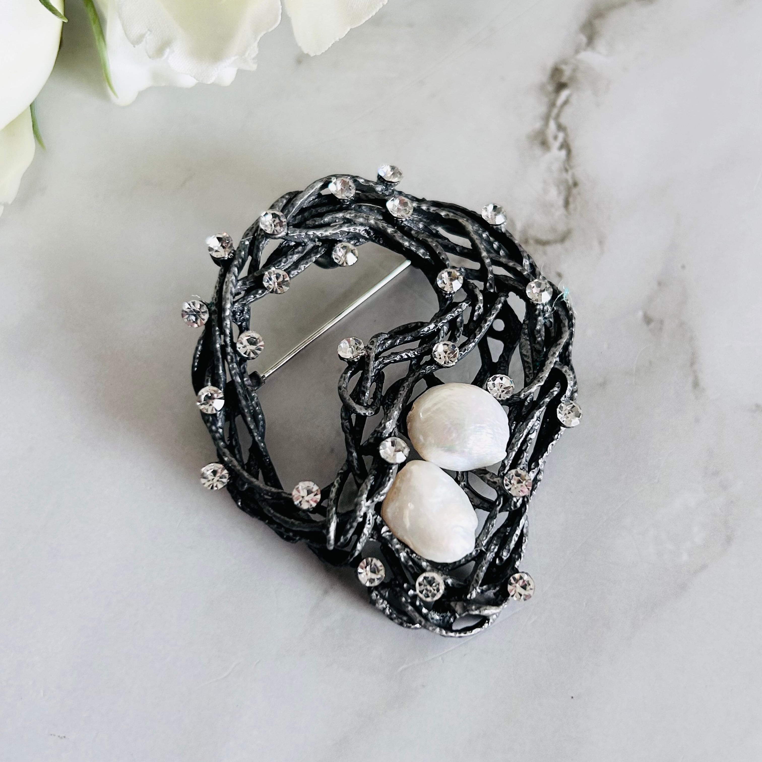 編み込んだような立体的なフレームに、大小のビジューパーツと天然のバロックパールが煌めきを添えるエレガントなブローチです。
