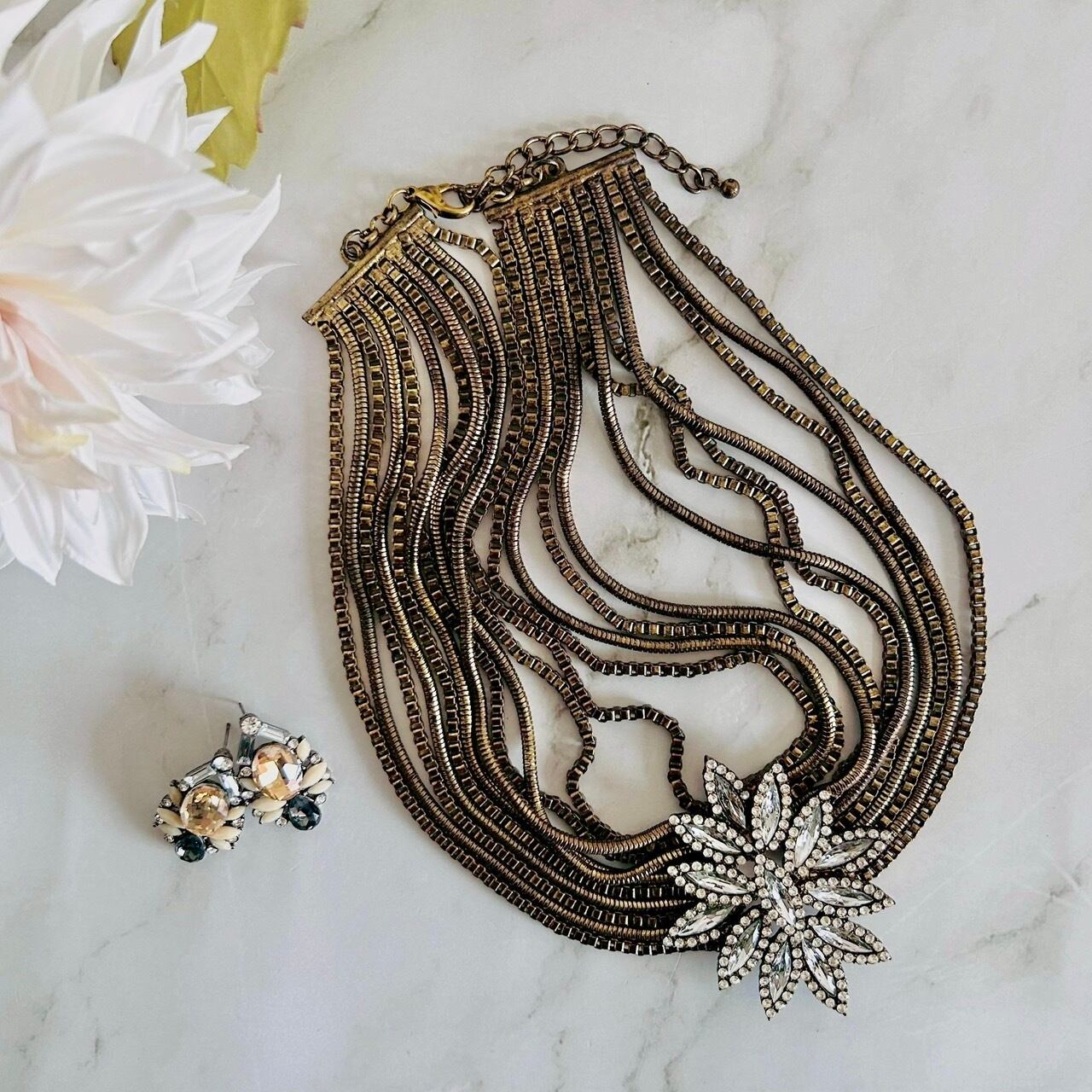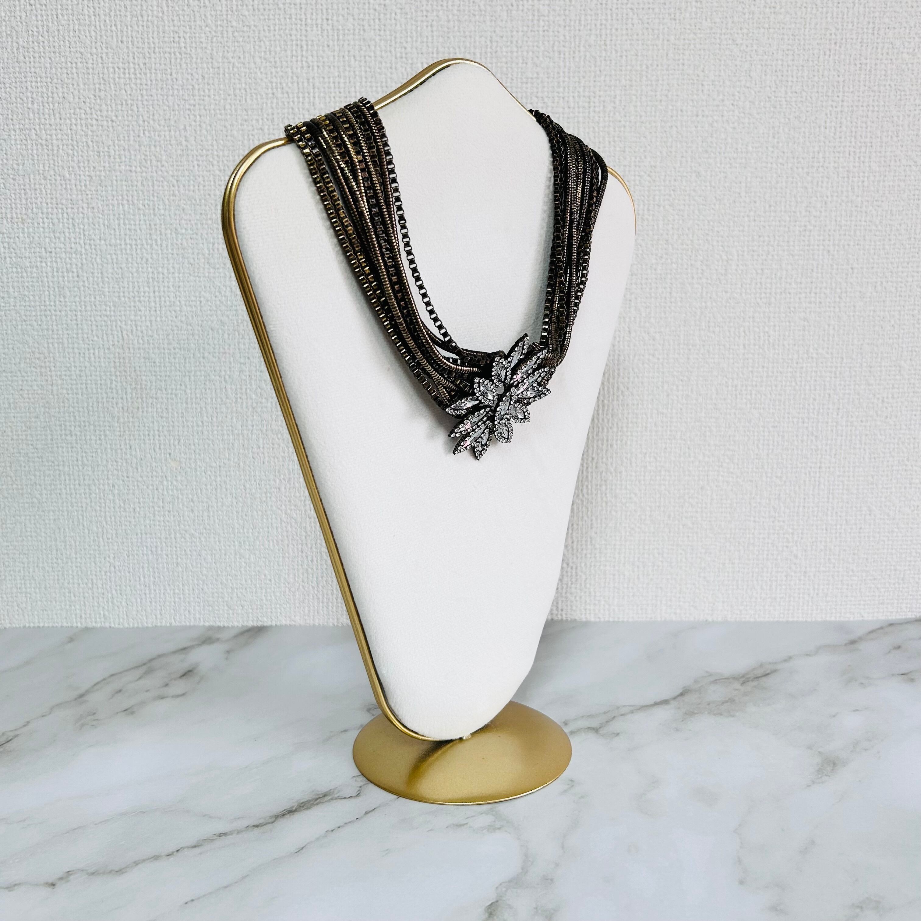 重厚感のあるアンティークゴールドのチェーンを幾重にも重ね、華やかなトップが目を惹く、胸元にドラマティックな陰影を生み出すネックレスです。