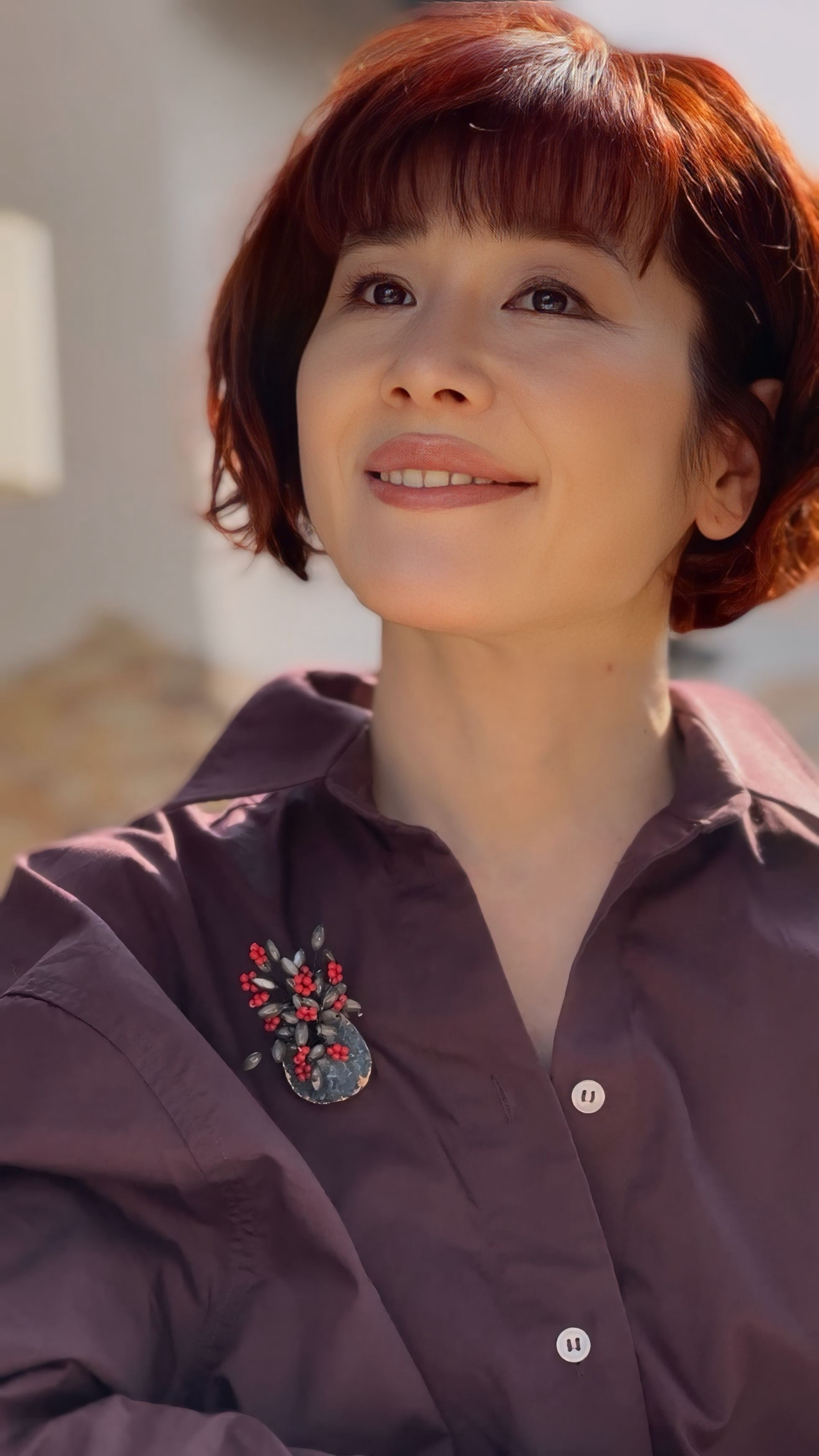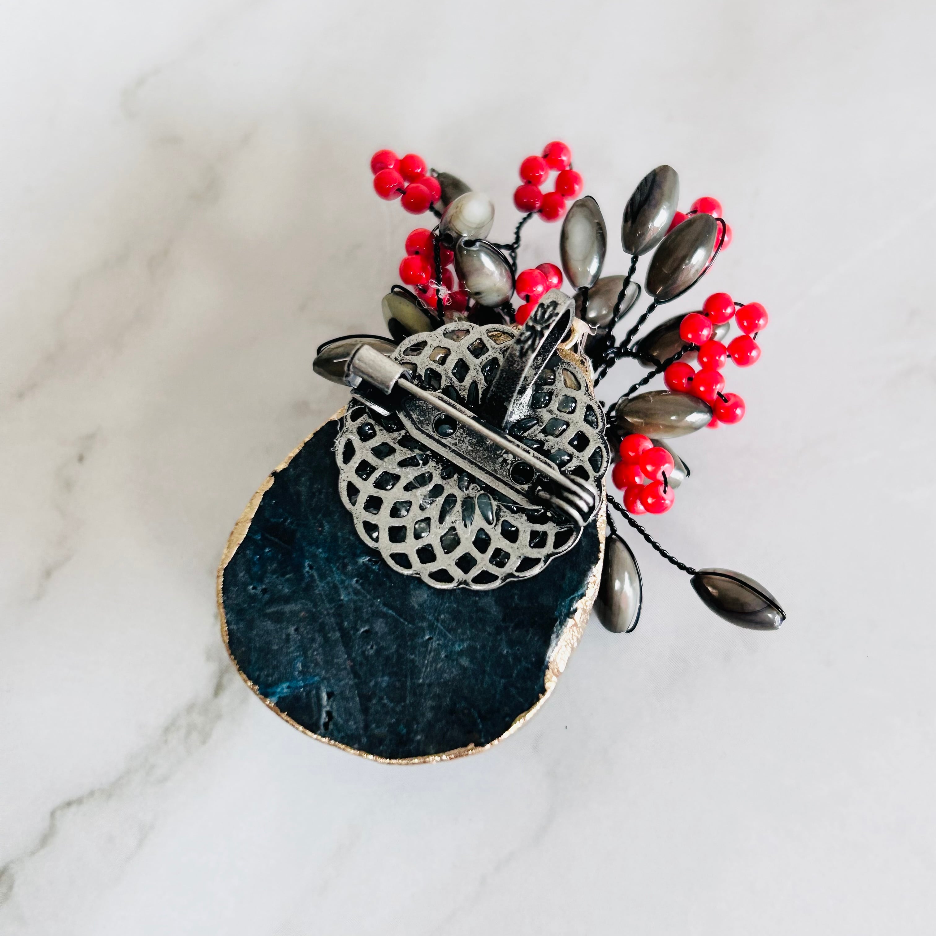 艶めくグレートーンのシェルパーツと、鮮やかな赤のコントラストが美しく、コートやニットに添えるだけで季節の装いにぬくもりを運んでくれます。