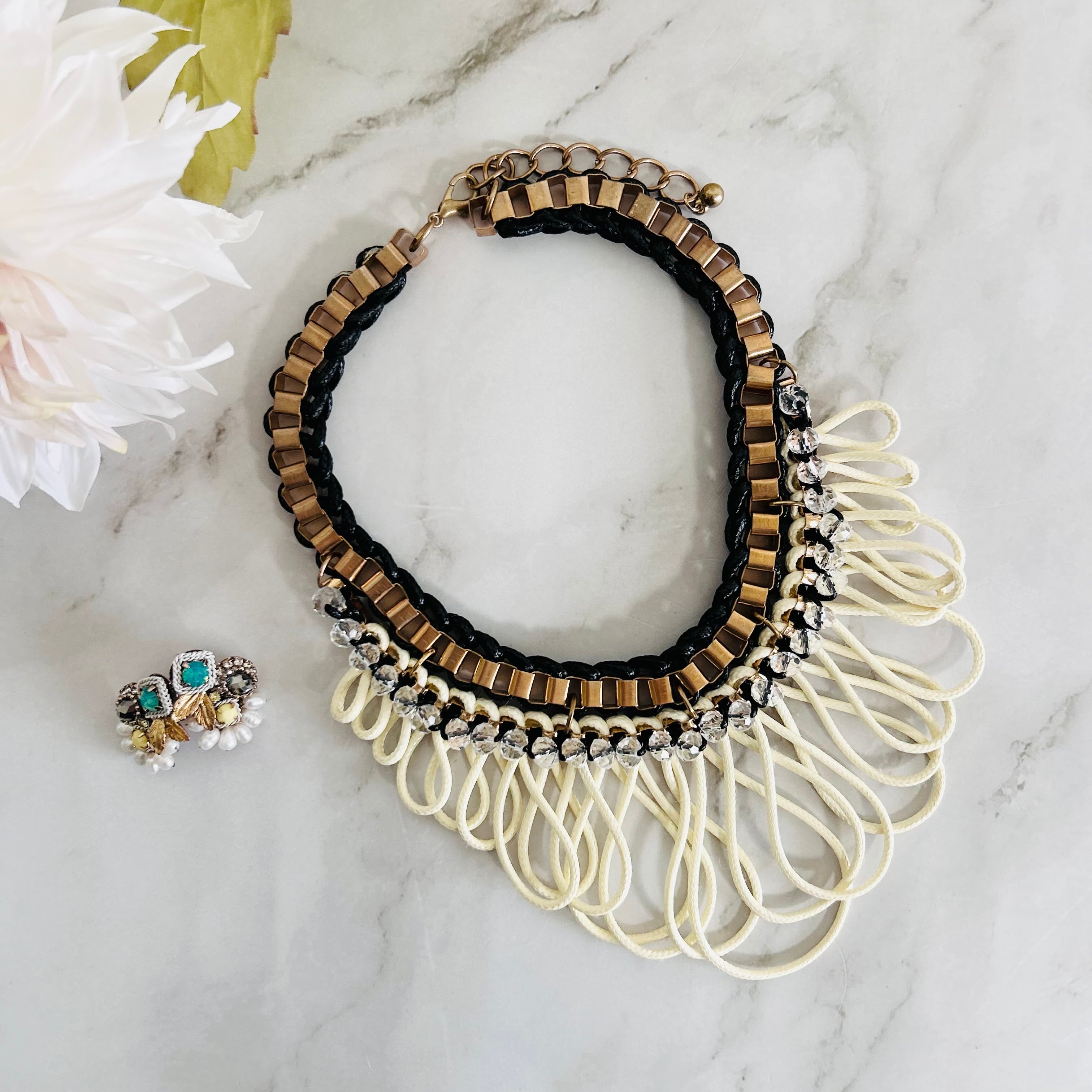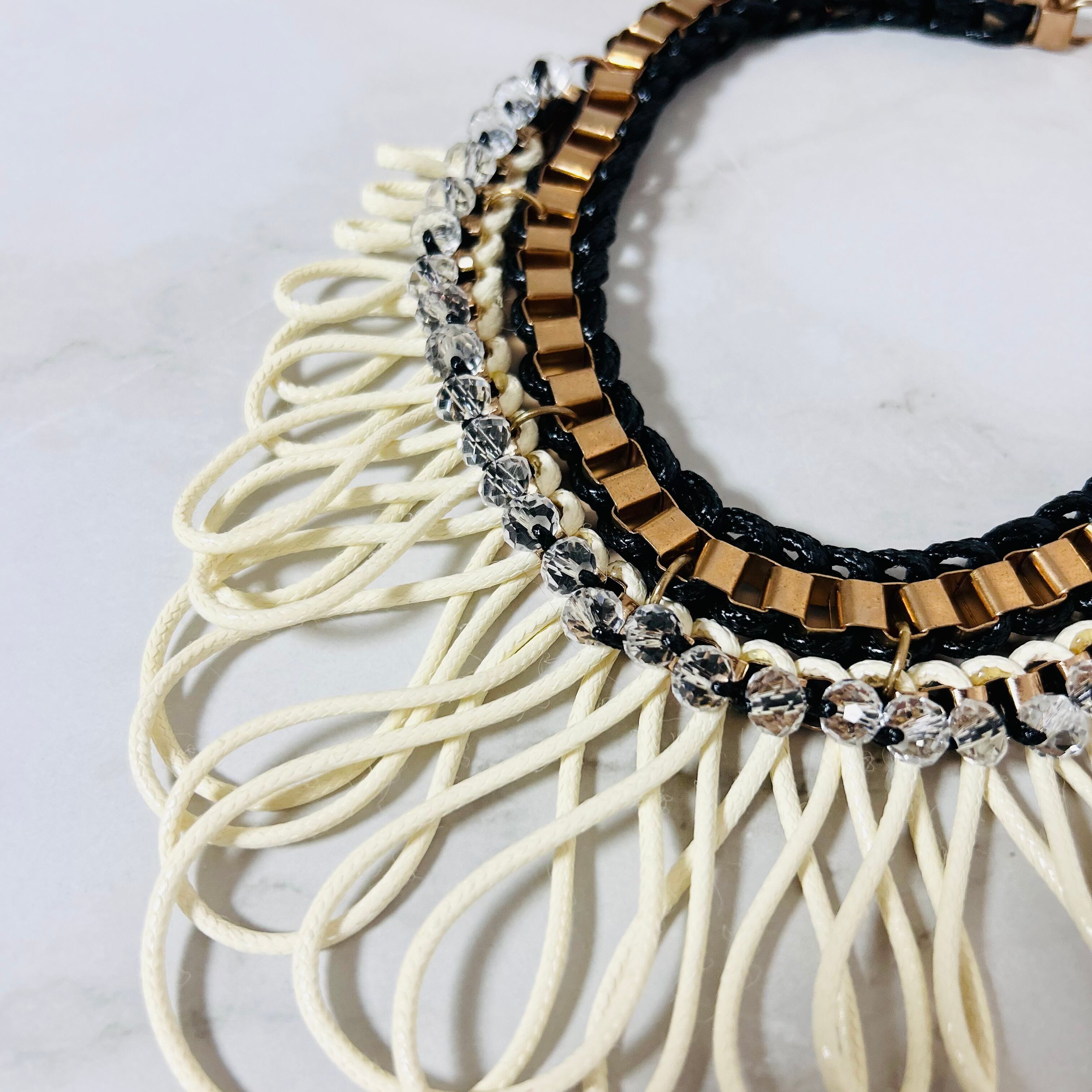 アンティークゴールドのスクエアチェーンにブラックコードを編み込み、フロントにはクリアビーズをあしらった上質なデザイン。