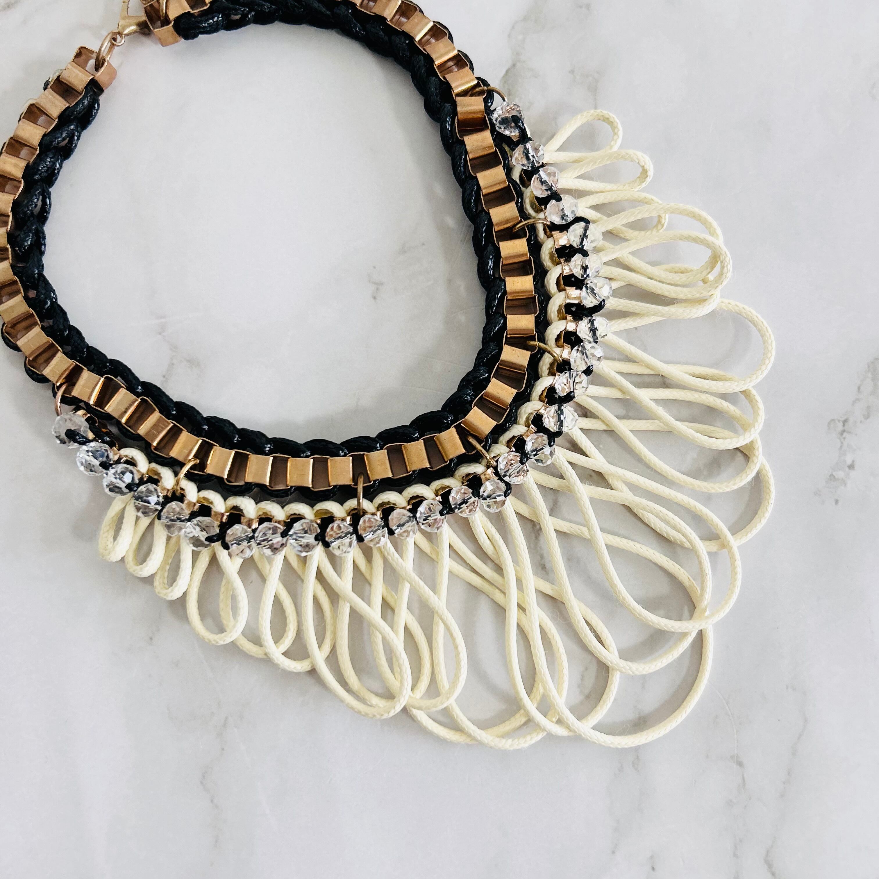 アイボリーのコードで描く立体的なループモチーフが広がり、他にはない存在感を放つネックレスです。
