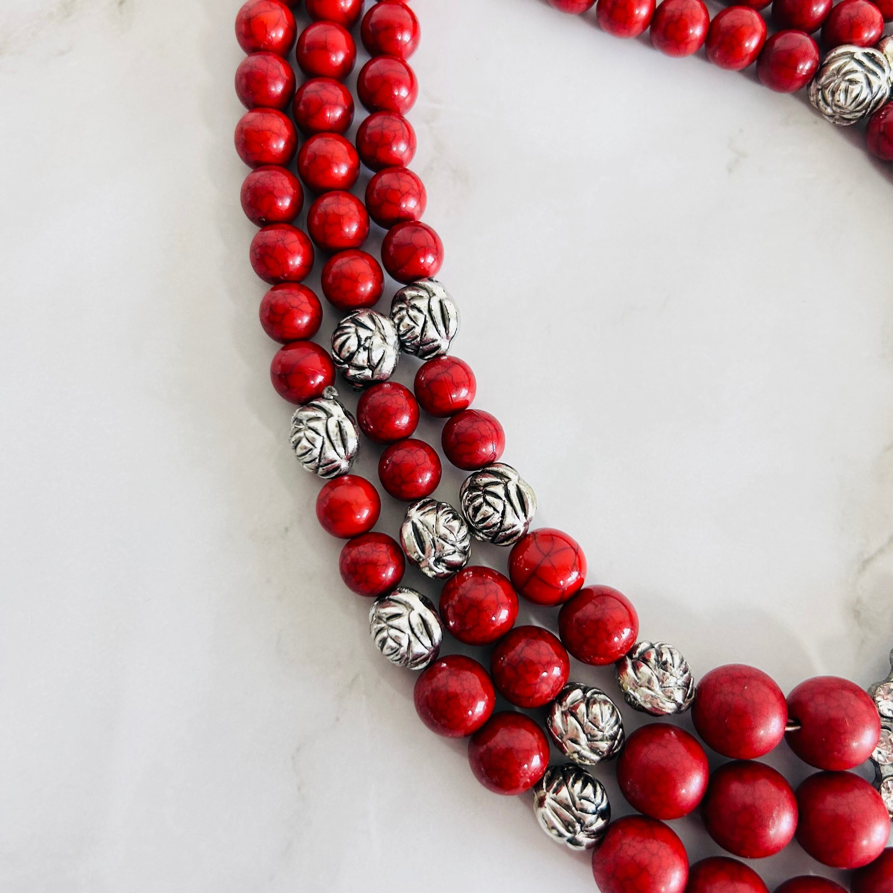 深みのあるレッドビーズを贅沢に連ね、中央にはビジューパーツが敷きつめられたエレガントなモチーフをあしらった3連ネックレスです。
