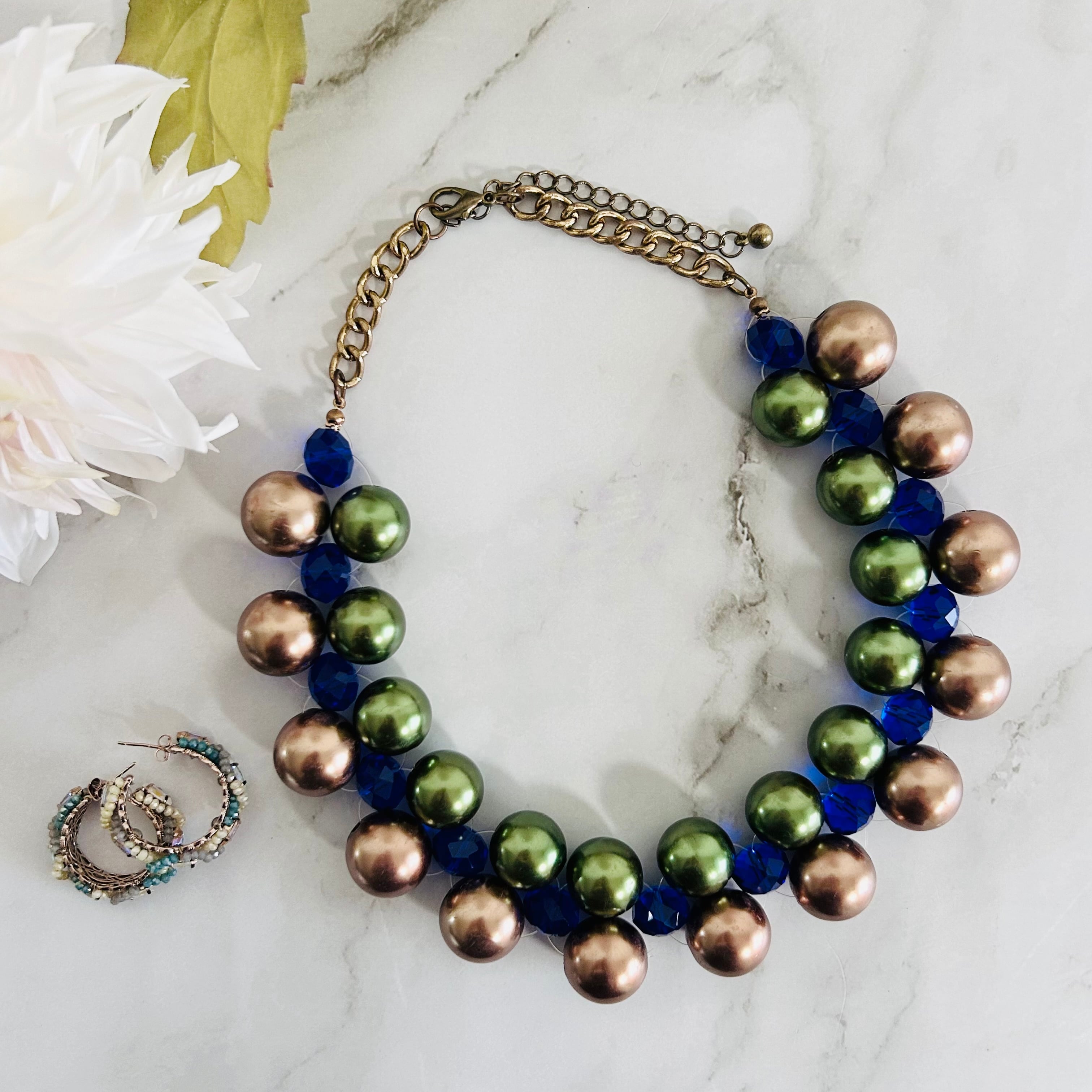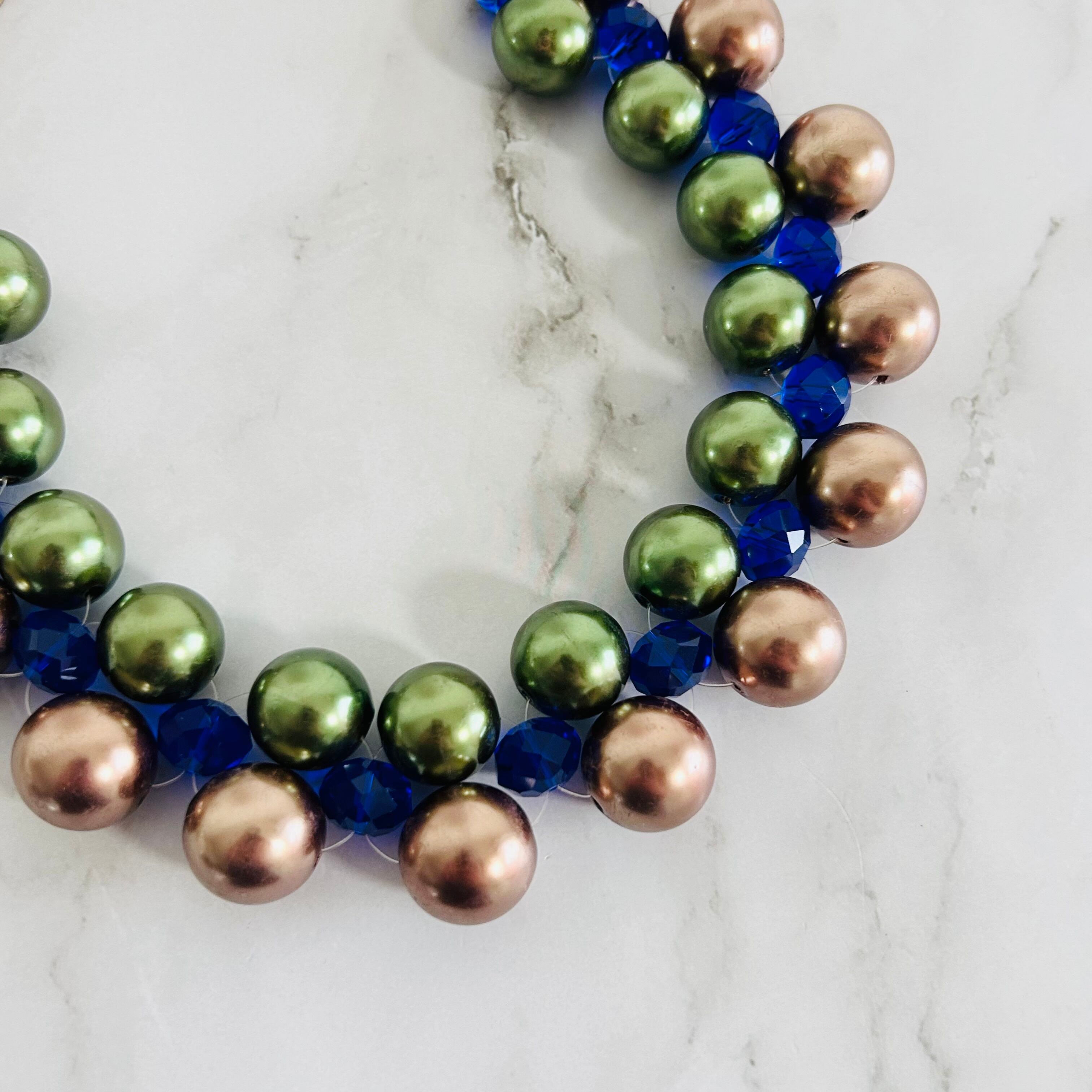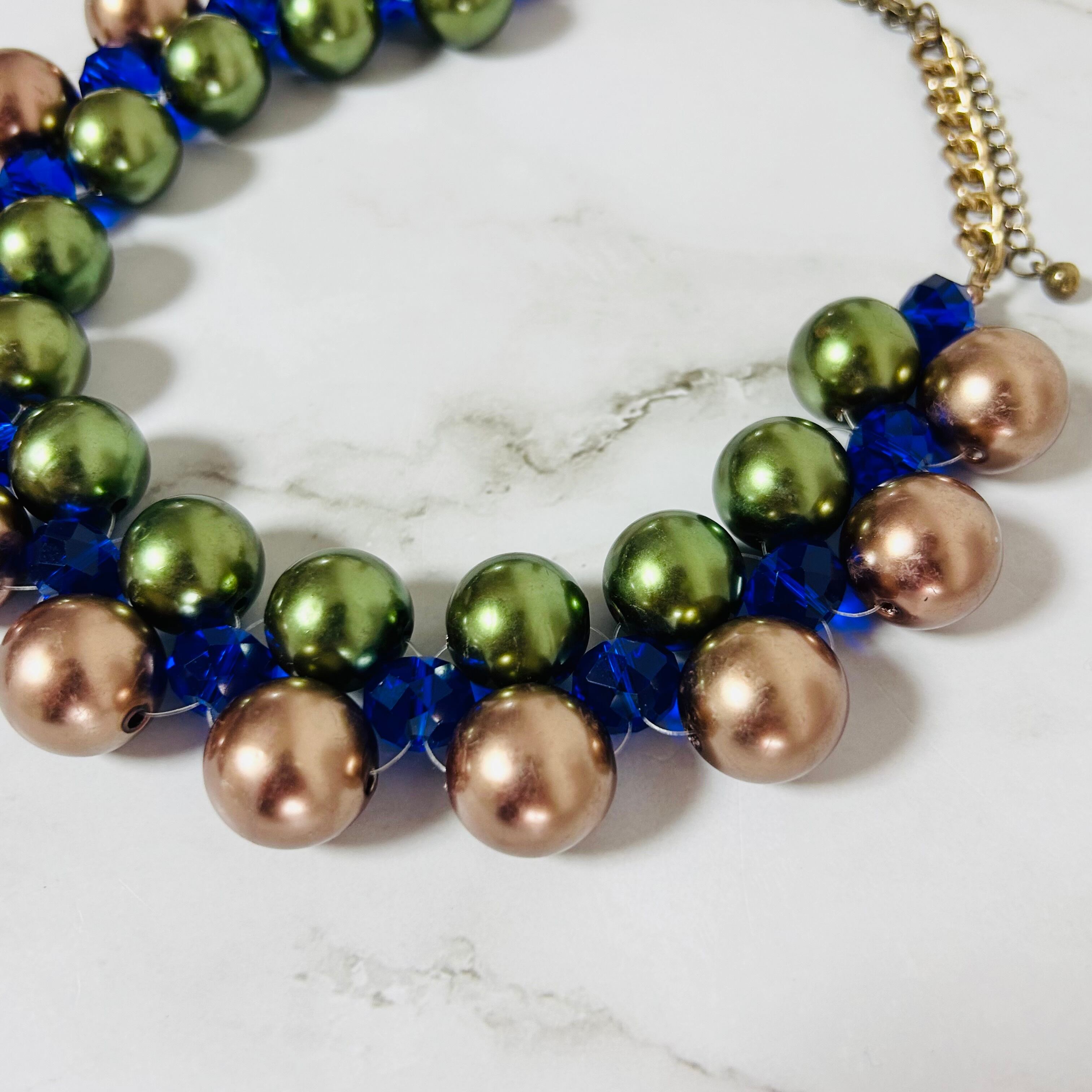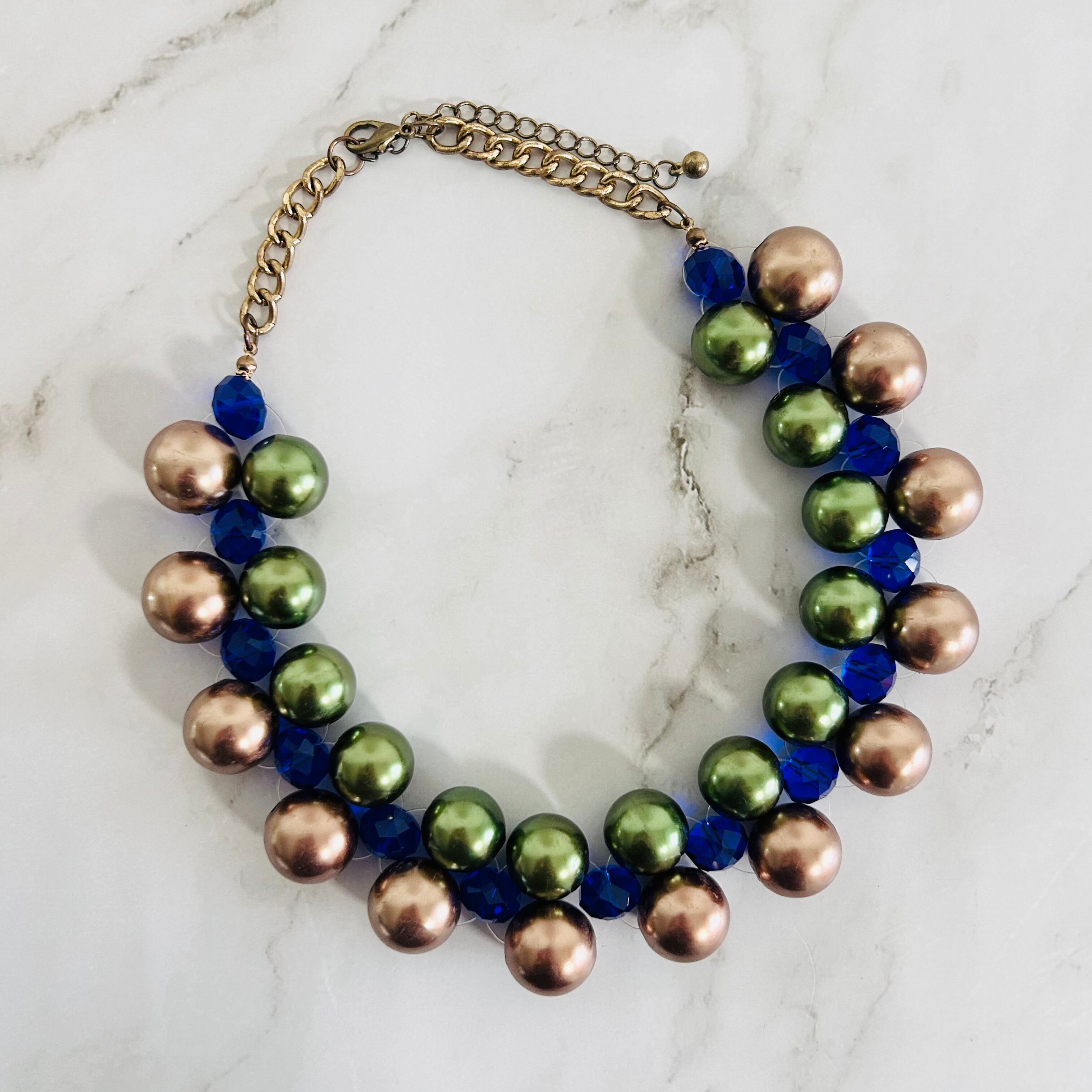 ブロンズカラーのラウンドビーズに、メタリックなオリーブグリーン、そして透明感のあるロイヤルブルーのクリスタルビーズを組み合わせた、大人の遊び心あふれるネックレスです。