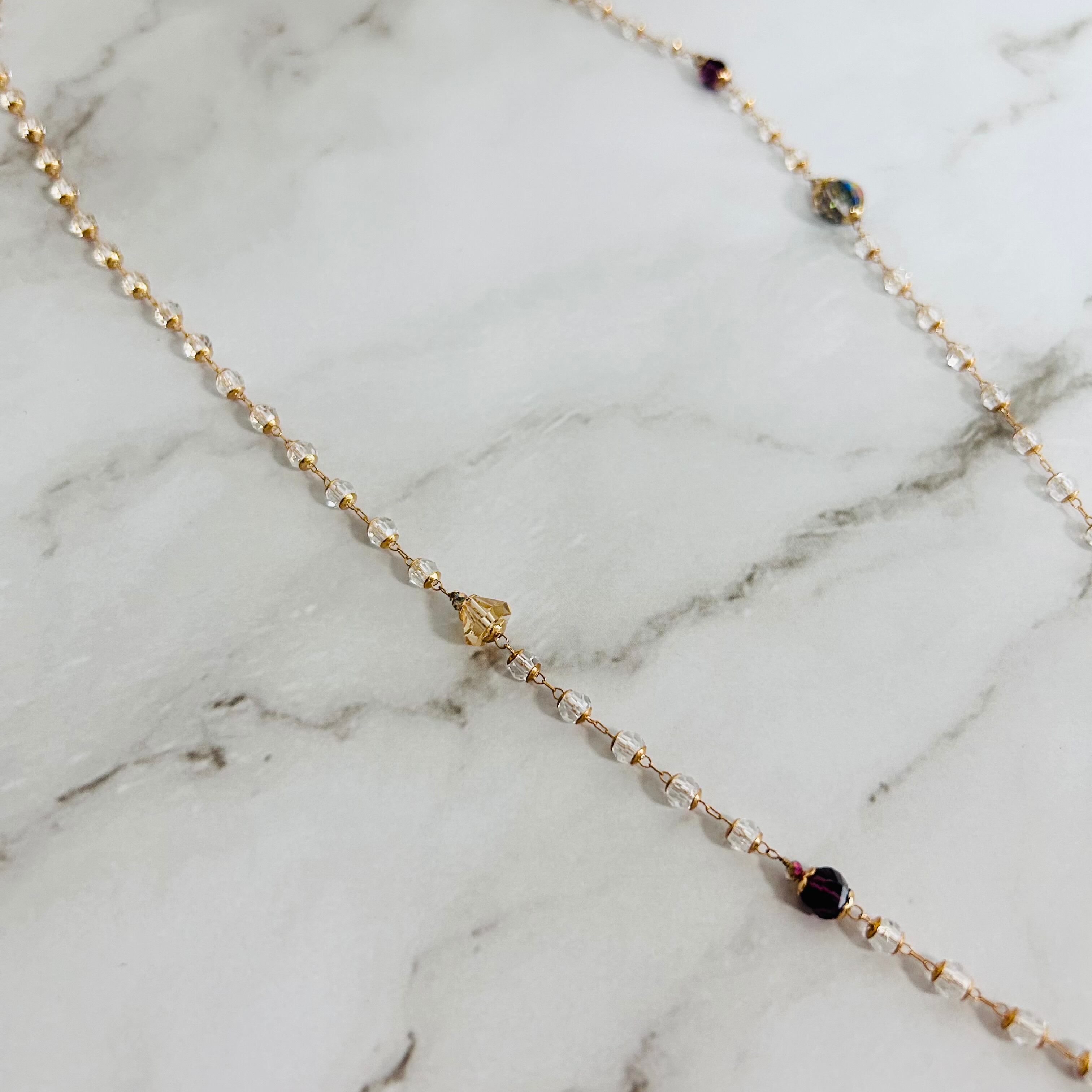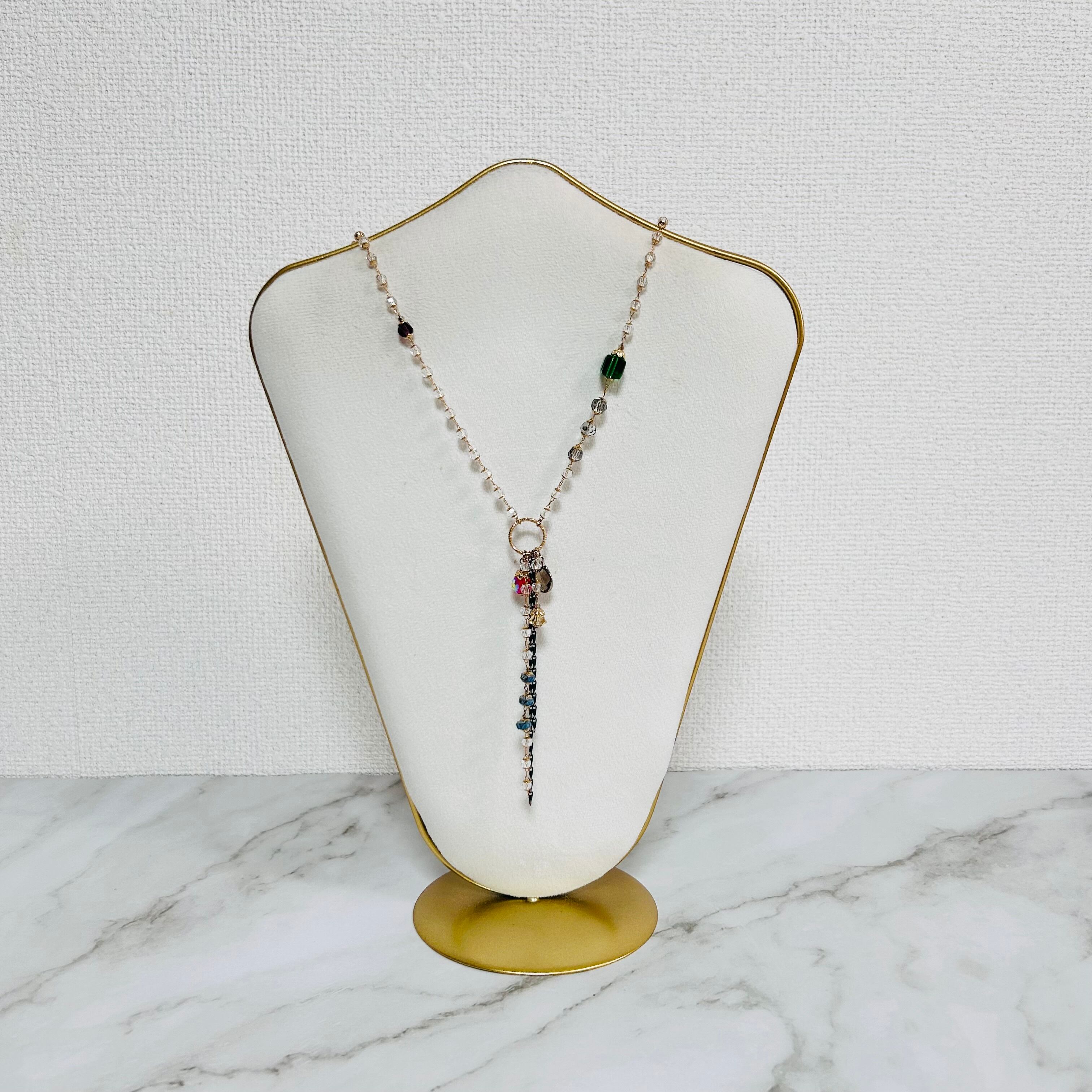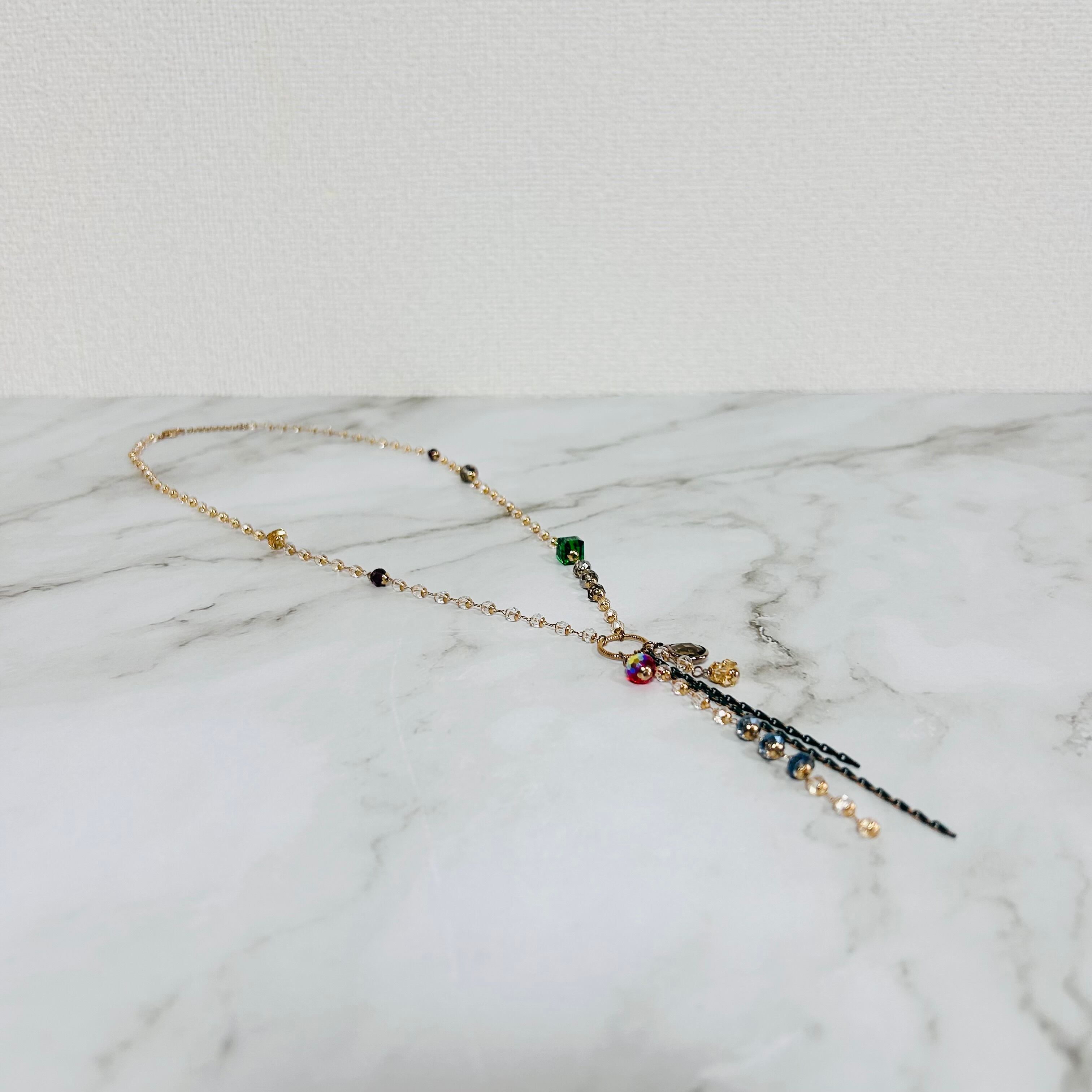 クリスタルビーズを細やかに連ねた華奢なチェーンに、グリーンやレッド、スモーキーブラウンのクリスタルチャームがアクセントとなる、表情豊かなラリエットネックレスです。