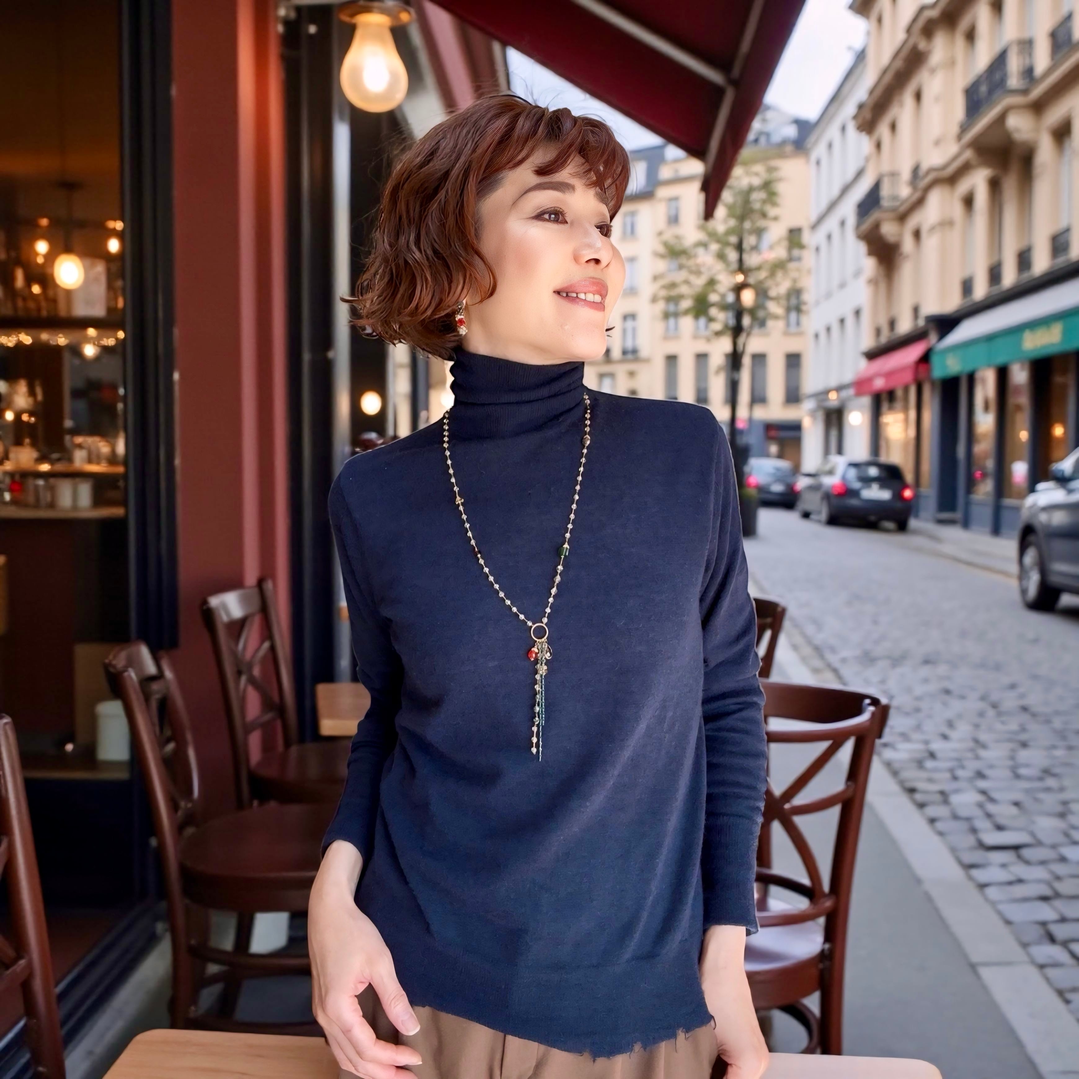 タートルネックとの相性も良く、胸元に揺れるモチーフがスタイル全体のバランスを美しく整えてくれます♪