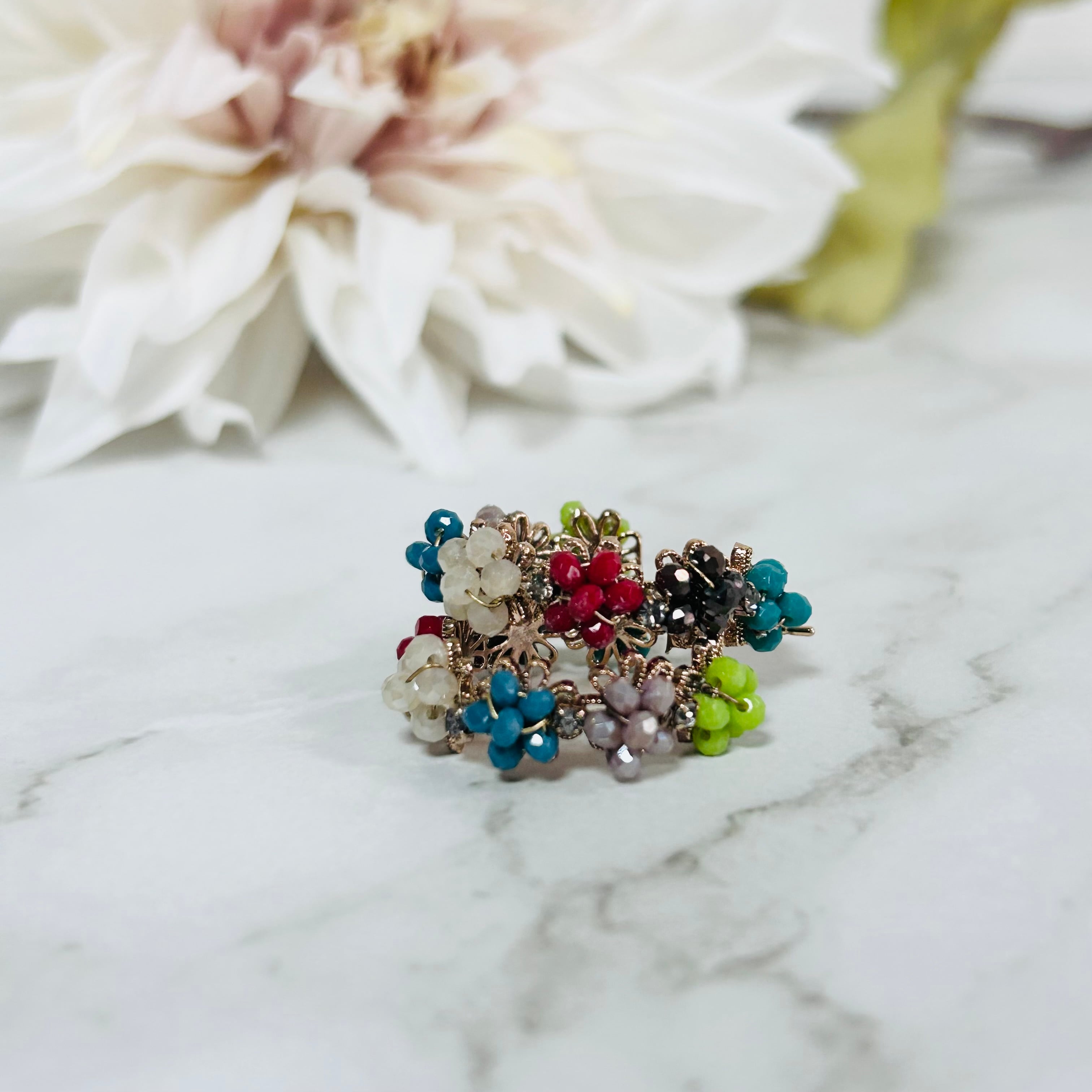 ブルー・レッド・ブロンズ・ホワイト・グリーン・グレーなど、カラフルなビーズがバランス良くミックスされ、明るく華やかな印象に!