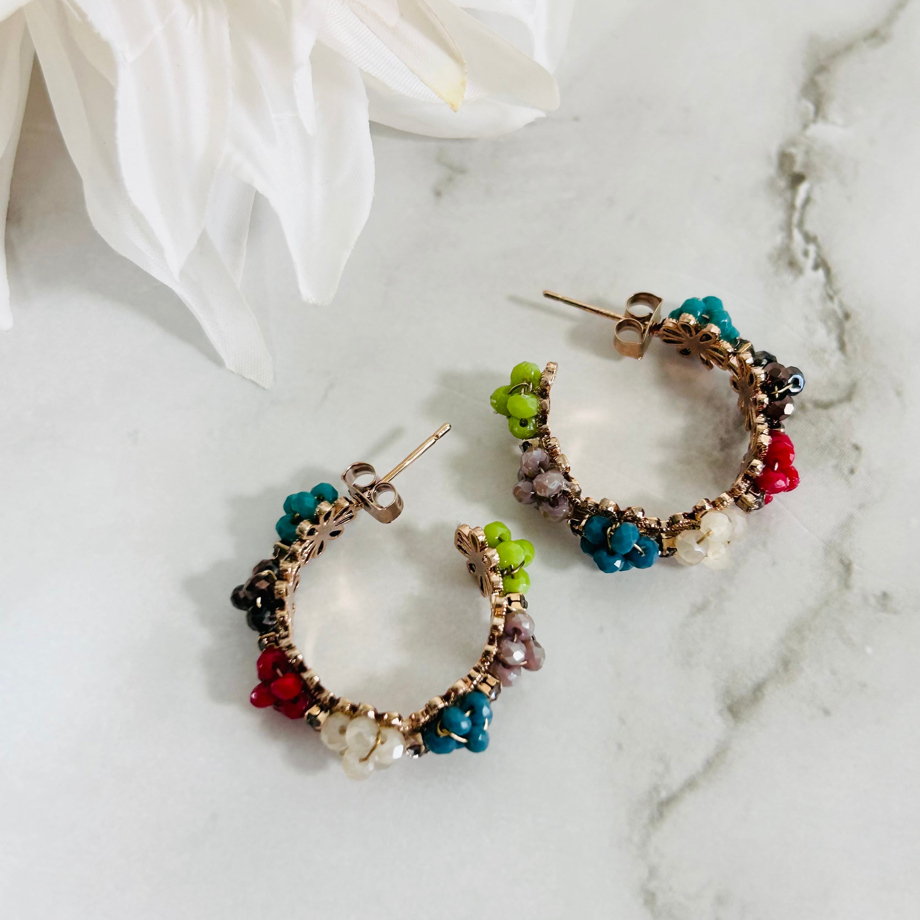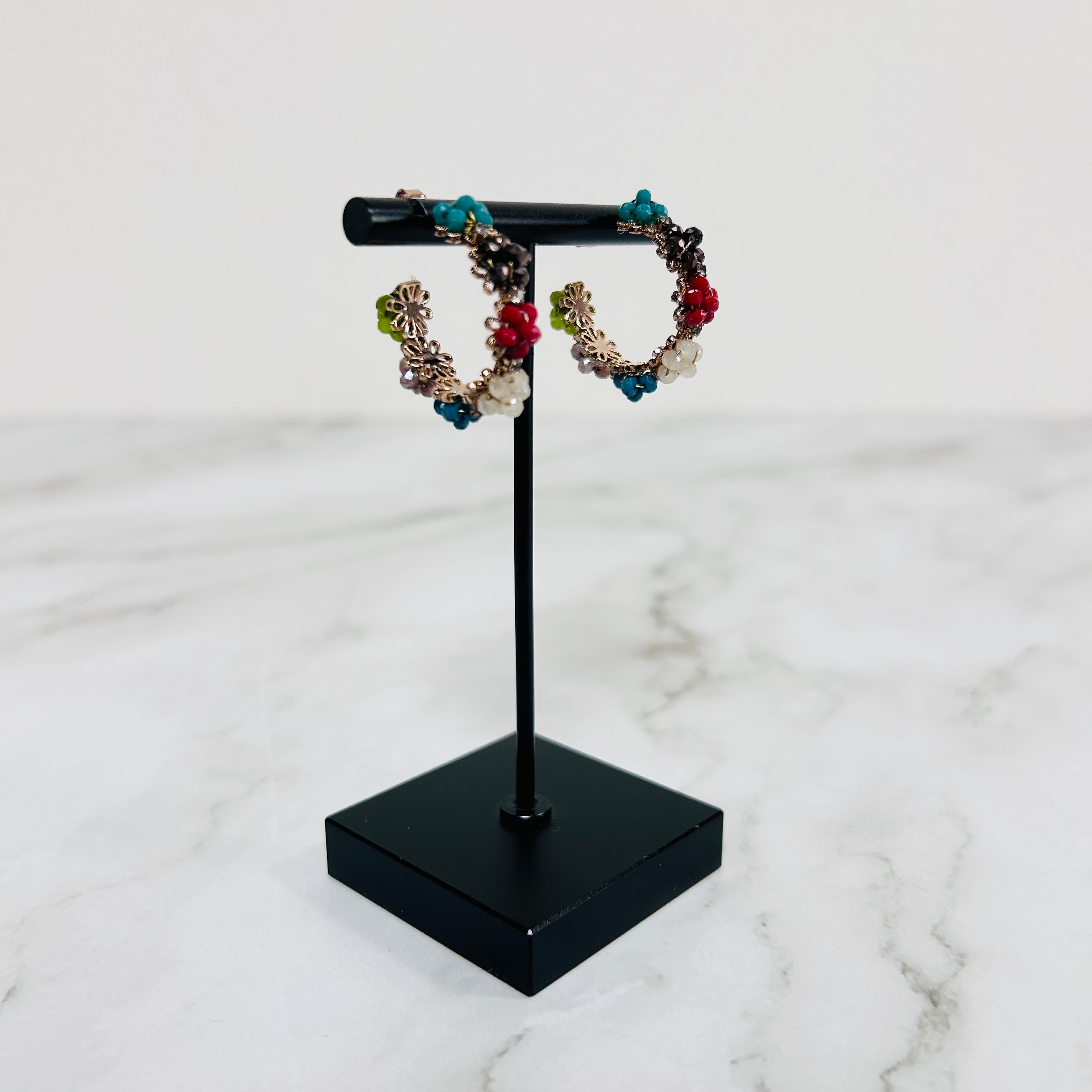 ローズゴールドのフープ全体に、お花のようにクリスタルカラービーズをあしらった、遊び心あふれるフープピアスです。