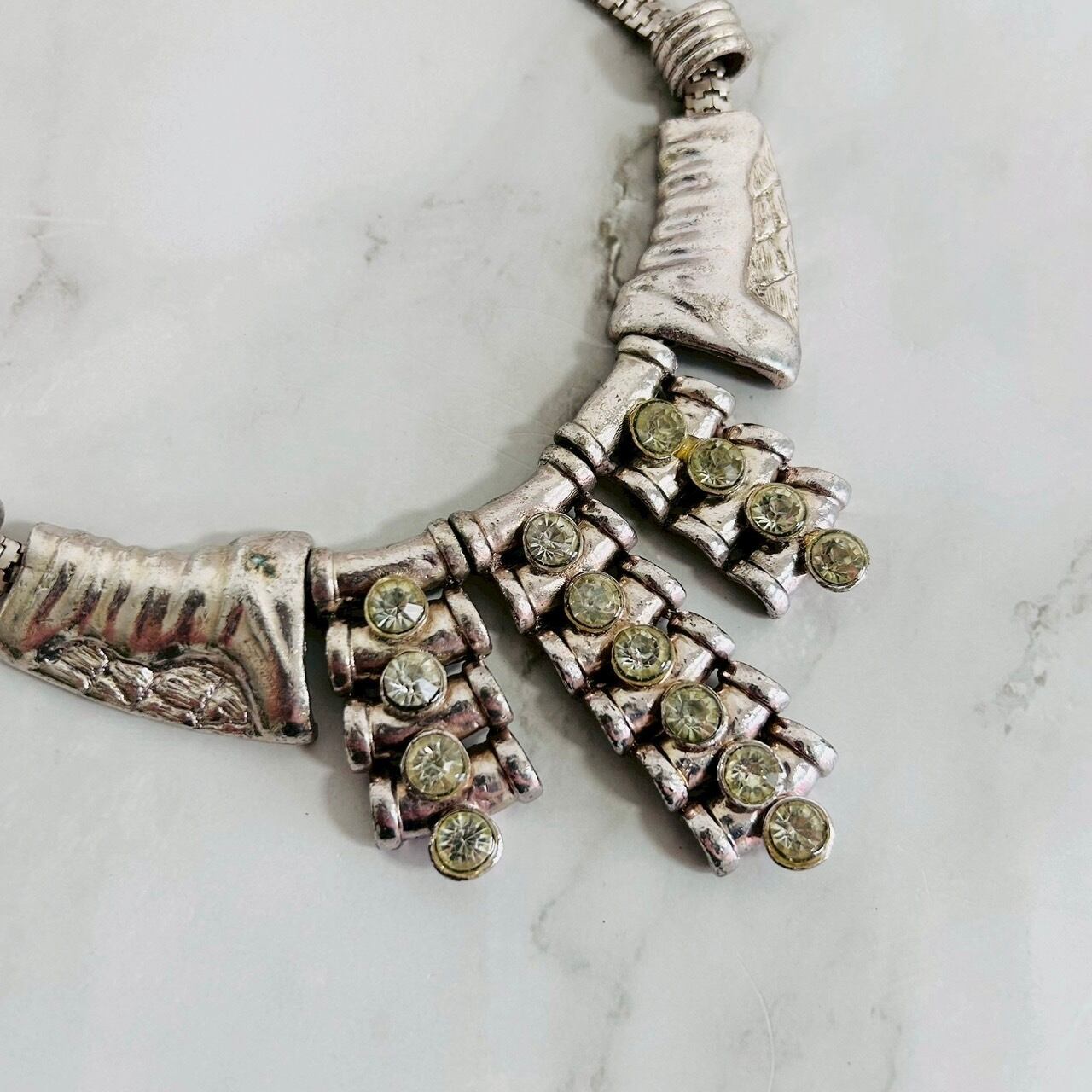 重厚感のあるメタルパーツと、クラシカルなカットが美しいライトイエローのクリスタルパーツを組み合わせた、アートオブジェのようなネックレスです。