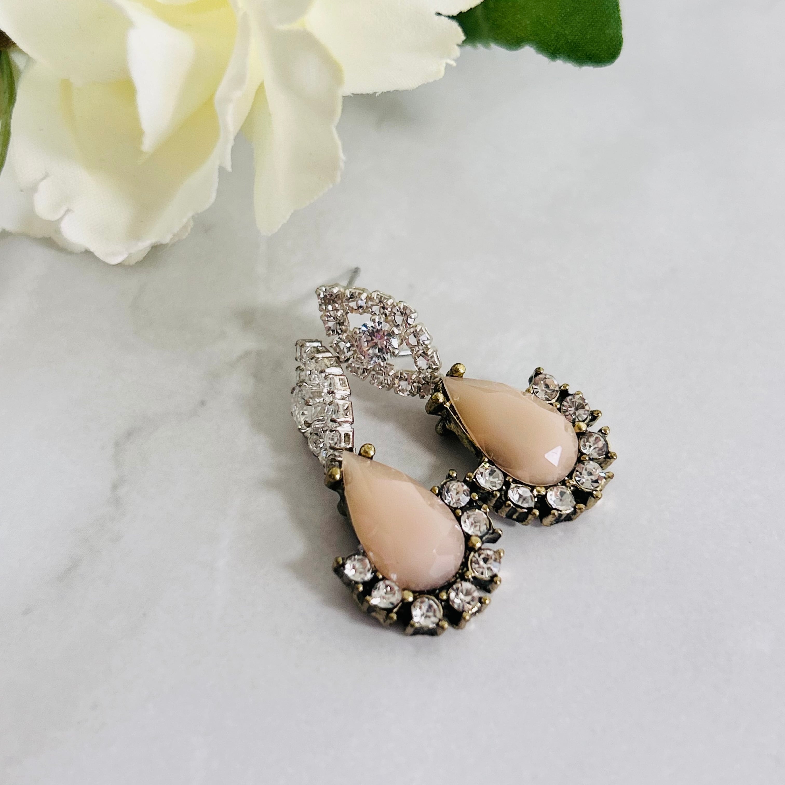 クリアビジューパーツを華やかにに敷きつめたトップに、上品なしずく型のベージュパーツを合わせた、エレガントなピアスです。