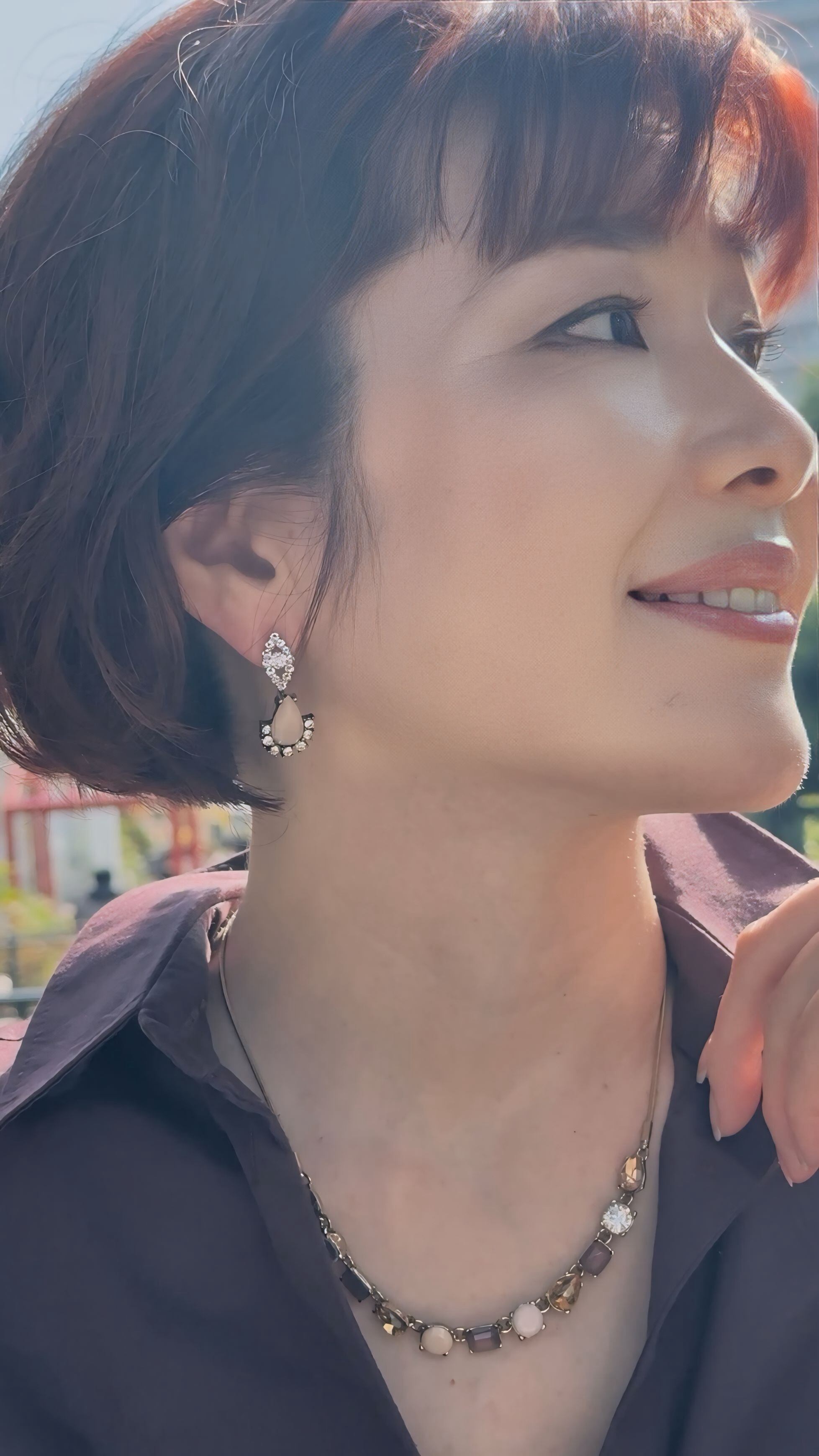 しずく型のストーンは柔らかな艶をまとったミルキーベージュで、お肌に優しく溶け込みながらも存在感のある美しさを添えています。