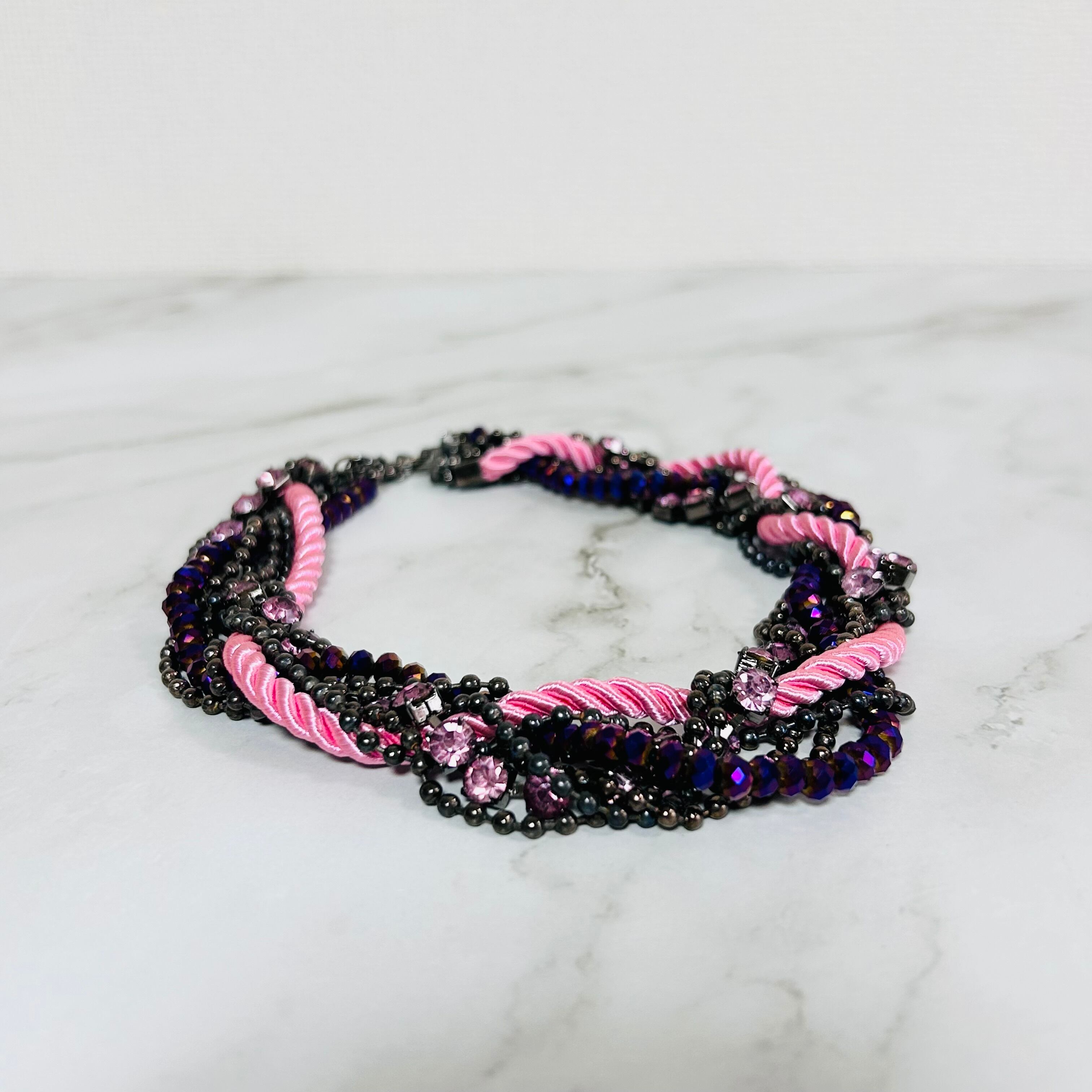 ツイストされたピンクロープが程よい甘さを添え、ブラックビーズや深みのあるビジューが全体を引き締めることで、可愛さだけに寄らない大人のバランスに。