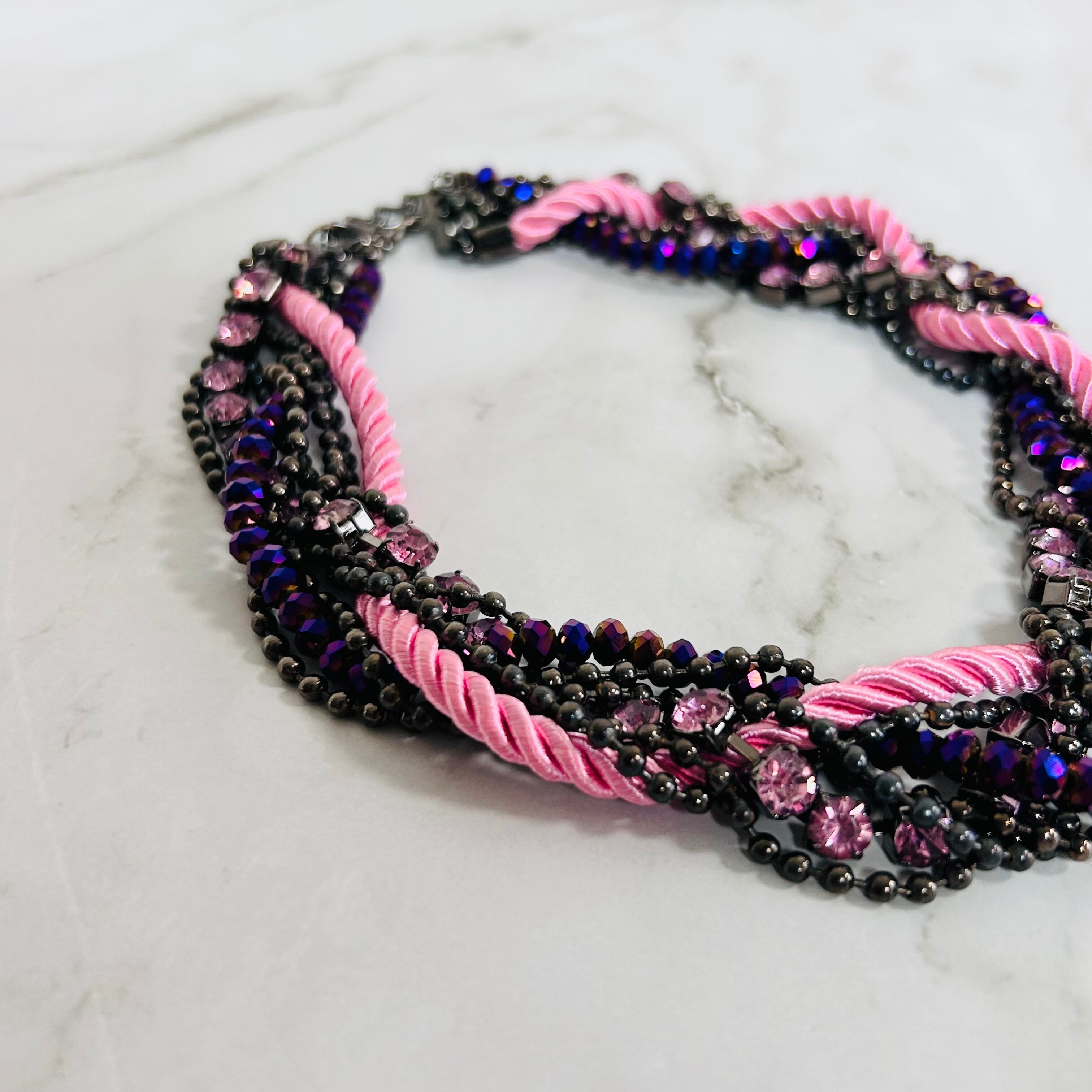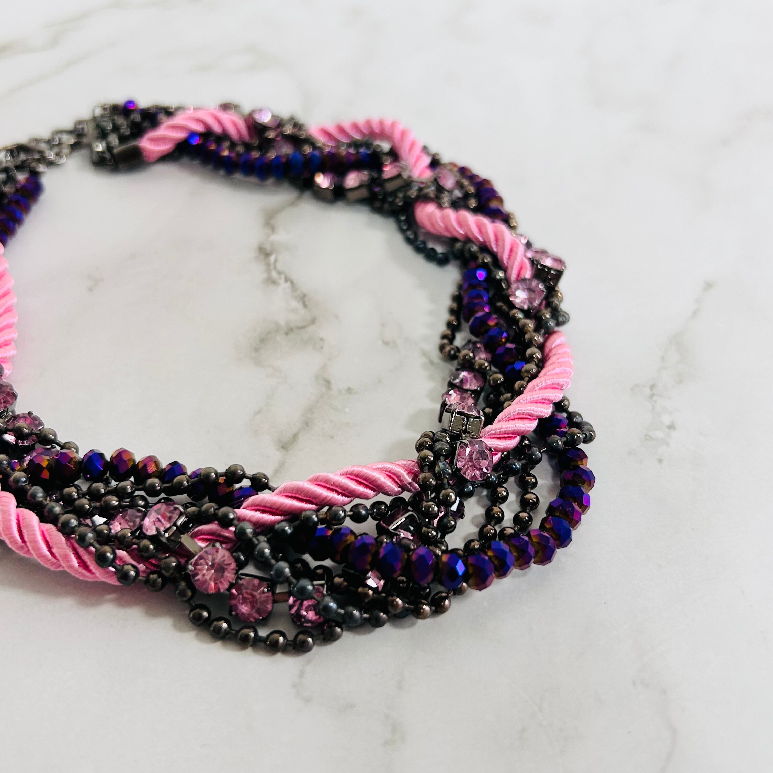 鮮やかなピンクのロープと、ブラックメタル、クリスタルビジューを幾重にも重ねた、印象的なデザインのネックレスです。