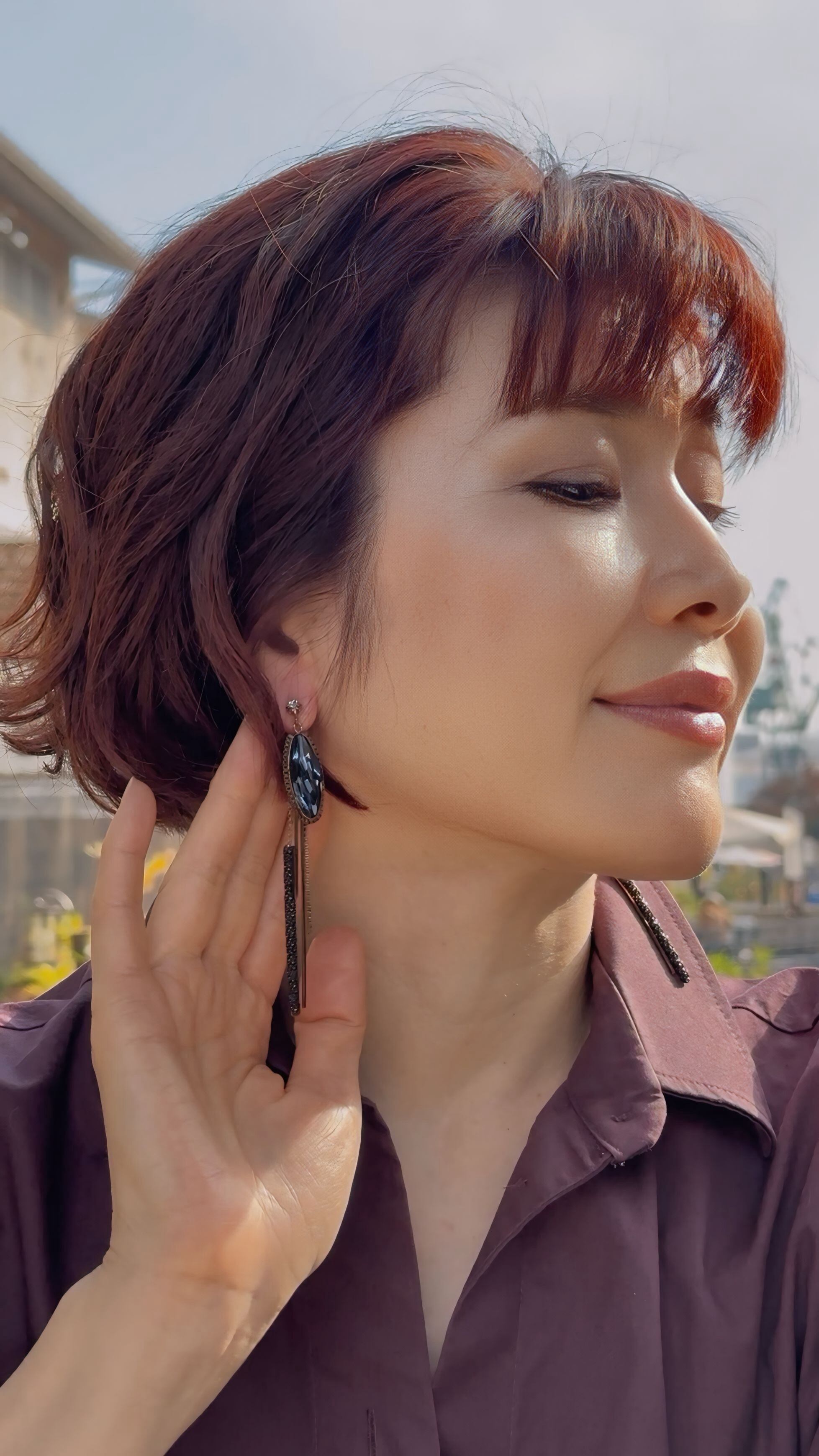 縦に流れるロングシルエットが、顔まわりをすっきりと美しく見せてくれます。