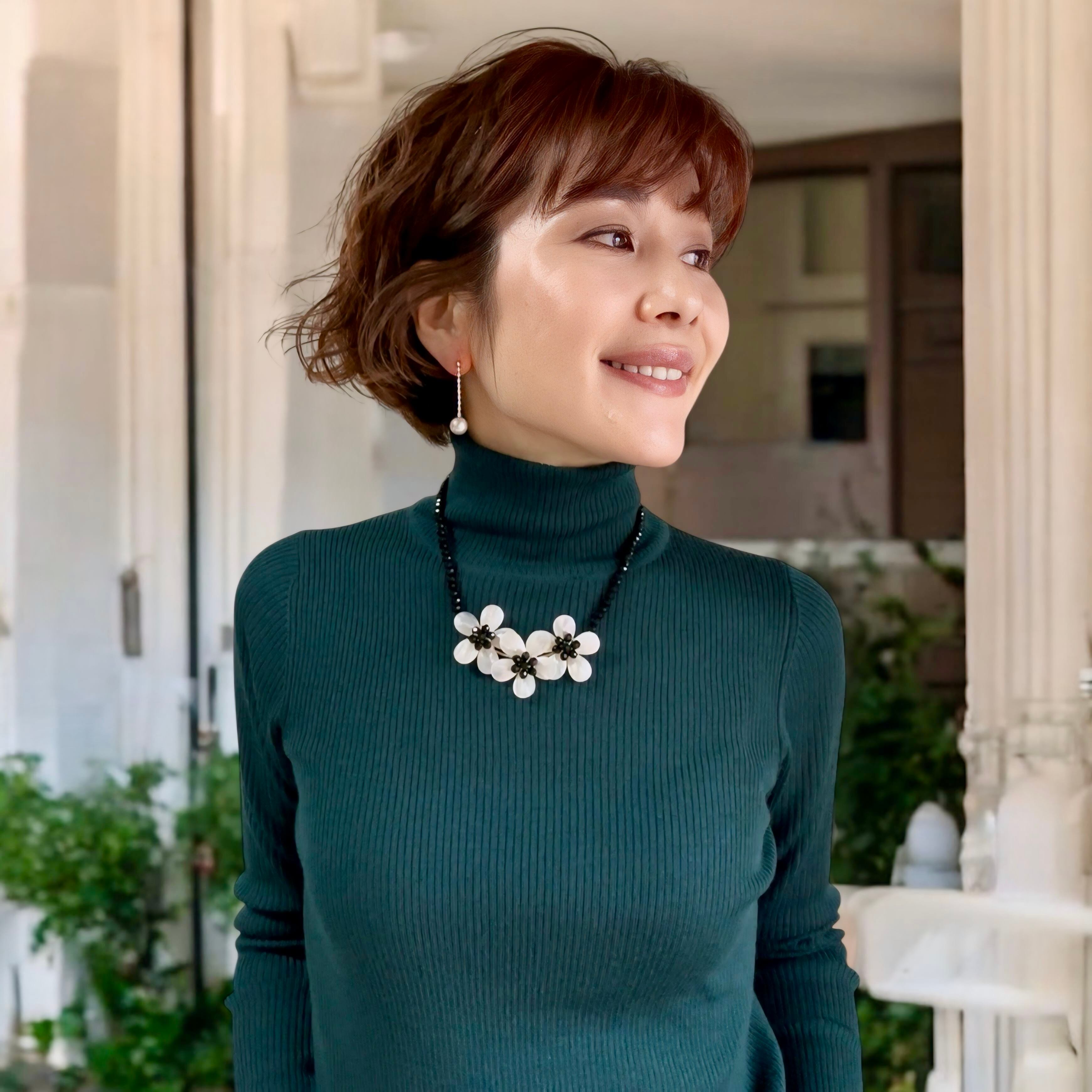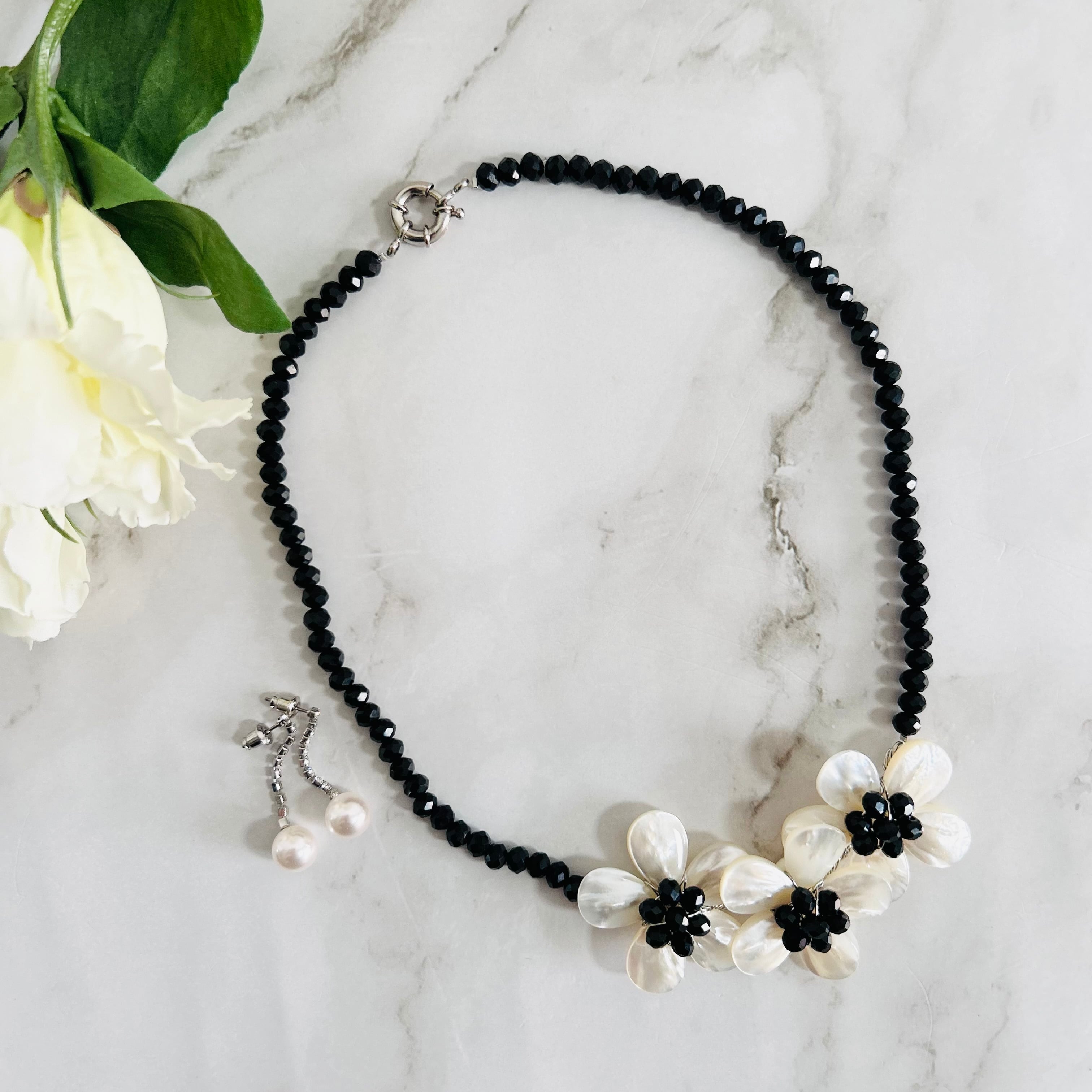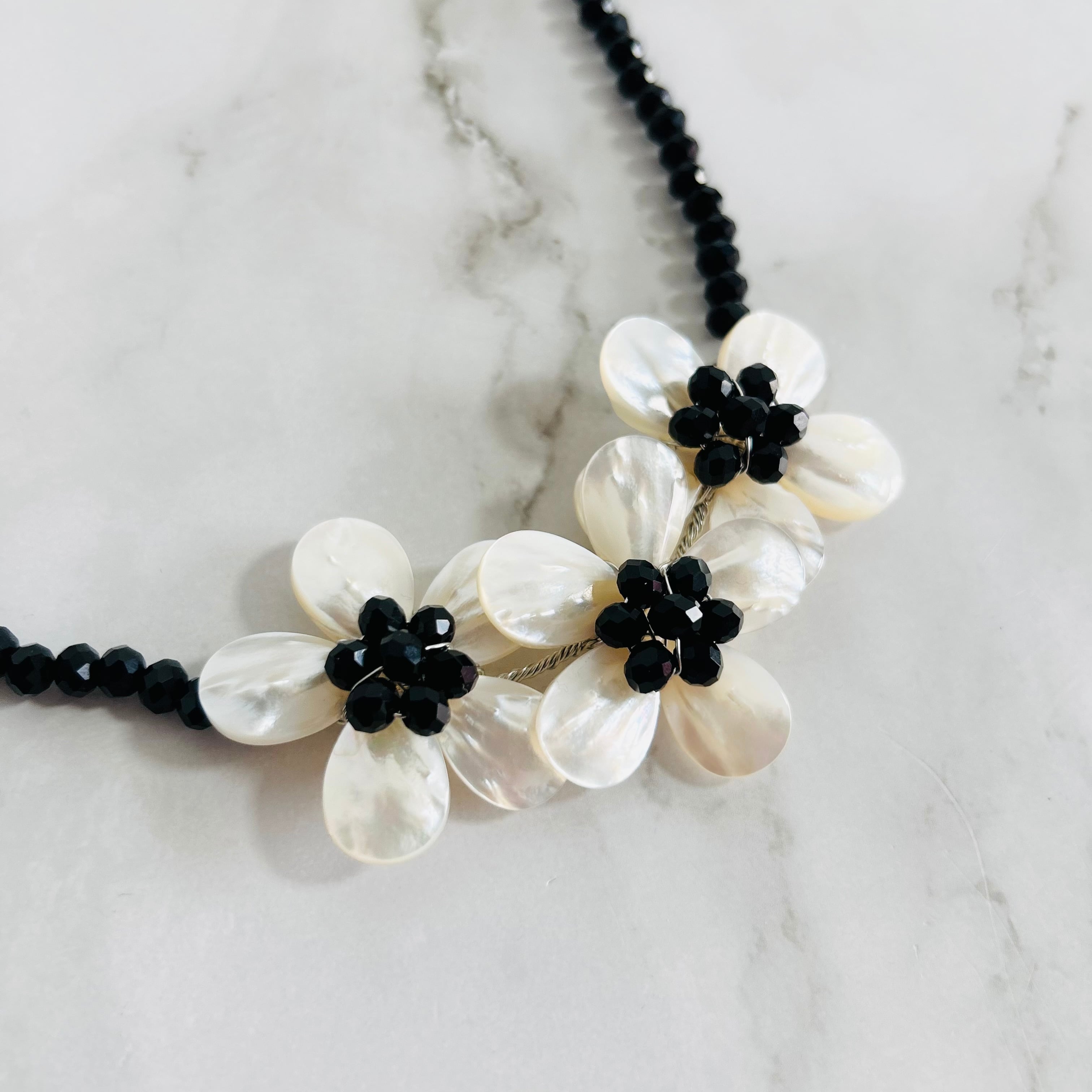 艶やかなブラックのチェコビーズに、シェルのフラワーモチーフをあしらった上品なネックレスです。