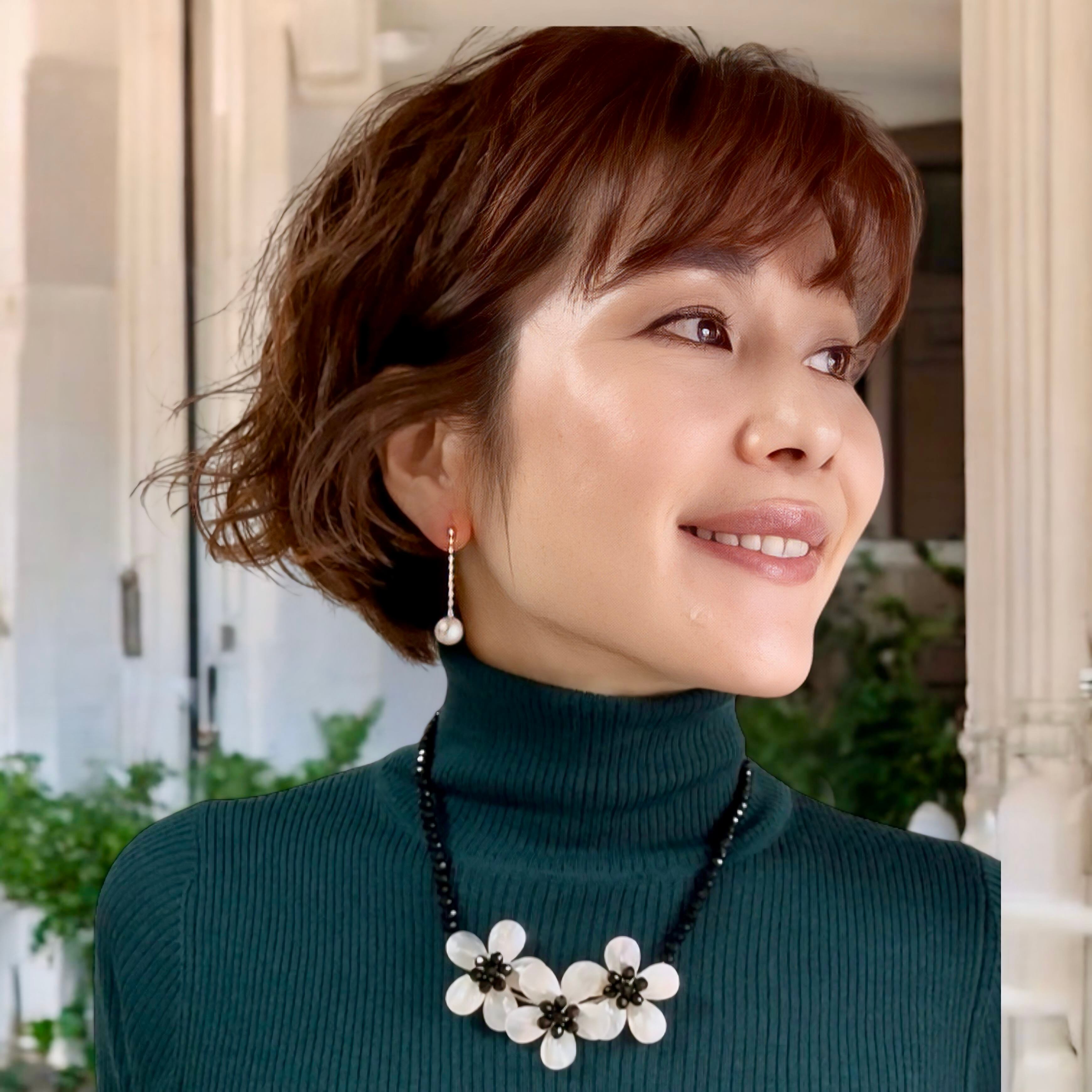 花びらには自然な光沢が美しいシェルを使用し、中央にはクリスタル素材のブラックビーズを添えて、甘さを抑えた大人のバランスに。