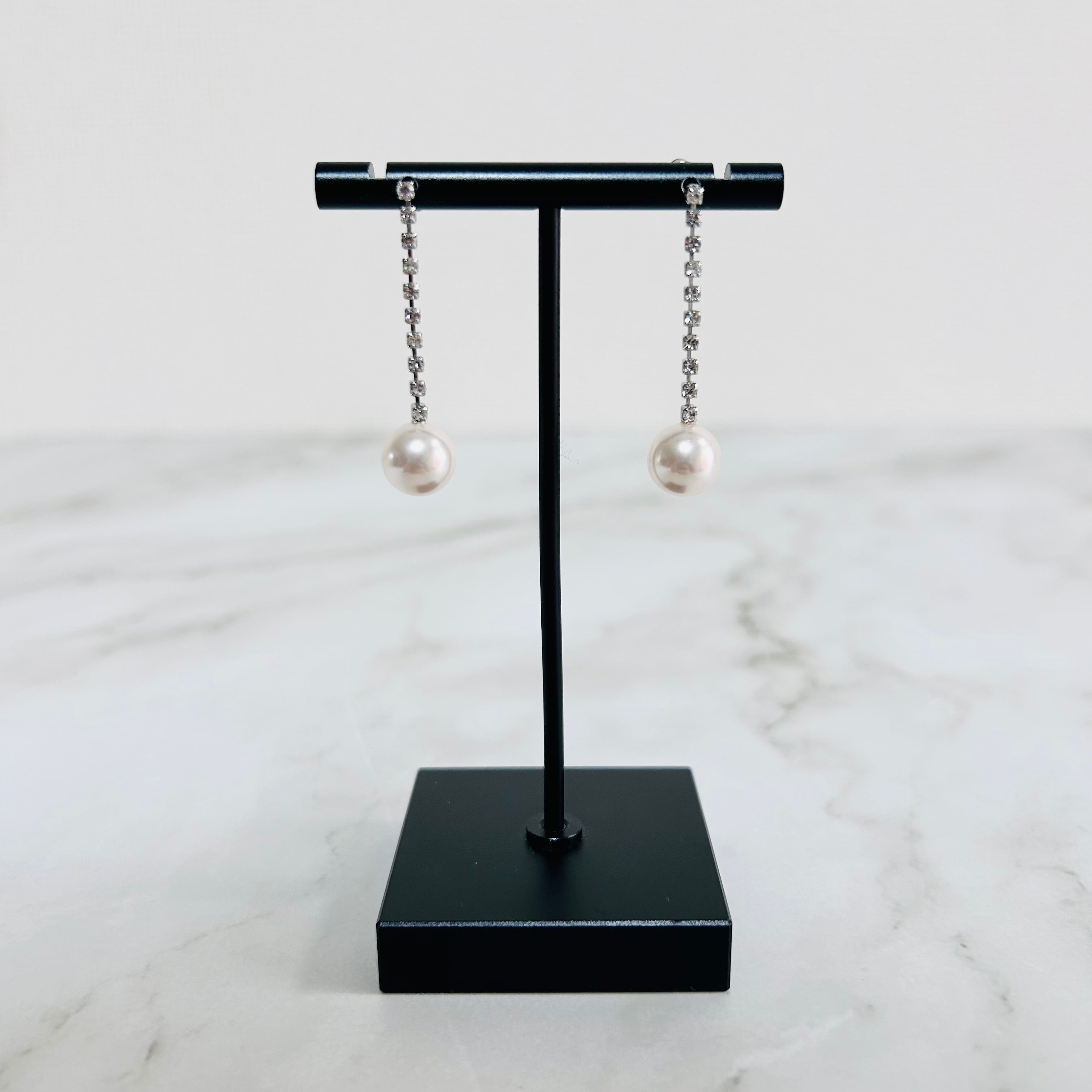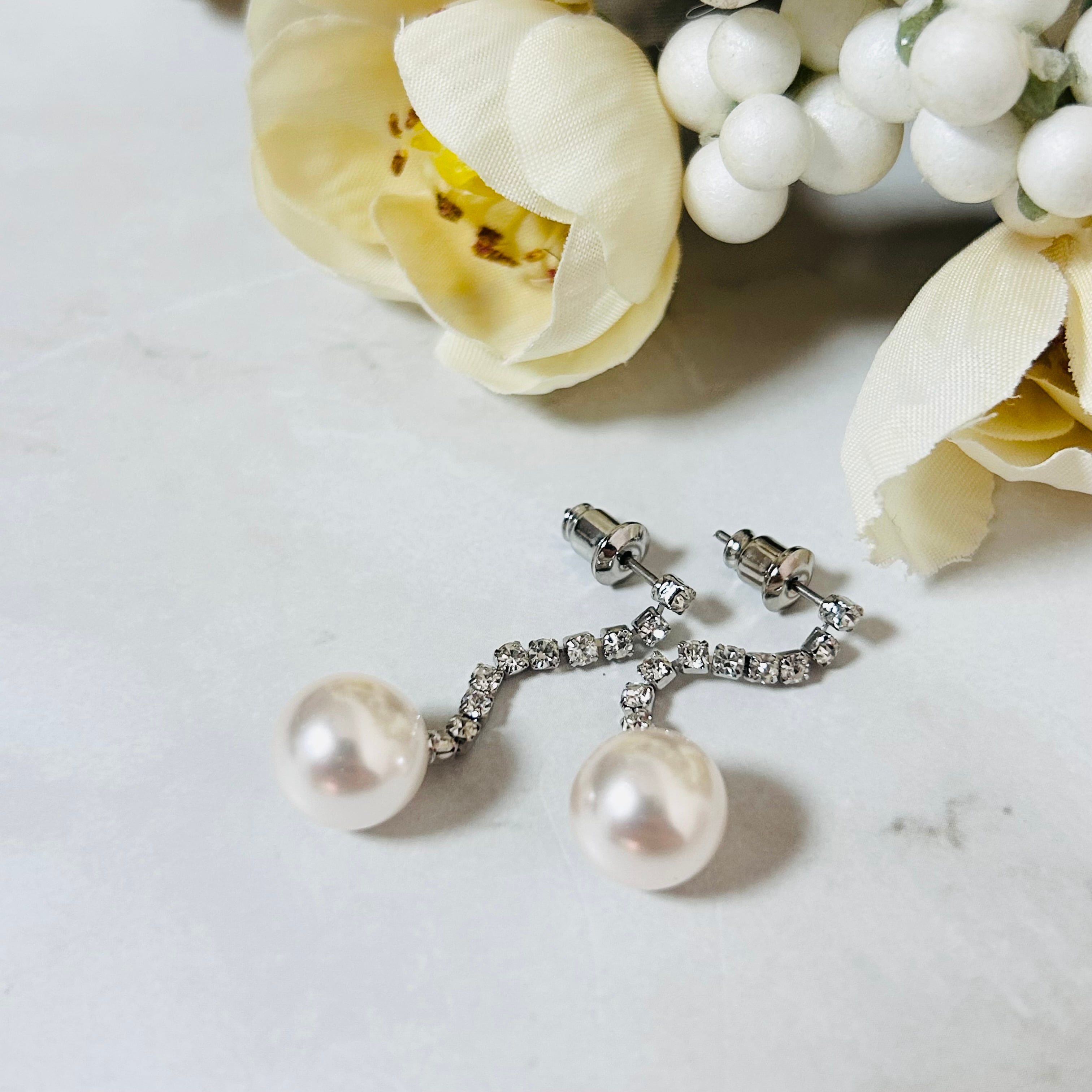 やわらかな光沢を放つパールに、繊細なクリスタルラインを添えたドロップピアス・イヤリングです。