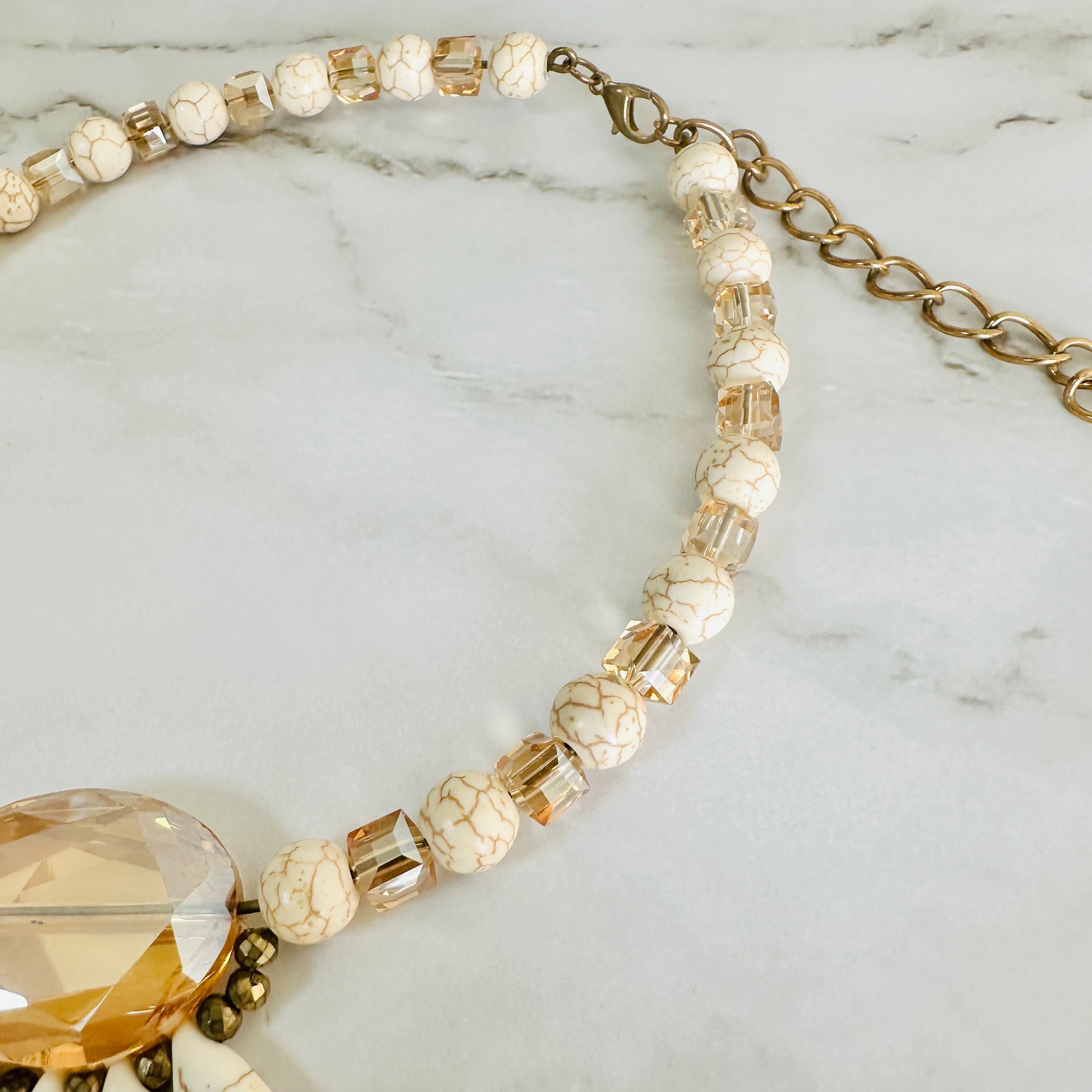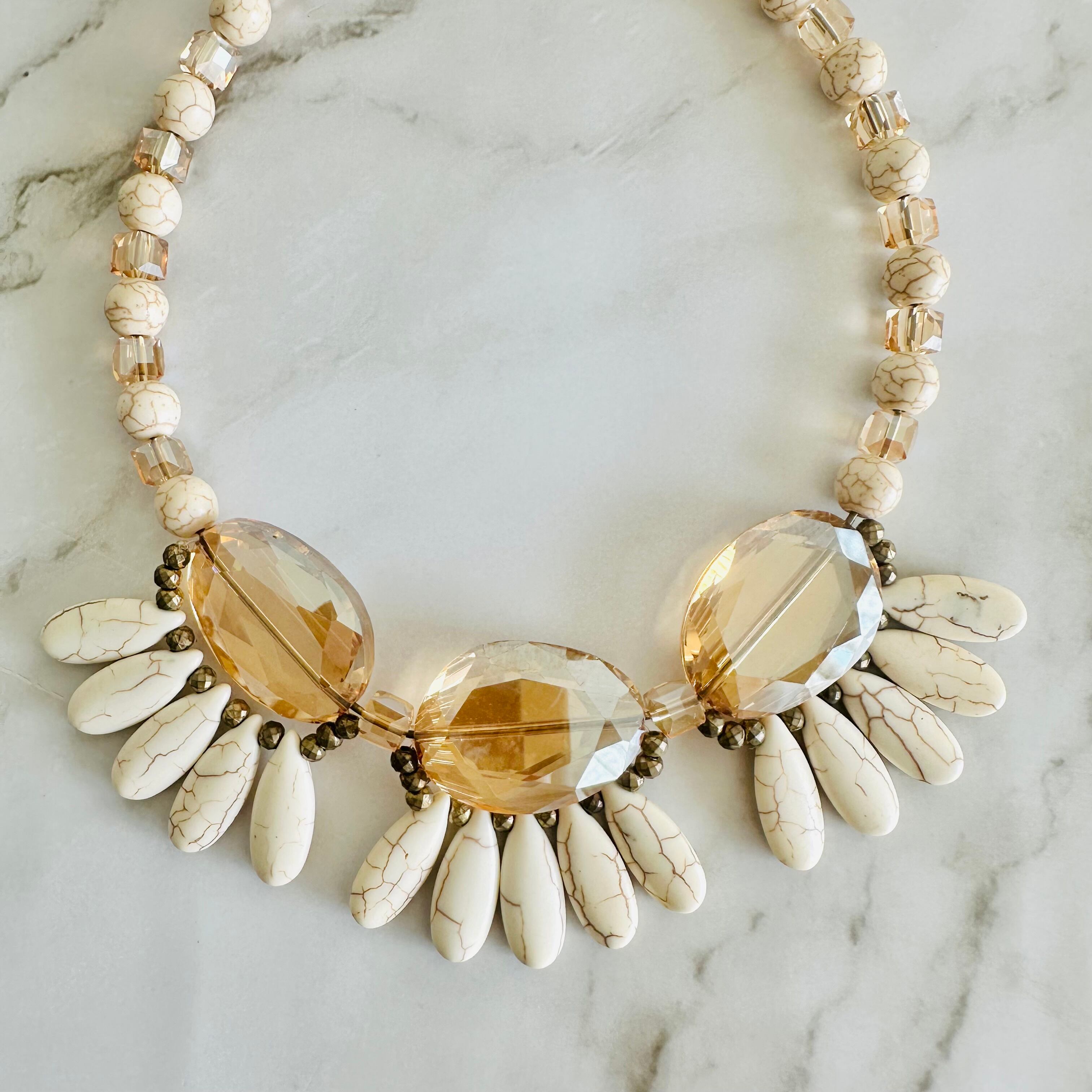 アイボリーカラーのストーンビーズに、やさしいシャンパンゴールドのクリスタルパーツを組み合わせたネックレスです。