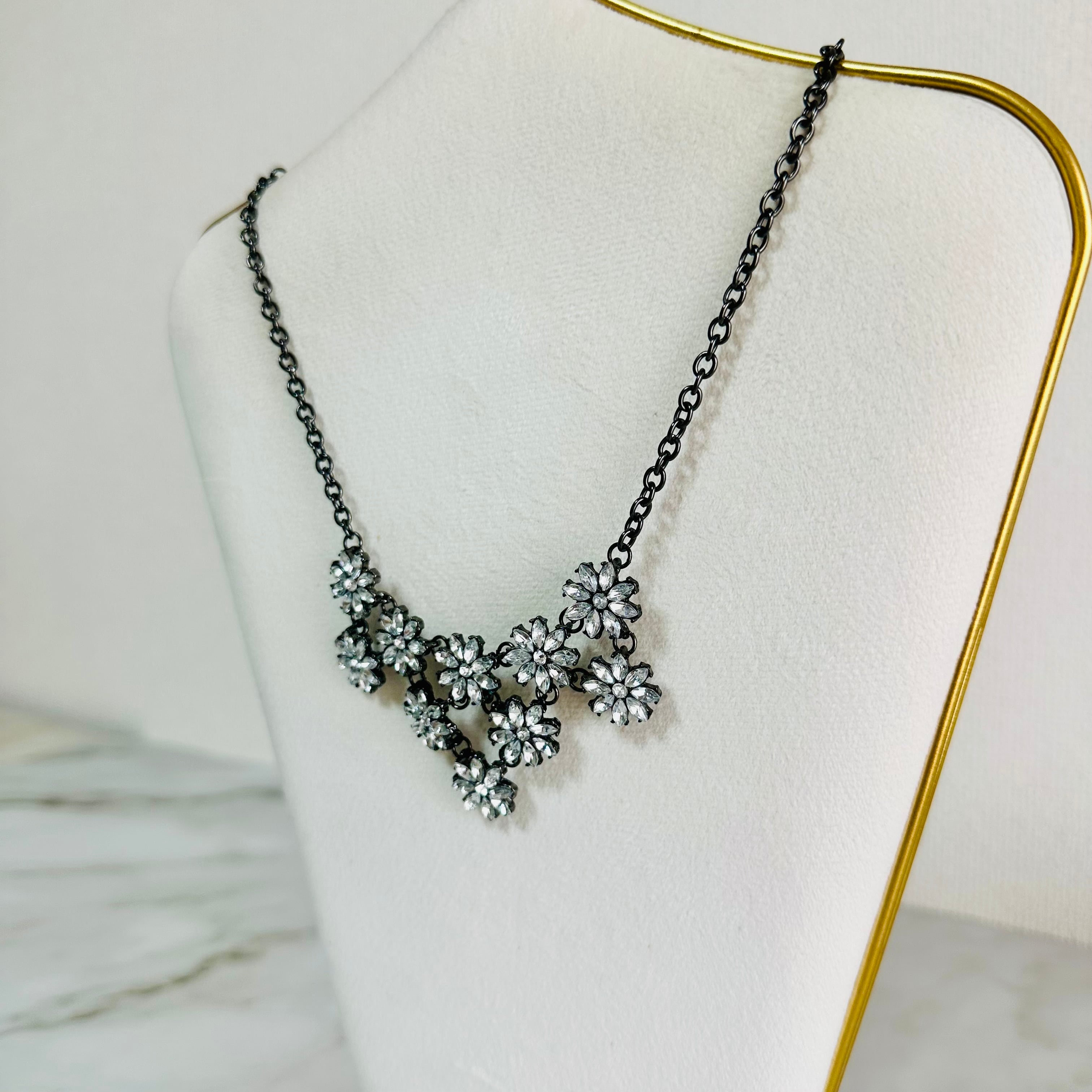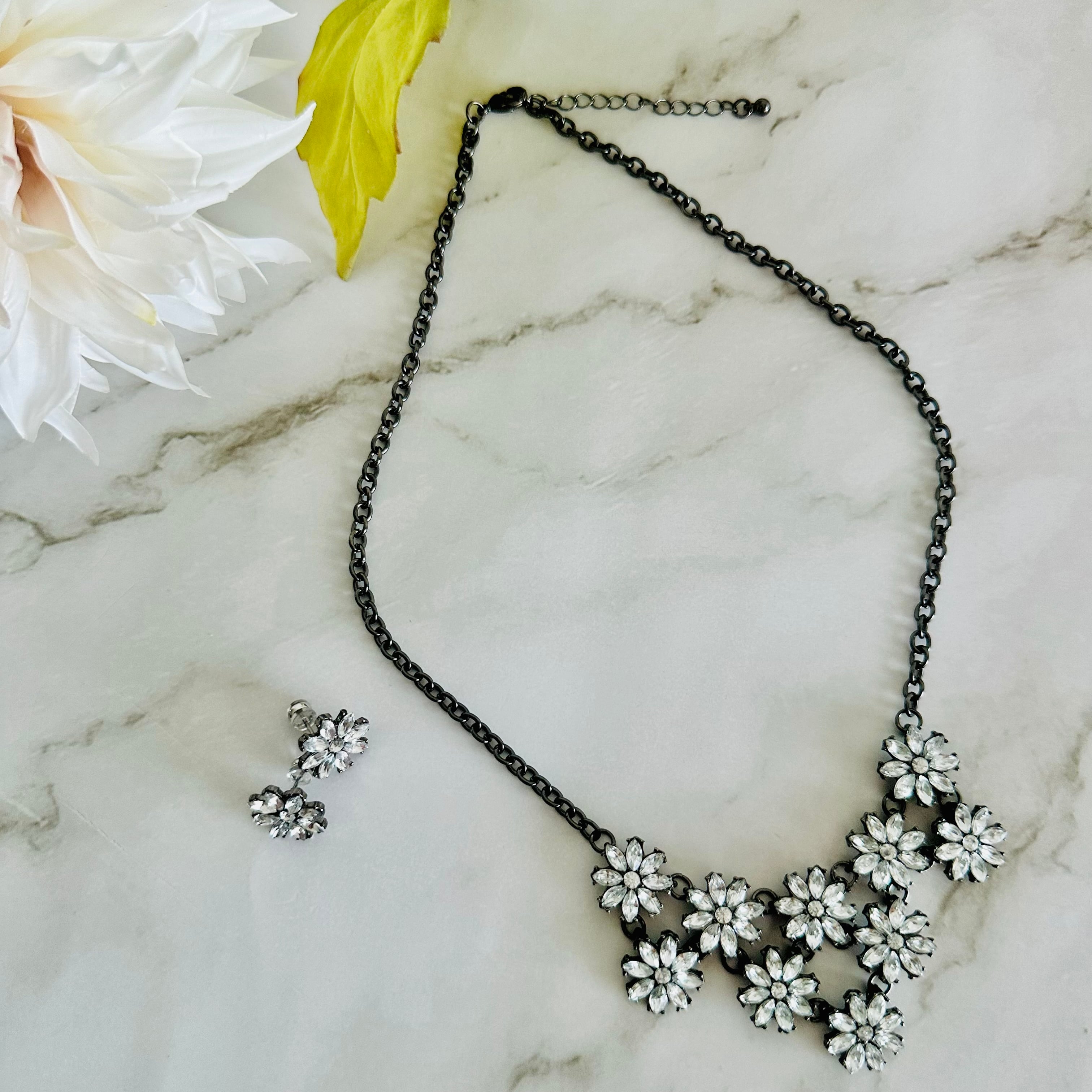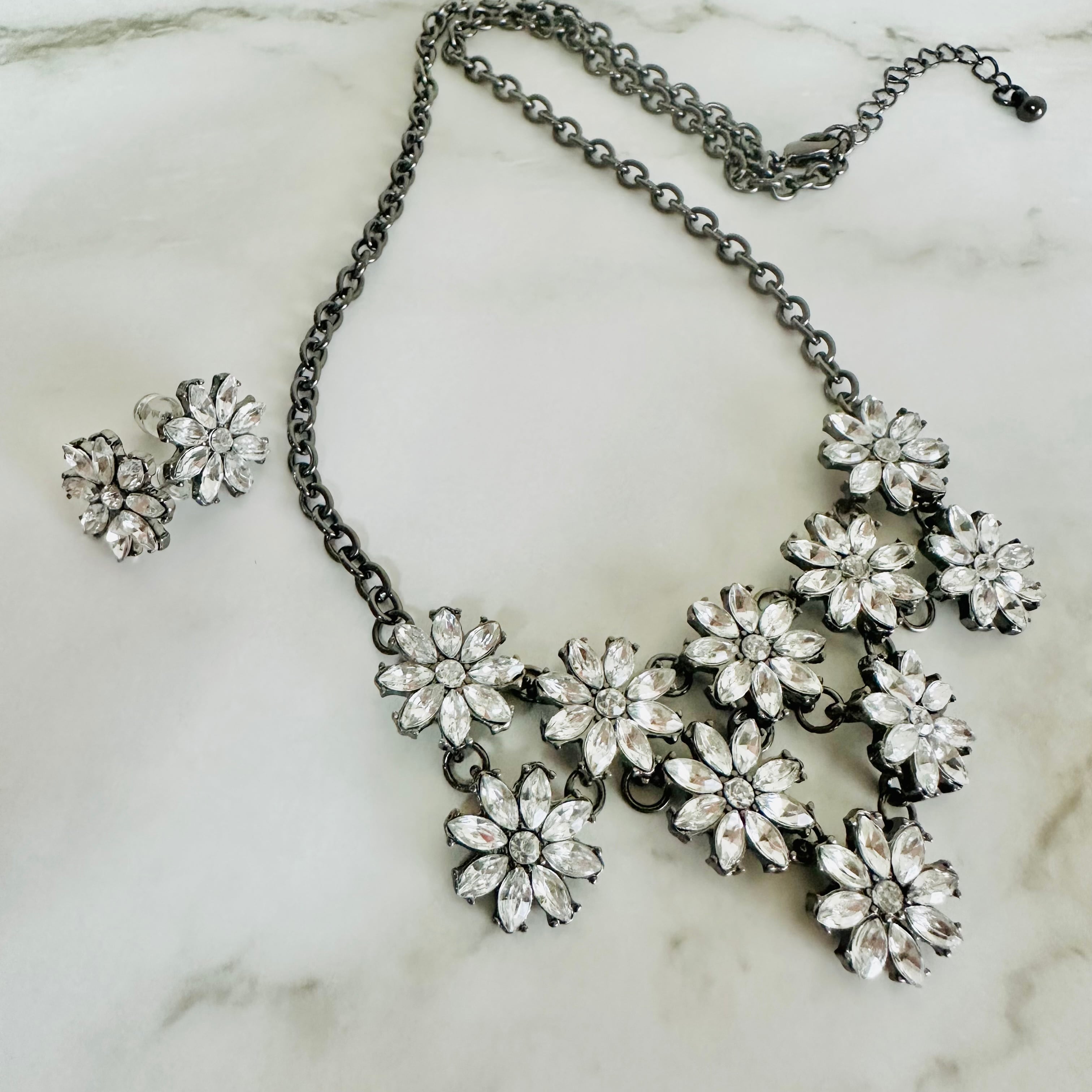クリアな輝きを放つフラワーモチーフを連ねた、ネックレスとピアス・イヤリングのセットです。