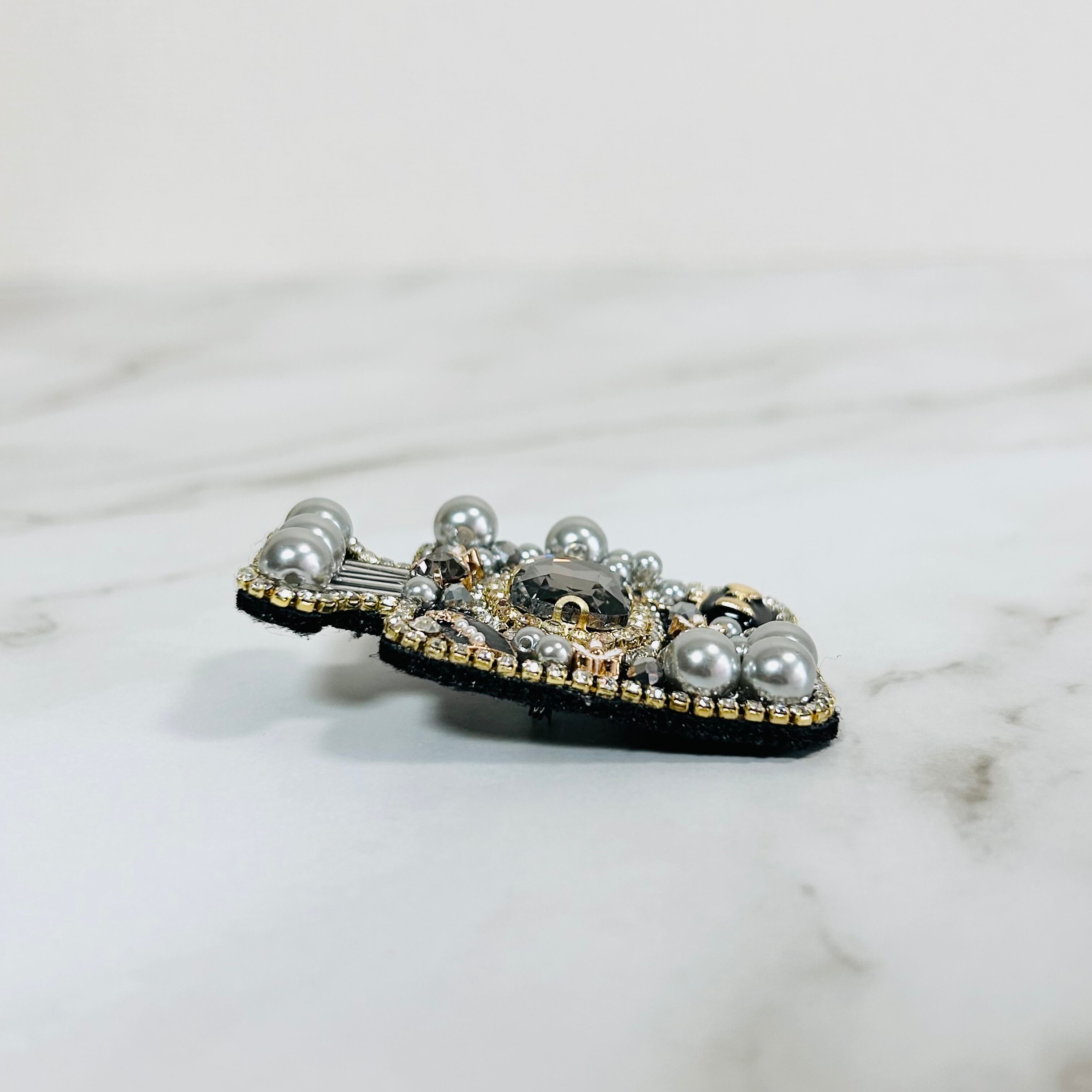 中央には深みのあるクリスタルを配し、そのまわりをパールやビジューで華やかに縁取った、立体感のあるデザインです。